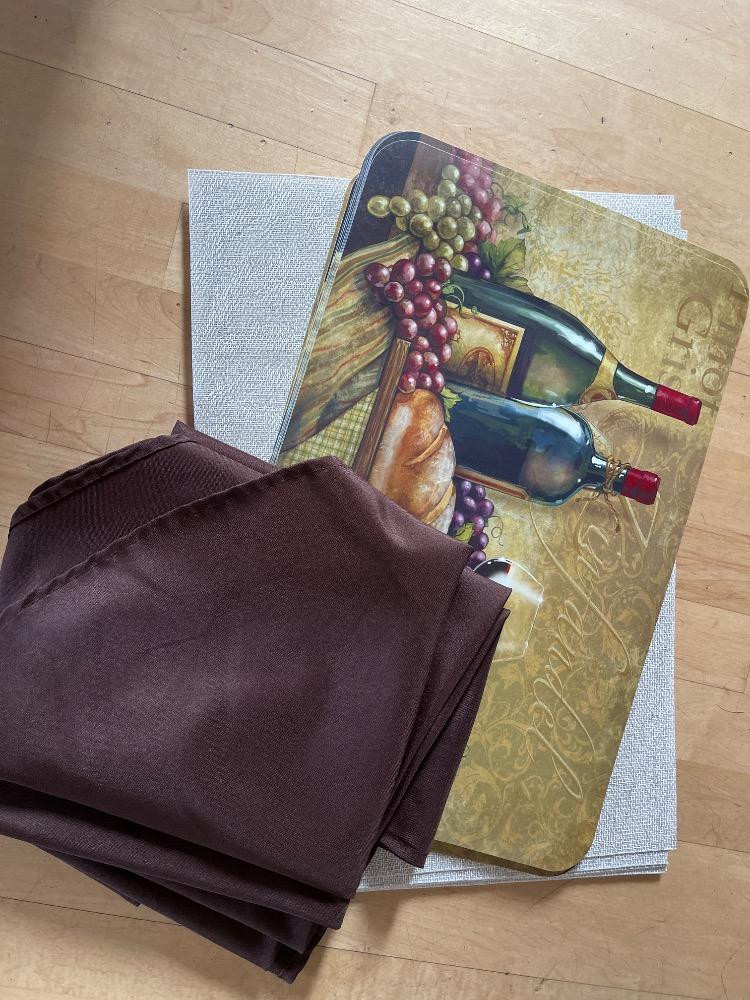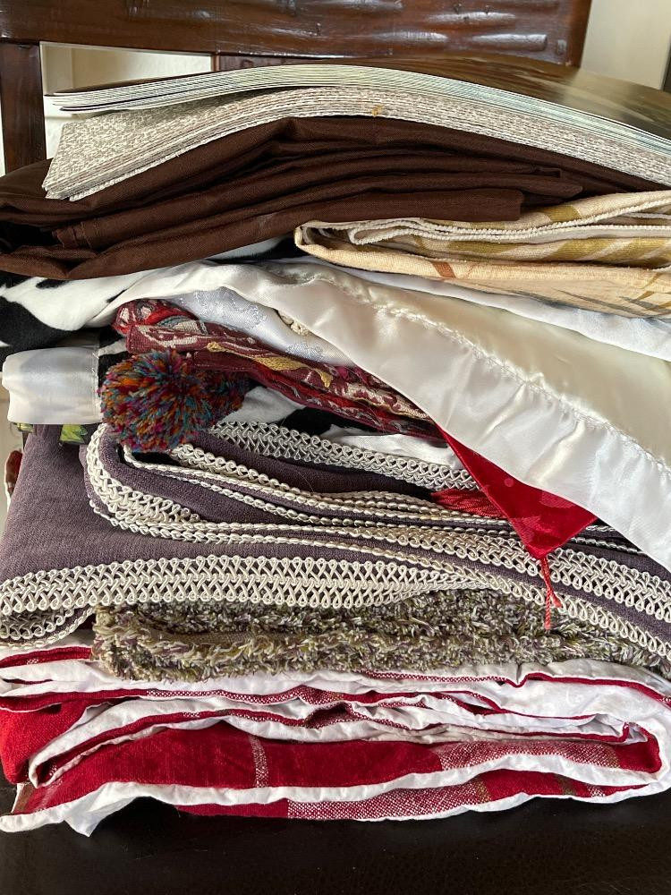 Table Runners Placemats and Cloths Many tablecloths, runners and placemats. Plaid, purple, brown, zebra stripe and others.