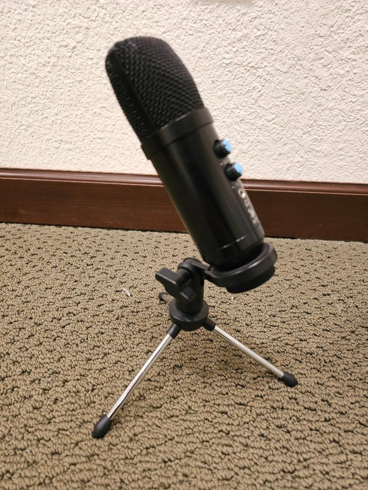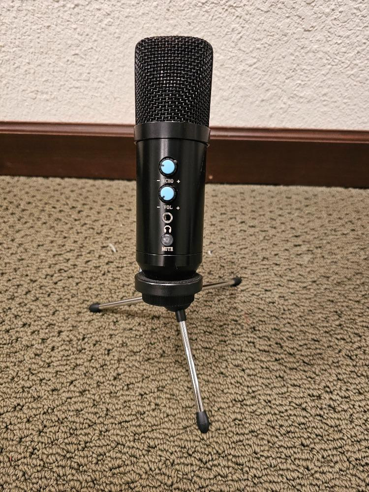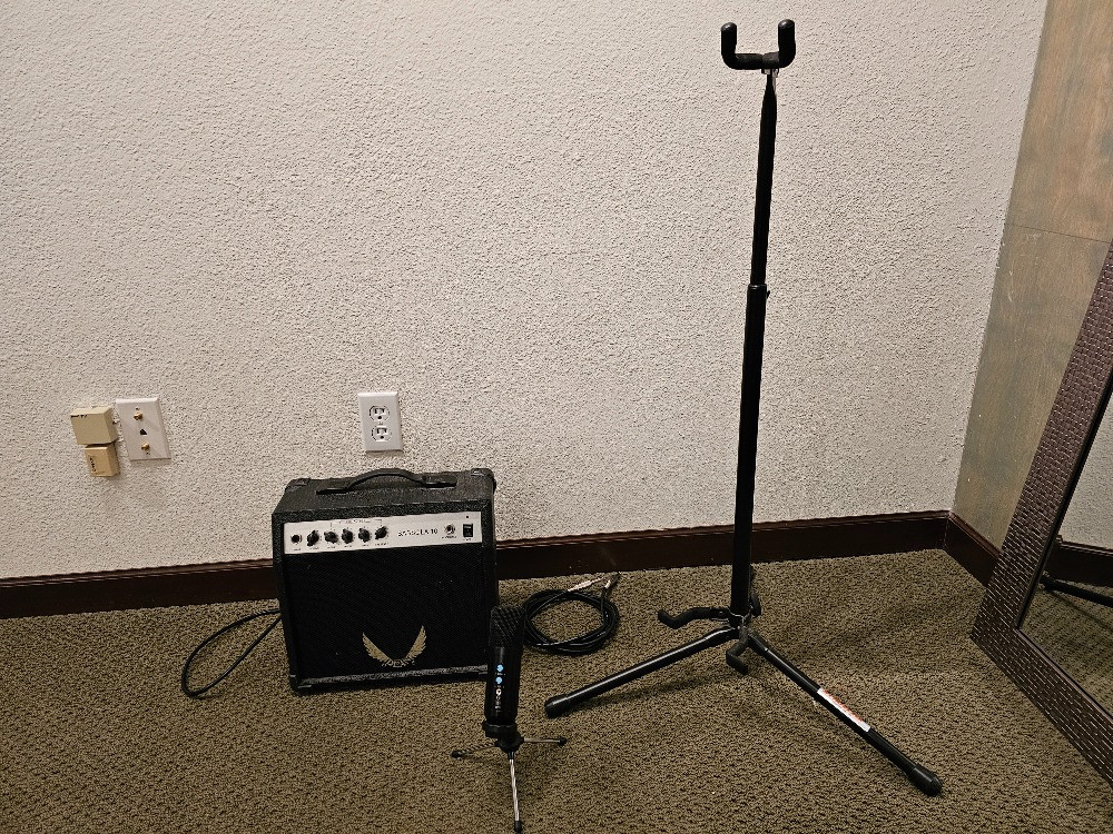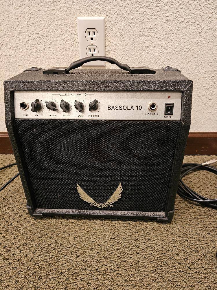 Dean Bassola 10 Guitar Amp, Microphone & Stageline Guitar Stand Dean Bassola 10 Guitar Amplifier 10W practice amplifier with headphones jack and 1/4" audio cable Tested - Powers On Unknown USB condenser microphone - no cable included Untested Stageline telescoping guitar stand
