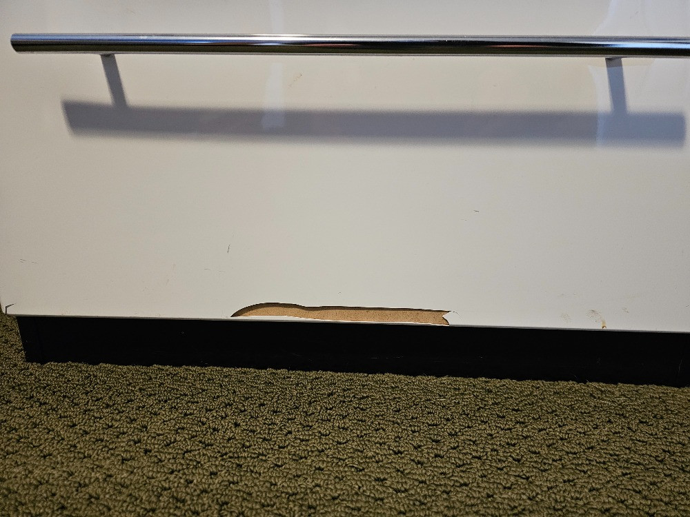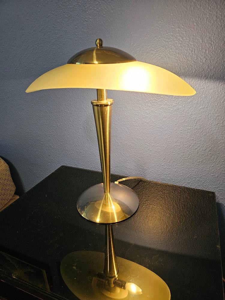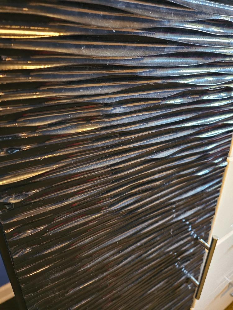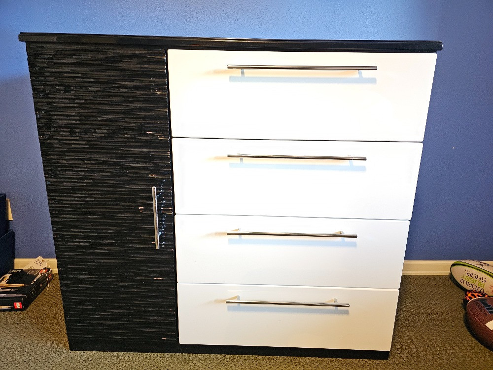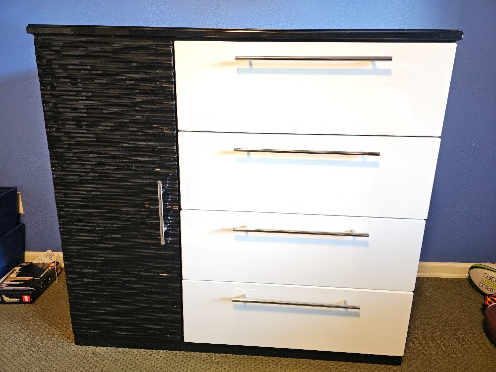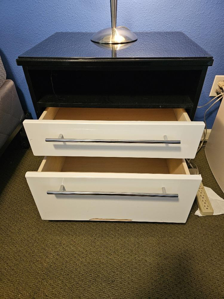 Modern Dresser, Matching Nightstand & Touchlamp Dresser & nightstand are shiny black with white drawers with chrome hardware Modern glass-top dresser with 3-shelf cabinet and 4 drawers. 42.5"T x 46"W x 19.5"D Modern glass-top nighstand (minor damage to bottom drawer front - see pics) 23.5"T x 23"W x 17.5"D Brushed silver 3-way touchlamp (1 bulb needs to be replaced) 17.5"T x 16.5"W x 7"D Tested - Works