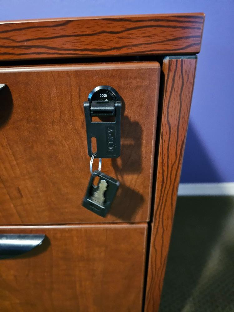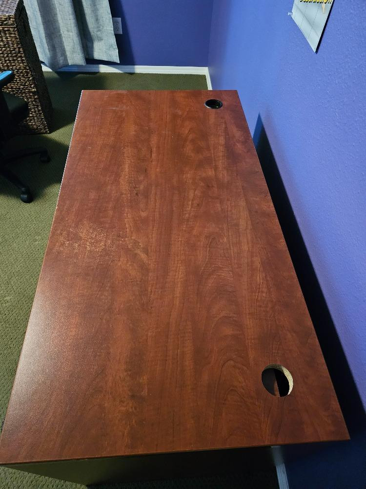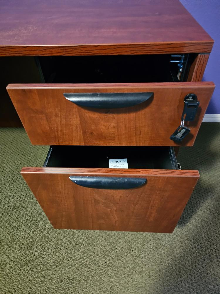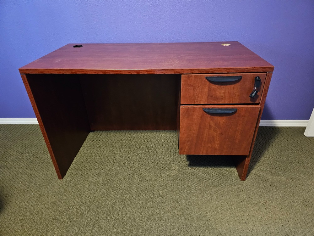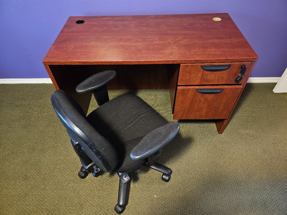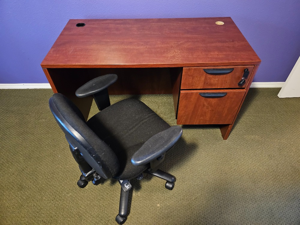 Two Drawer Desk & Office Chair Cherry color veneered desk with two drawers. Top drawer locks and includes 2 keys (desk has some wear to the finish on top) 29"T x 47"W x 24"D Black cloth adjustable rolling office chair (could use a cleaning) 31"T x 26"W x 22"D Both in good used condition