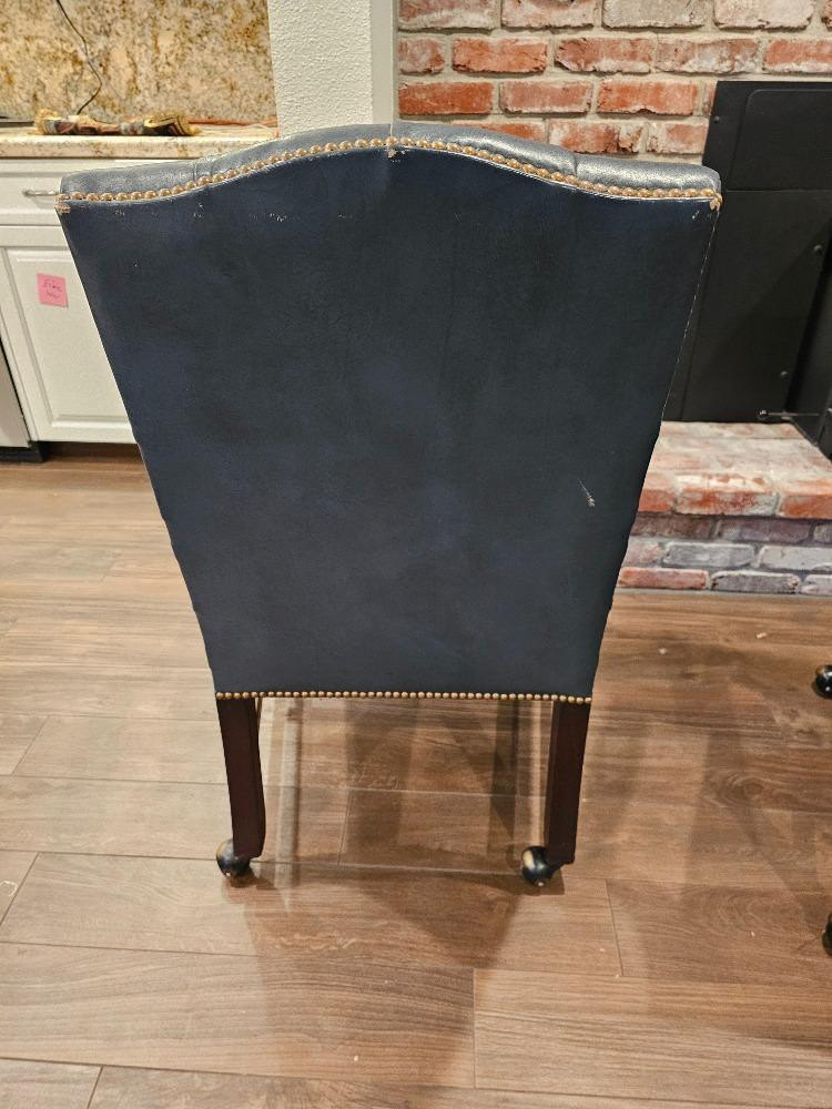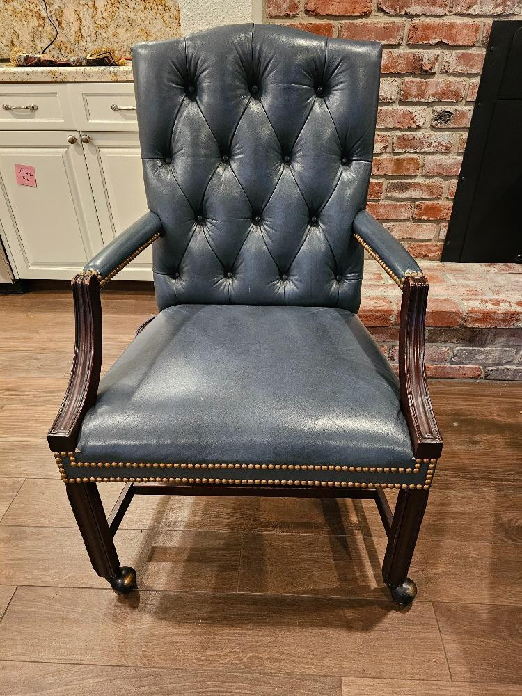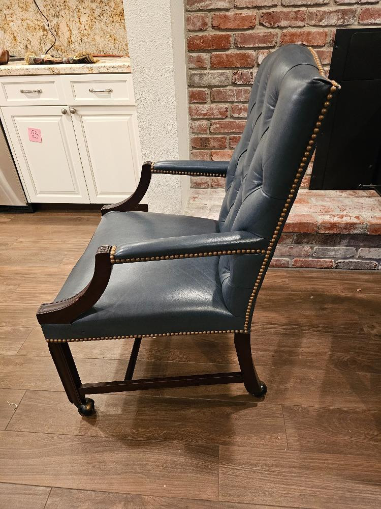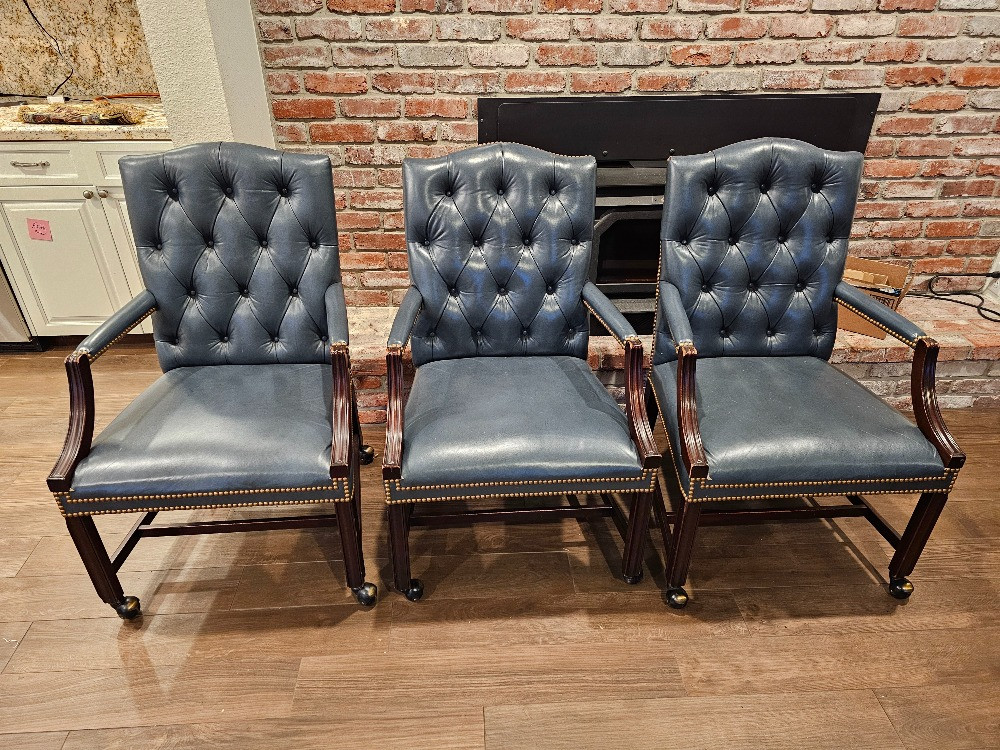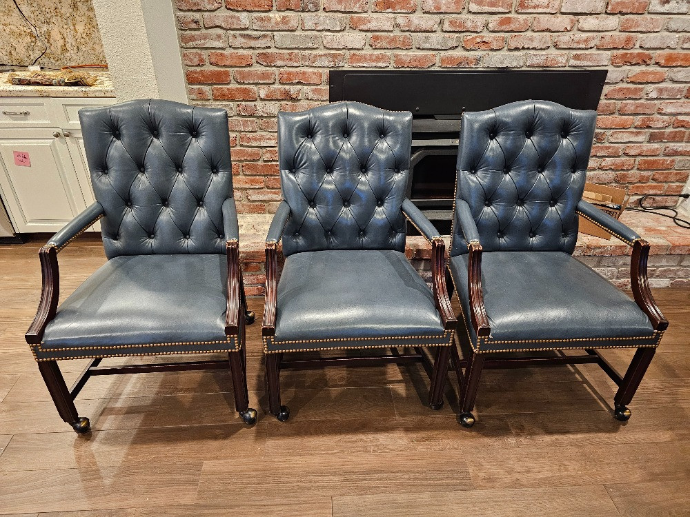 (3) Rolling Oxford Blue Leather Tufted Arm Chairs Kindel Furniture Company of Grand Rapids, Michigan in 1984 Some rub marks and some seam splits consistent with 41 years of wear Nice condition & comfortable chairs!