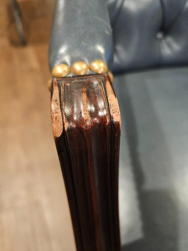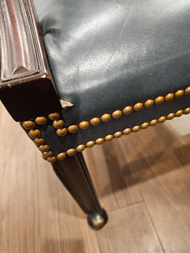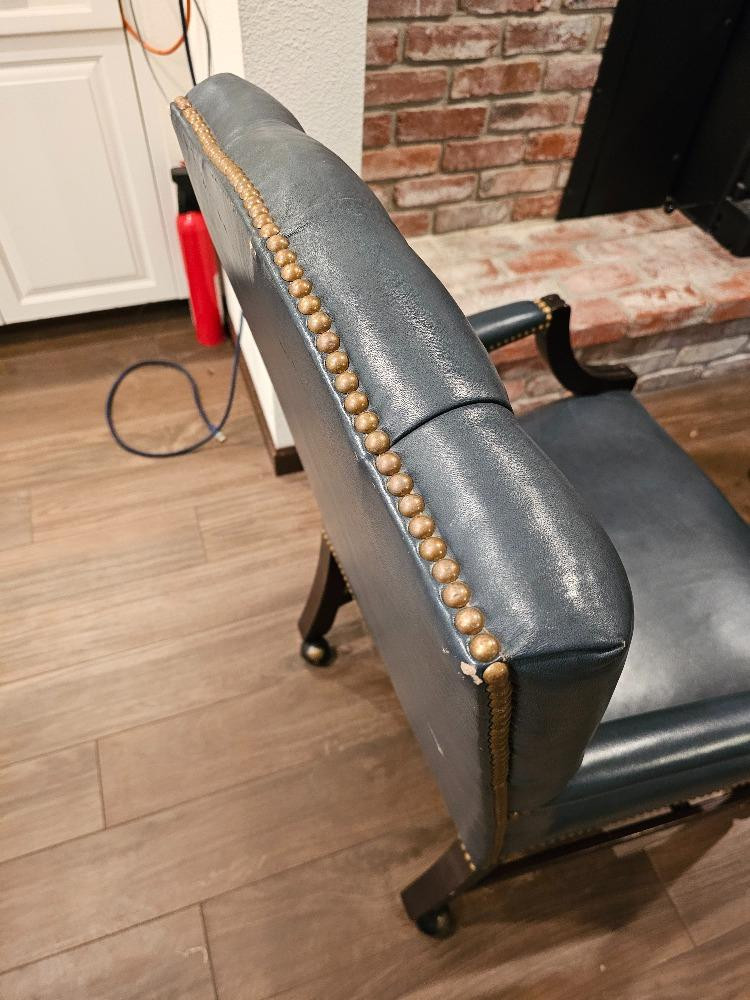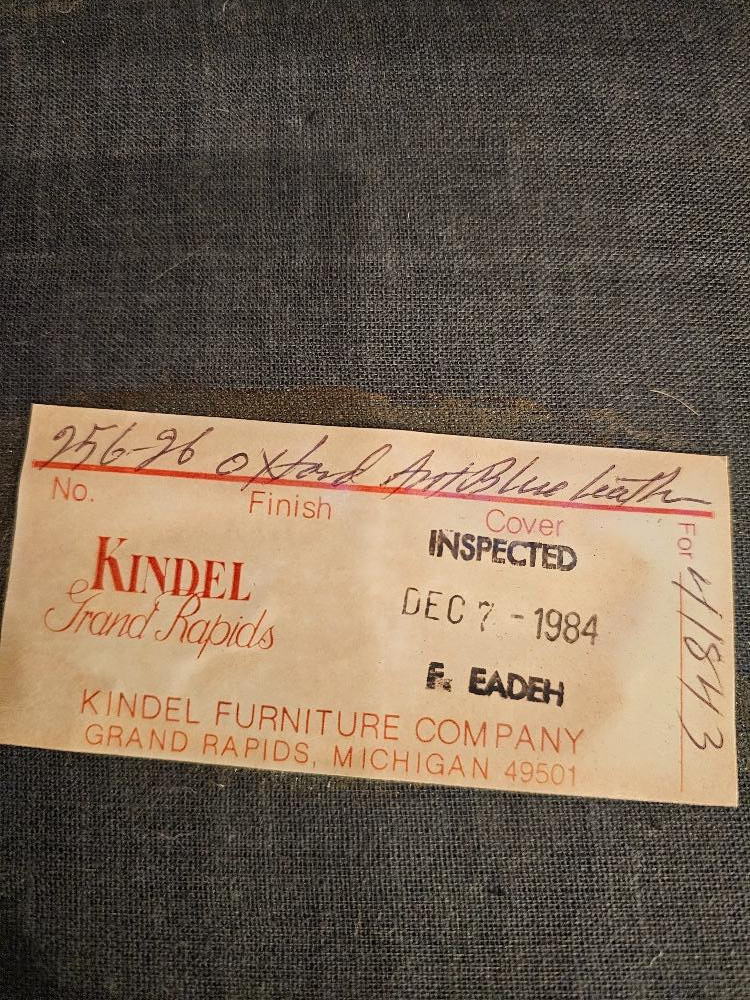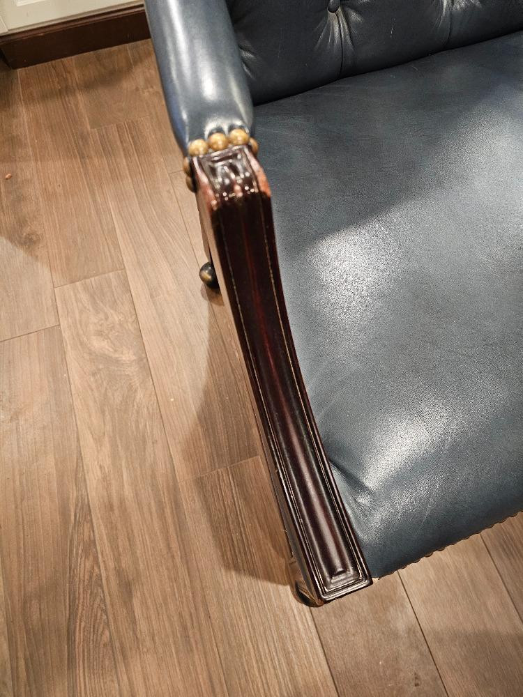 (3) Rolling Oxford Blue Leather Tufted Arm Chairs Kindel Furniture Company of Grand Rapids, Michigan in 1984 Some rub marks and some seam splits consistent with 41 years of wear Nice condition & comfortable chairs!