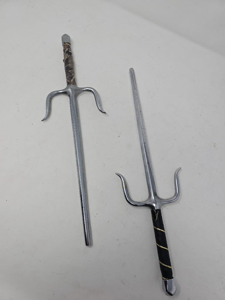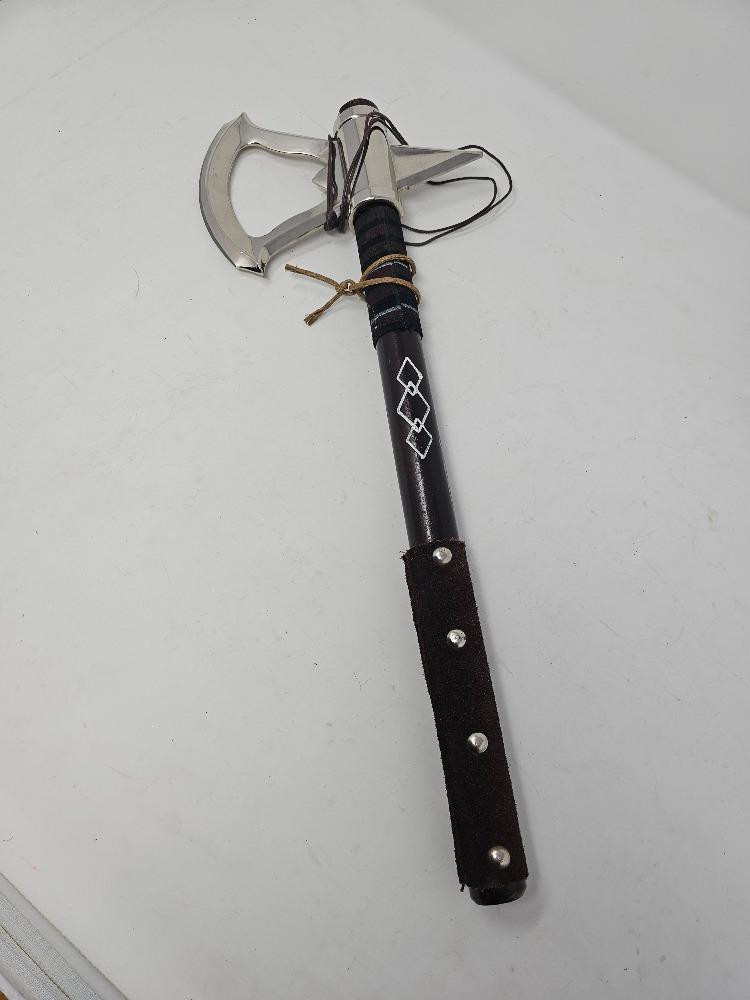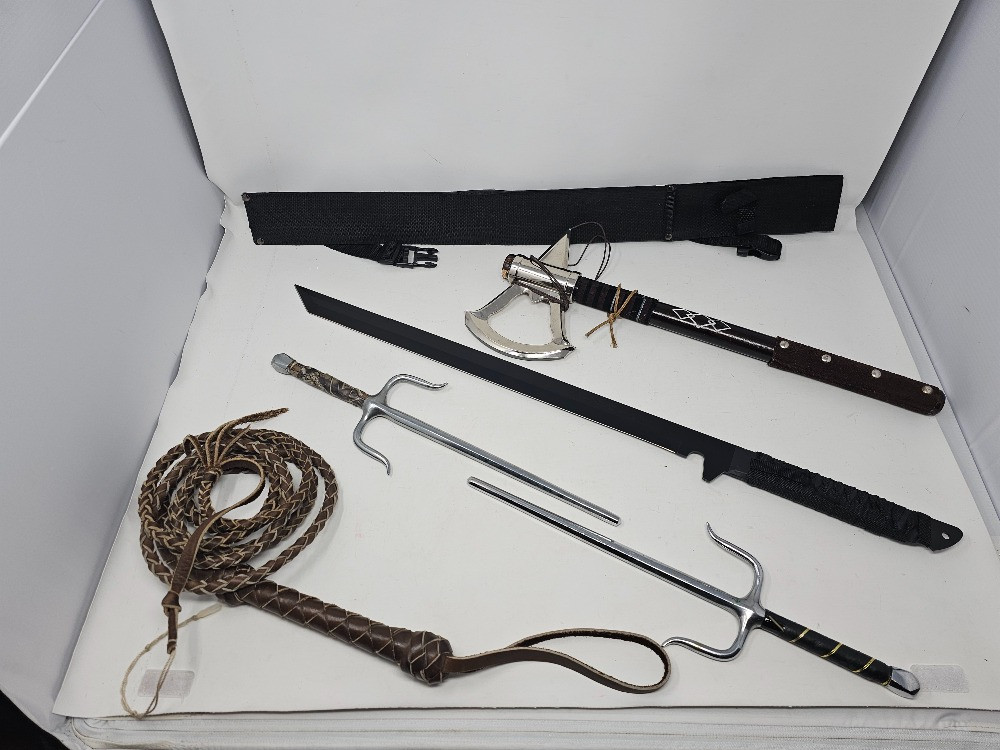 Display Weapons? Live out your Indiana Jones or Ninja dreams with this collection of weapons for display 27" Tanto Blade Sword (looks sharp & includes sheath) Pair Of 15" Sai Forks (demonstration tools) Tomahawk Axe 18" (Assassin's Creed Axe?) Bull Whip These are all untested (LOL!)