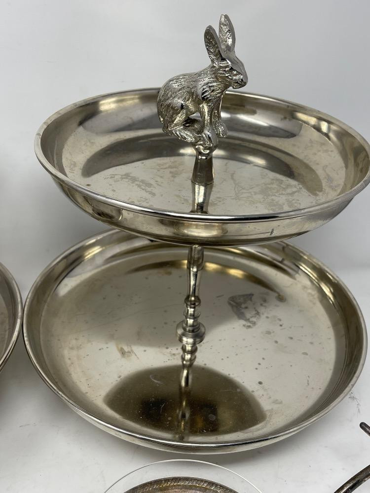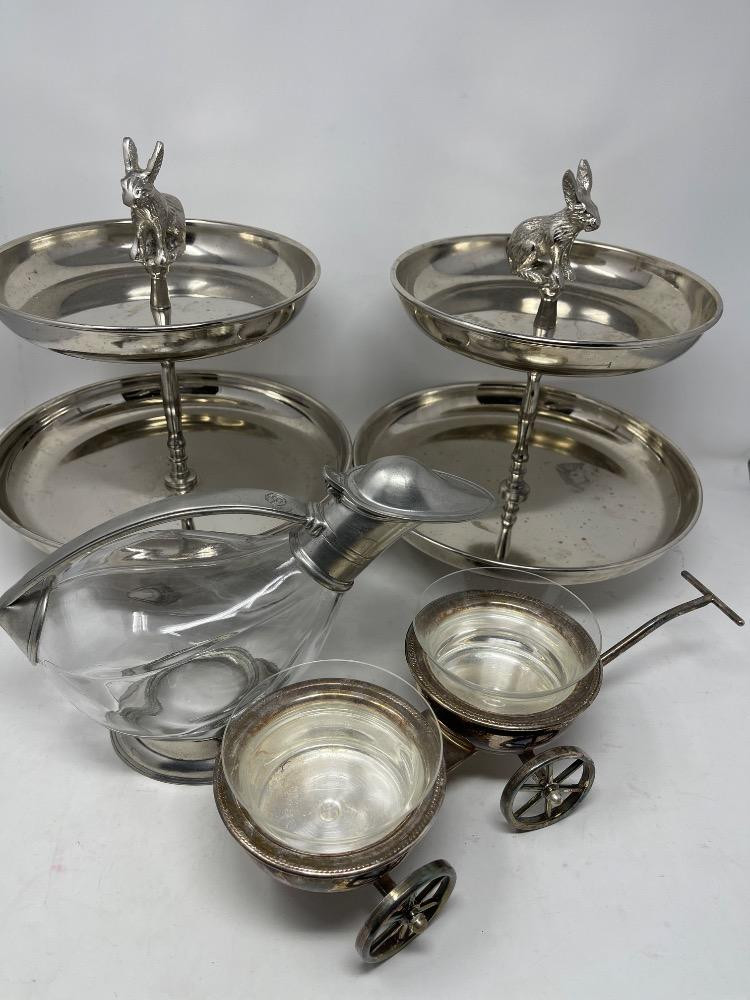 (2) Two Rabbit Finial Tier Servers, Candy Dish Wagon - Carafe