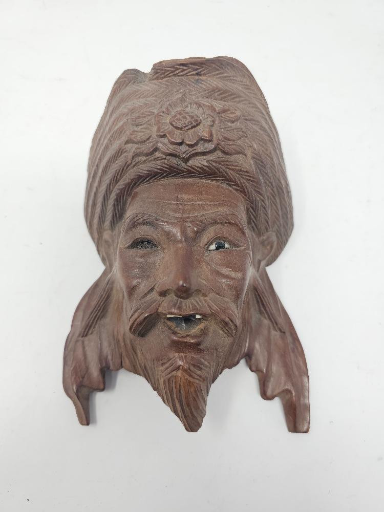 Vintage Hand-Carved Wooden Wall Mask Looks like it may be missing an eye and some teeth Might be a Chinese emperor, a nobleman, or a pirate! 7"T x 5"W x 3.5"D