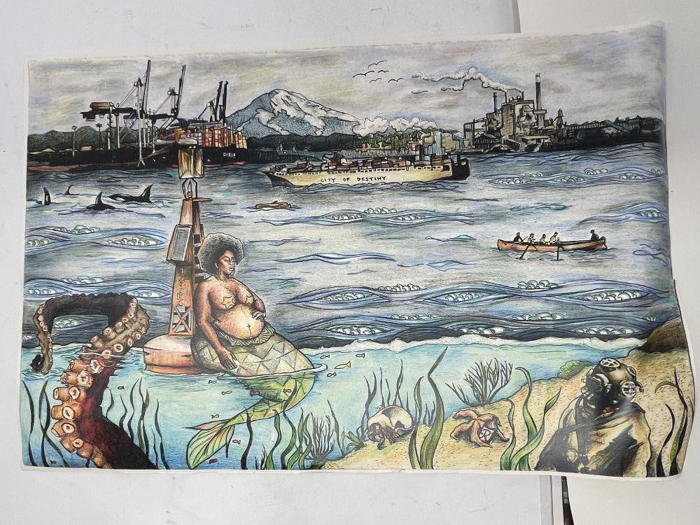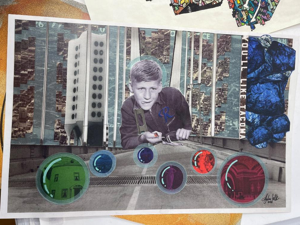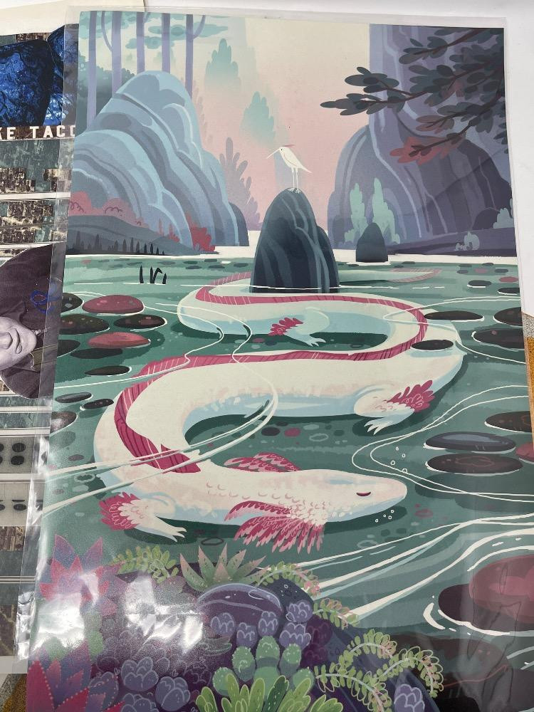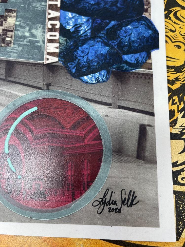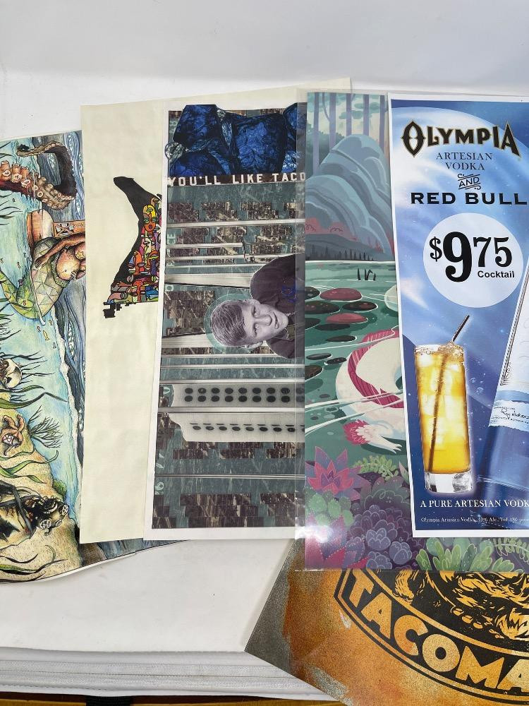 "Face of Nations" in the shape of the city of Tacoma by local artist Tiffanny Hammond. "You'll Like Tacoma" by Godin Selk originates from a sign created for the Alaska- Yukon-Pacific Exposition in Seattle in 1909, promoting the city of Tacoma. "To Hell With Fusty Prudery in the City of Destiny" by Cassandra Kuring. These 3 can be found in Grit City Magazines. Olympia Artisan Vodka and Red Bull Advertising. Serene Axoloti Dragon Lake print is 12”x18” All others measures 11”x17”.