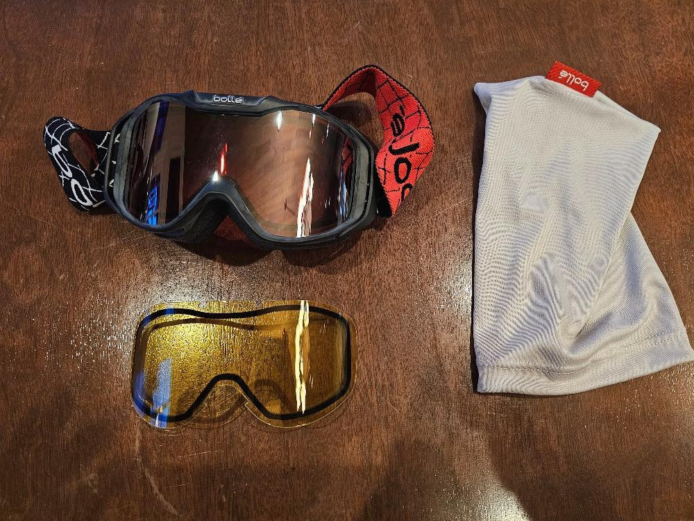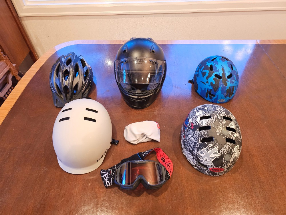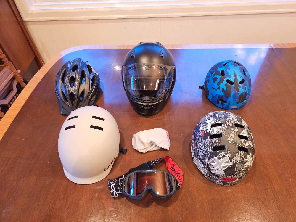 (5) Helmets, Bolle Goggles & (2) Gordini Gloves (1) Arai Adult XL Motorcycle Helmet (1) Bell Slant Bicycle Helmet (1) Bell Faction Jimbo Punker Helmet (1) Bell Maniac Youth Helmet (1) Giro Adult L Surface Snow Helmet (1) Bolle Goggles with additional yellow lenses in a protective bag (2) Pair Gordini Womens/Mens L Snow Gloves