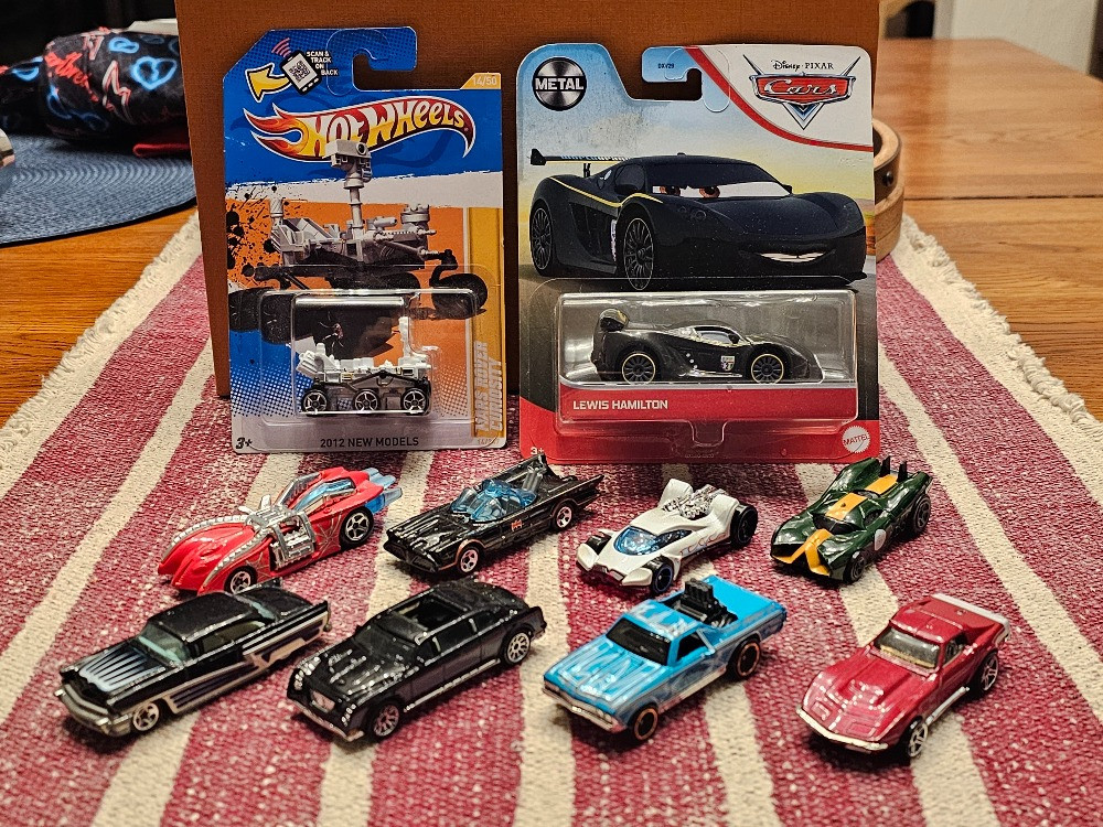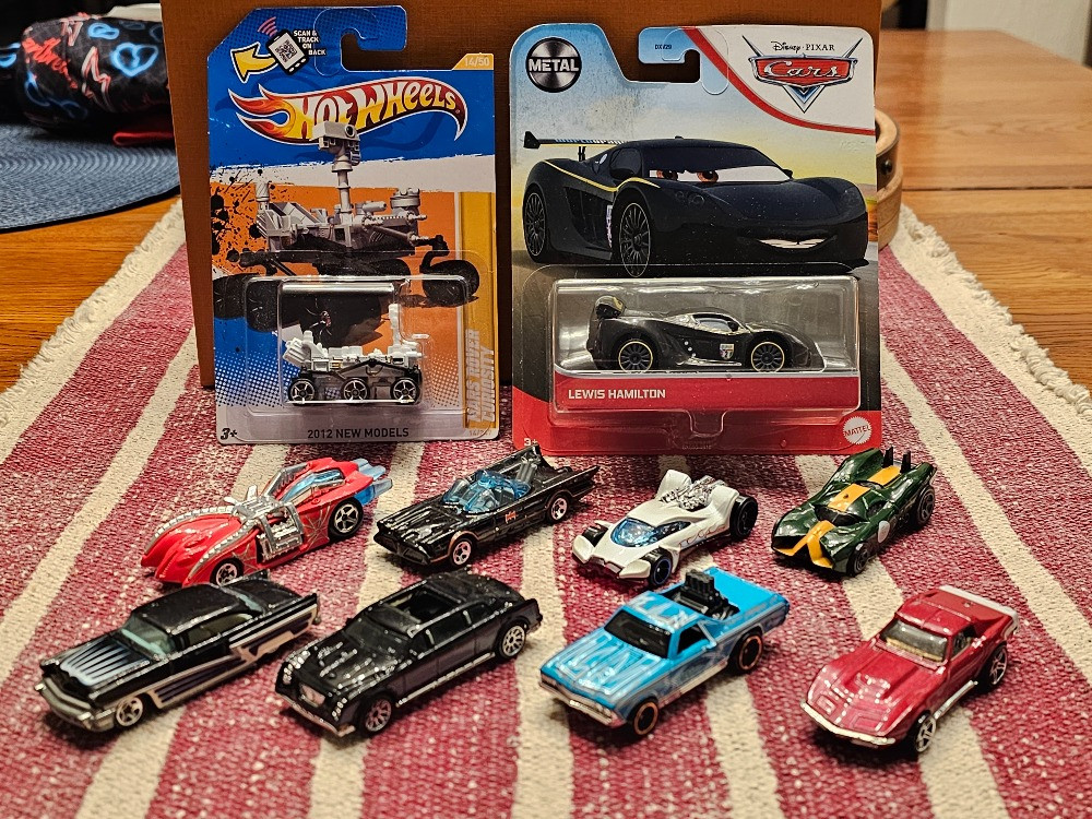 (10) Die-Cast Cars - Mostly HotWheels! 2012 HotWheels Mars Curiosity Rover (NIP) 2006 HotWheels 1969 Corvette (Valentine's Day) 2022 HotWheels 1968 El Camino (Rod Squad) 2009 HotWheels 1956 Merc (Ultra Hot) 2010 HotWheels Vulture Concept (Criss Cross Crash) 2008 HotWheels Prototype H-24 2007 HotWheels 1966 Batmobile (DC Premium TV Series) 2010 HotWheels Arachnorod (The Insectirides) 2001 Matchbox Limousine 2017 Disney/Pixar Cars Lewis Hamilton (NIP)