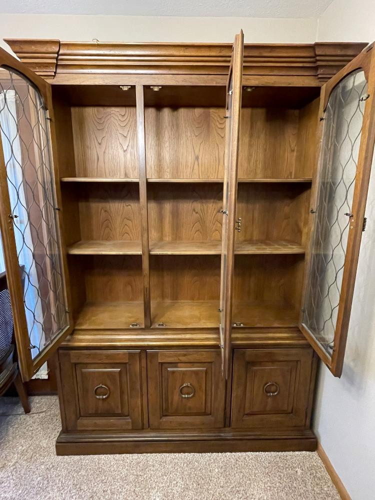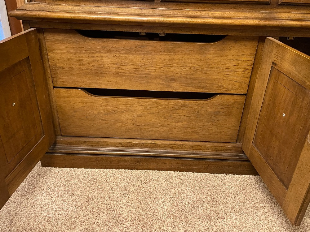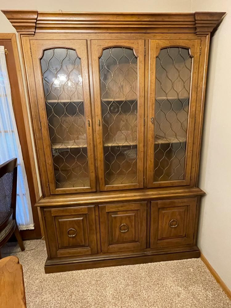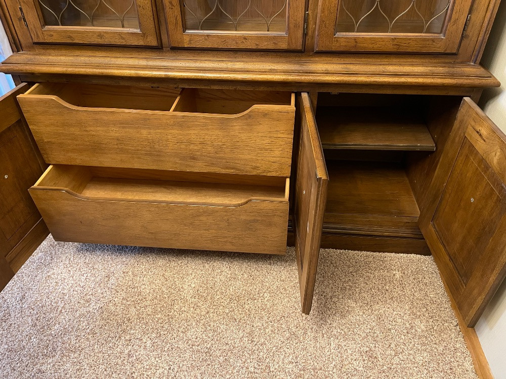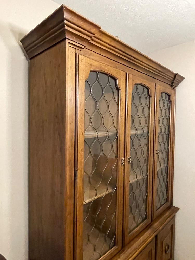 Drexel Furniture China Cabinet has interior shelves with plate rail, 2 storage drawers, one cabinet with shelf. The metal door grids are removable for easy glass cleaning. Appears in good condition. 55“ x 16“ x 78“ tall.