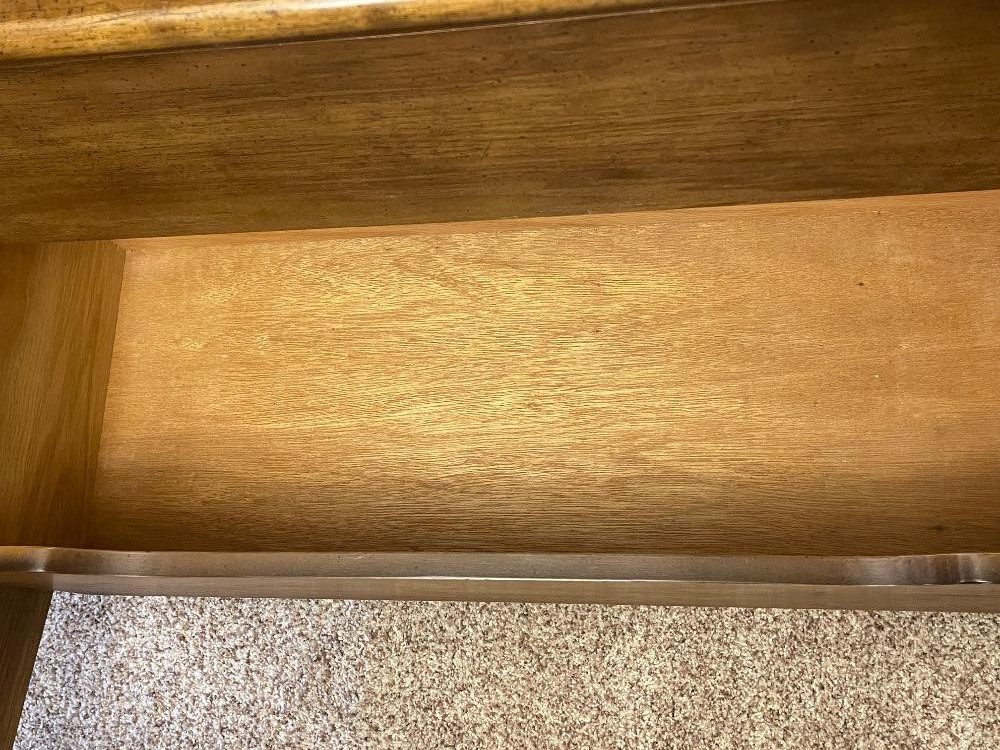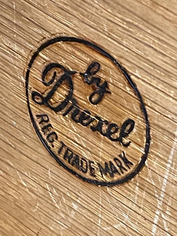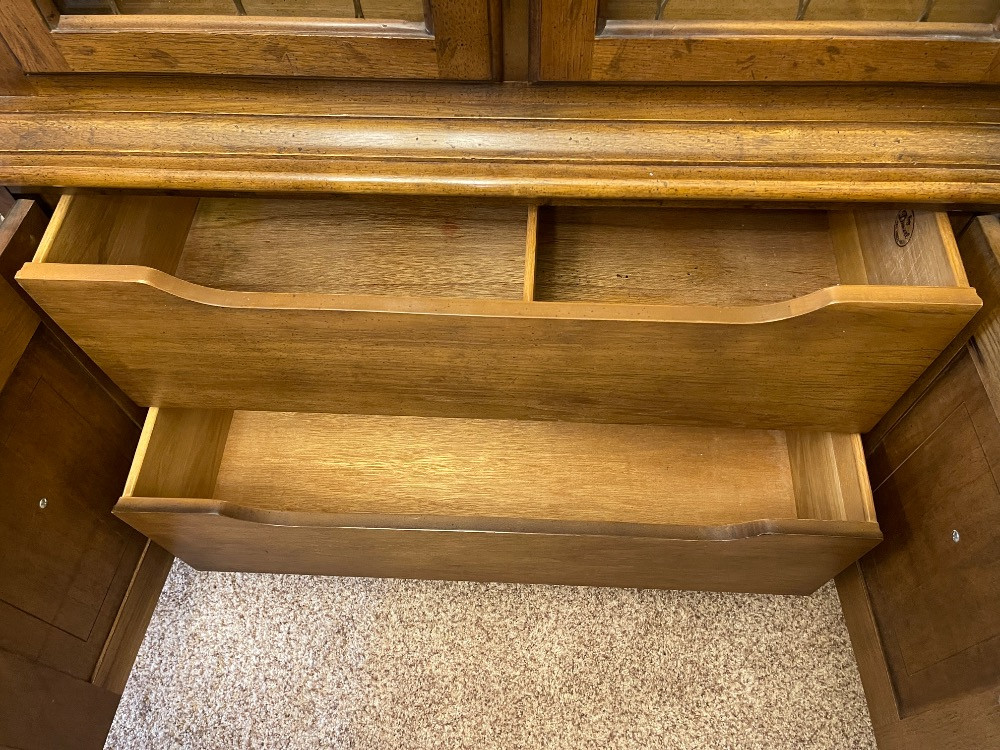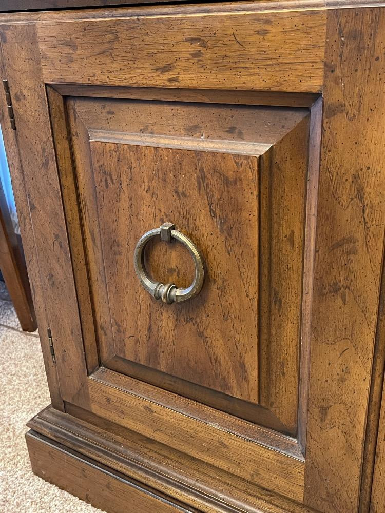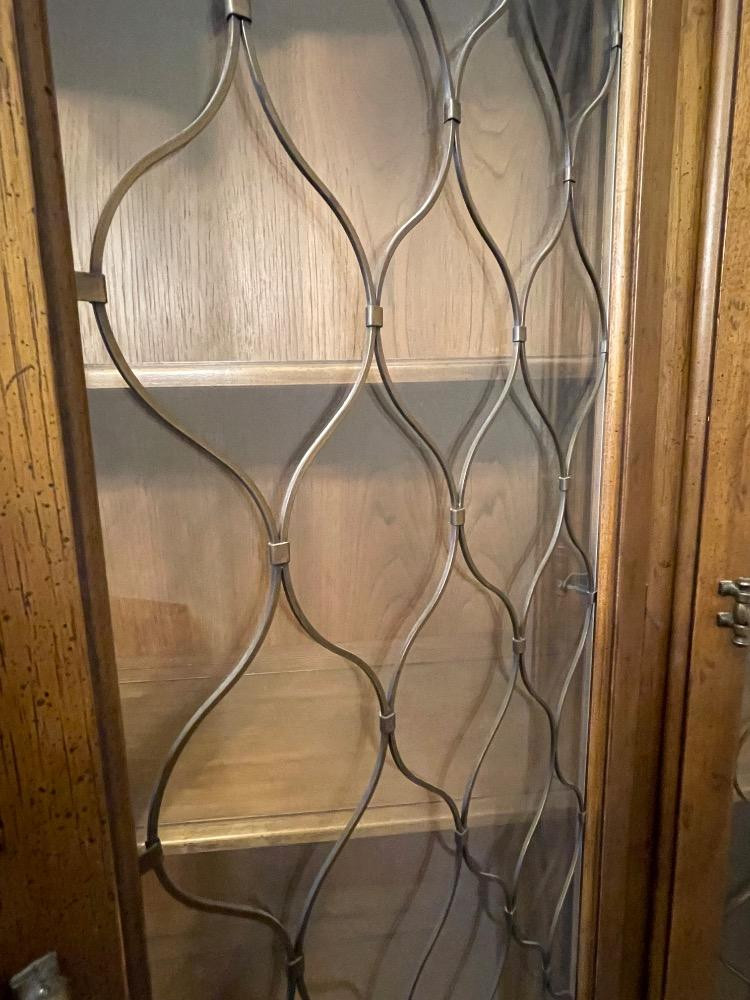 Drexel Furniture China Cabinet has interior shelves with plate rail, 2 storage drawers, one cabinet with shelf. The metal door grids are removable for easy glass cleaning. Appears in good condition. 55“ x 16“ x 78“ tall.