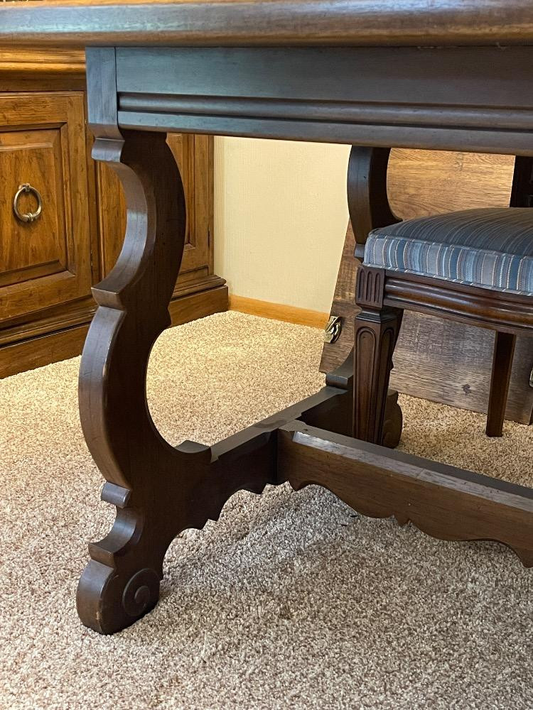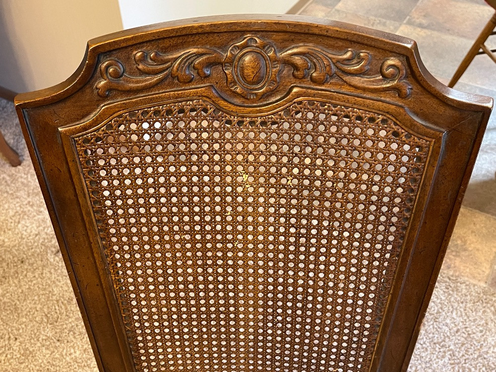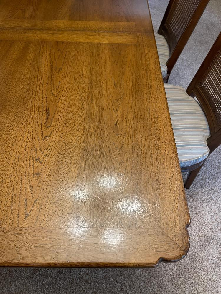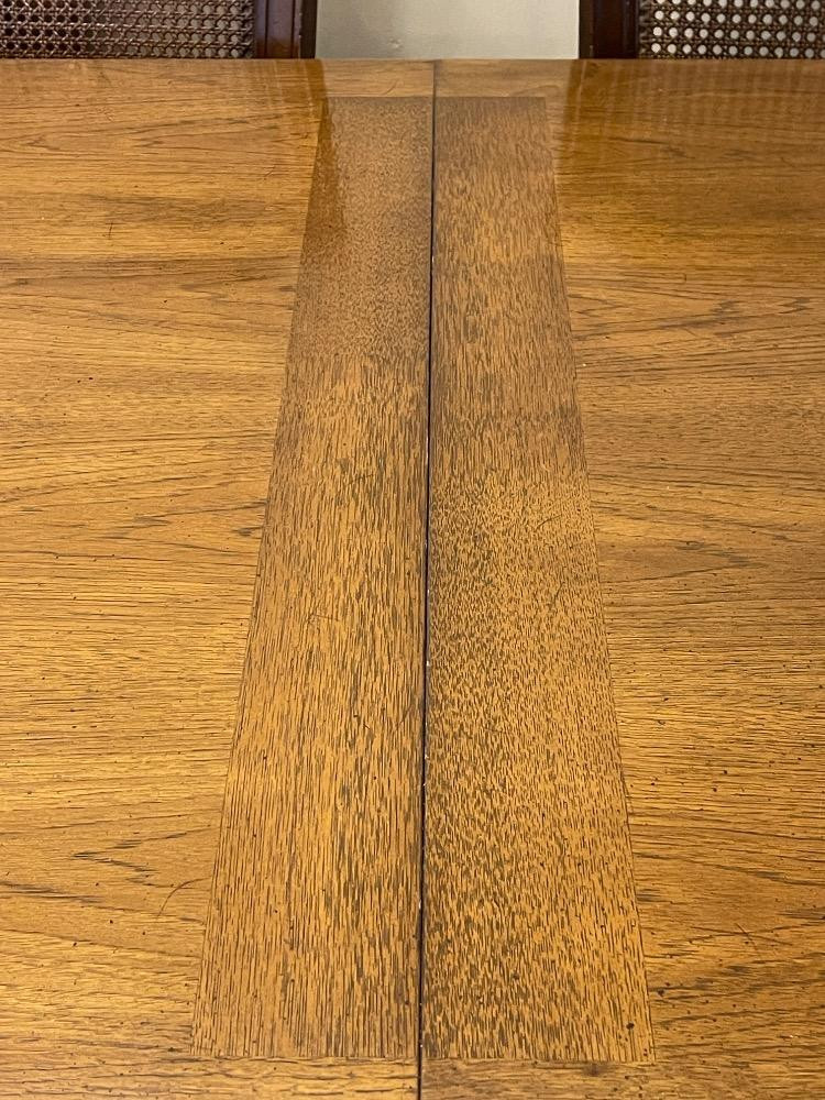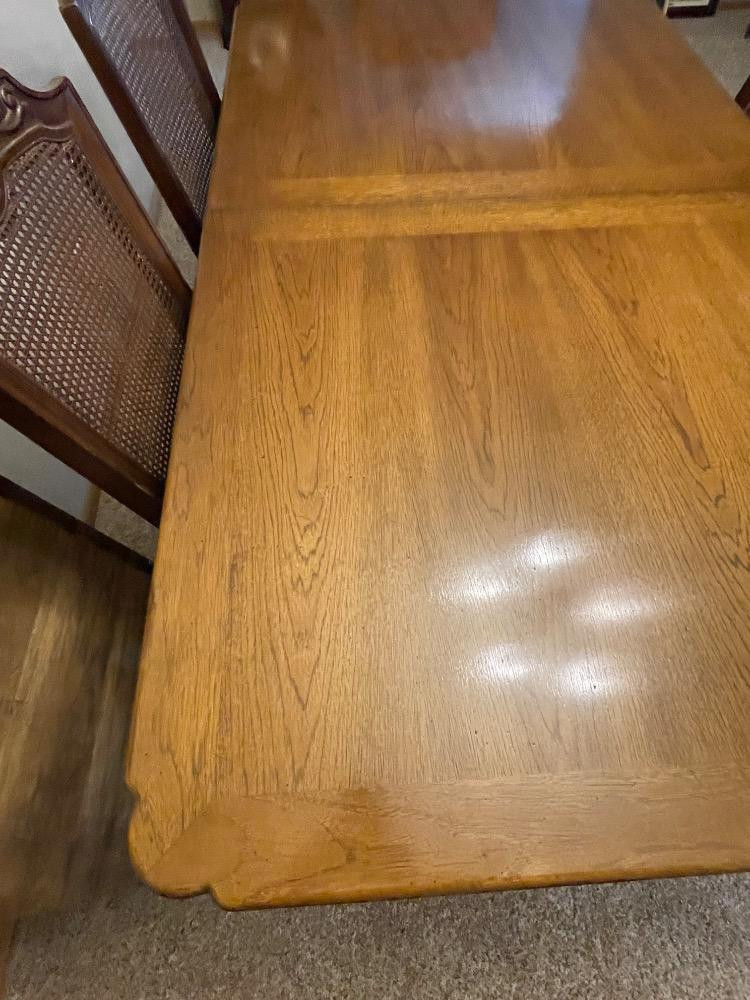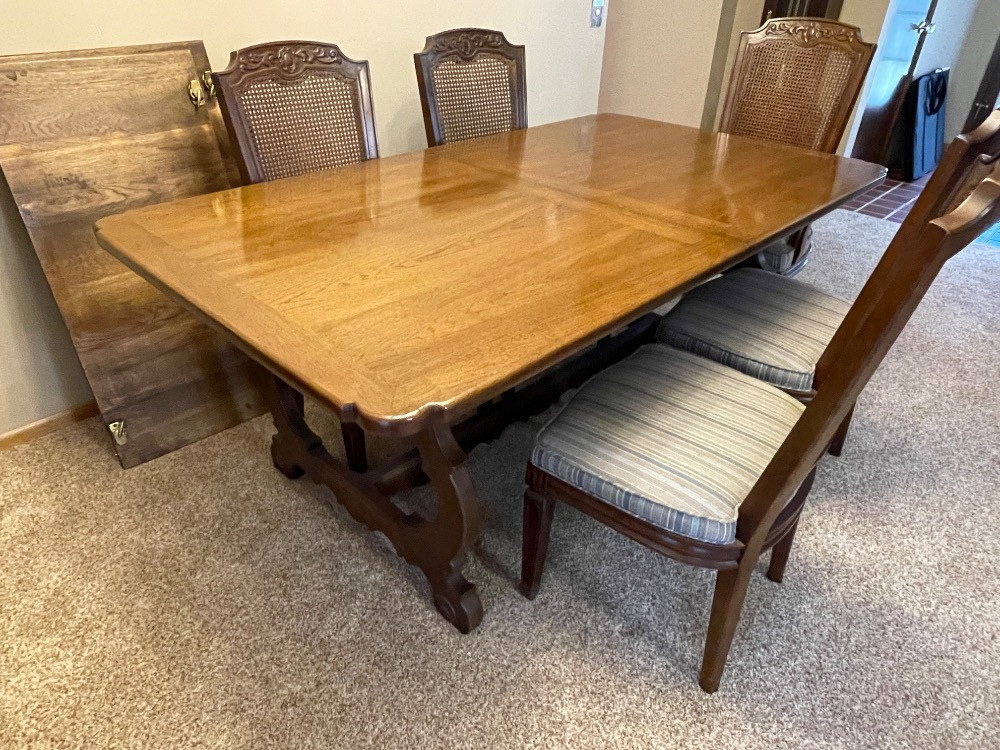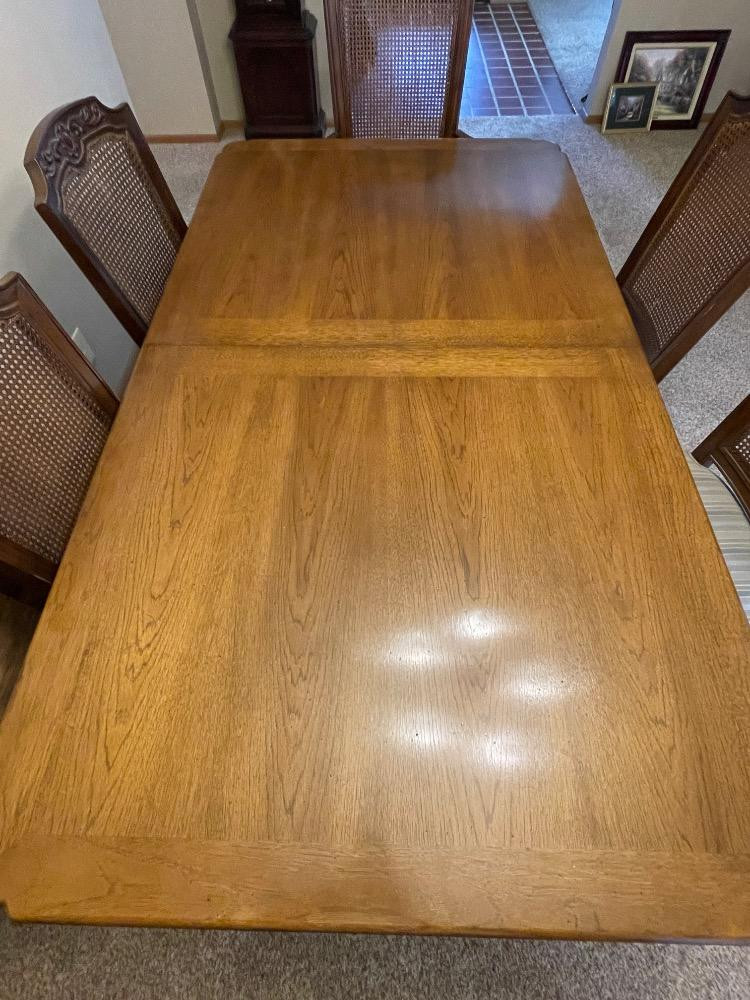 6 Cane Back Chairs - Stunning Scroll Table Base Dining Set + 2 Leaves Oak 2 leaves at 20” each.