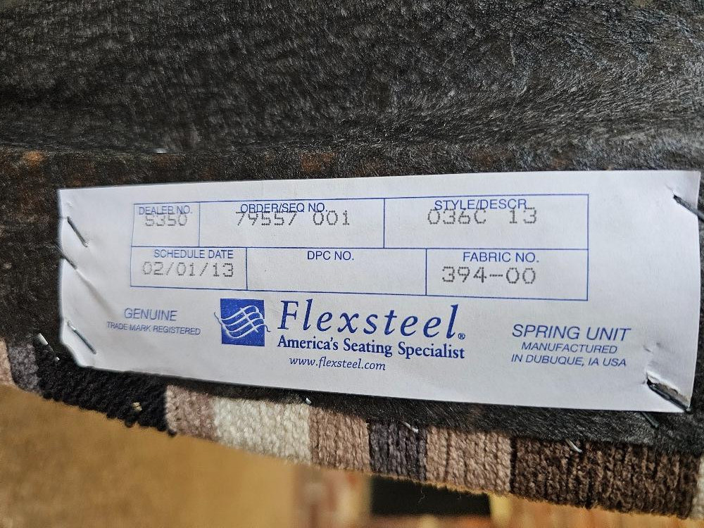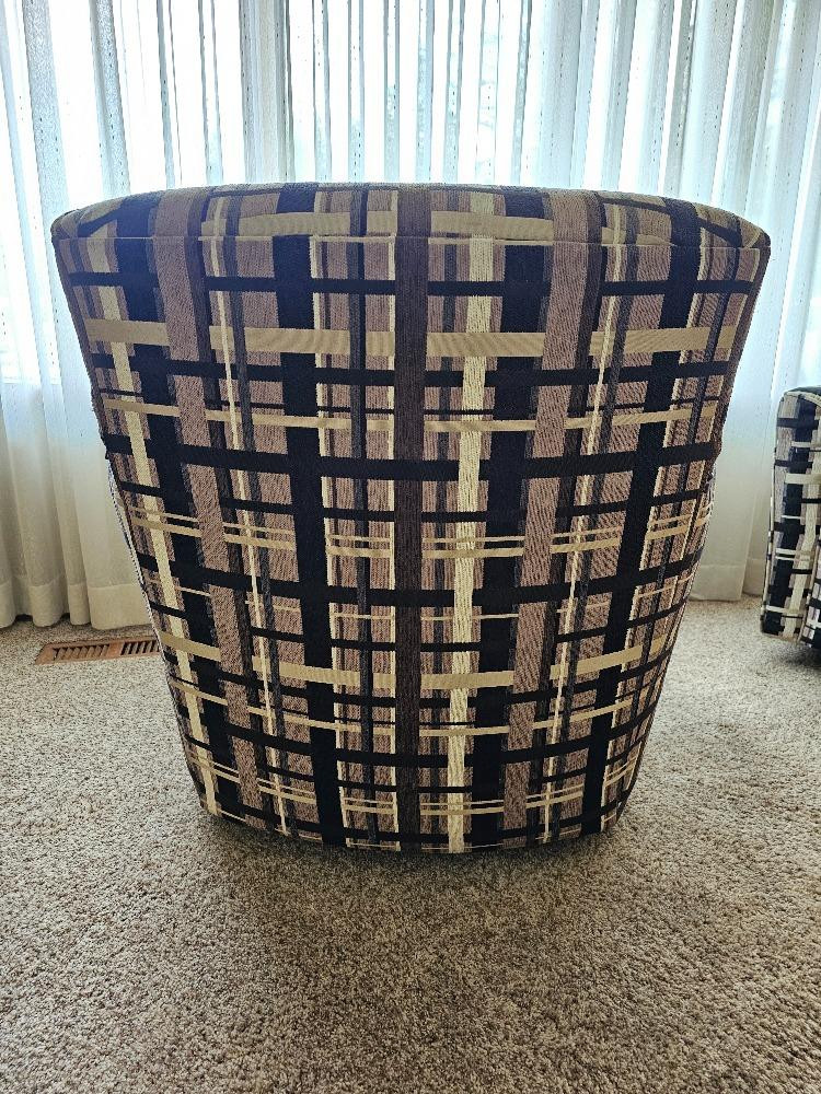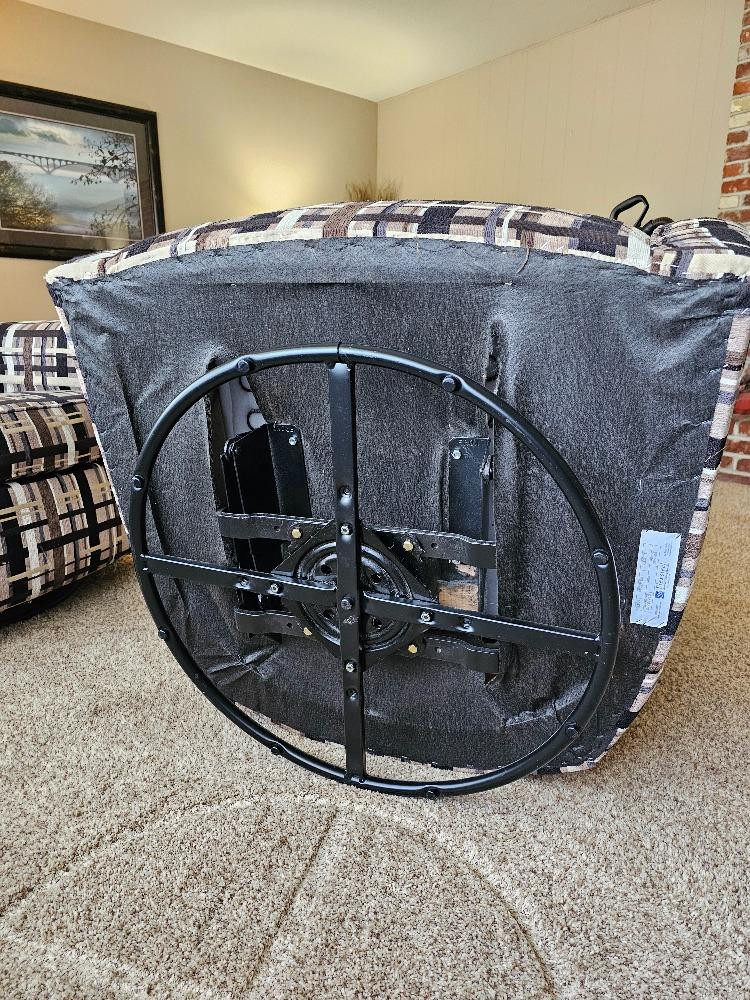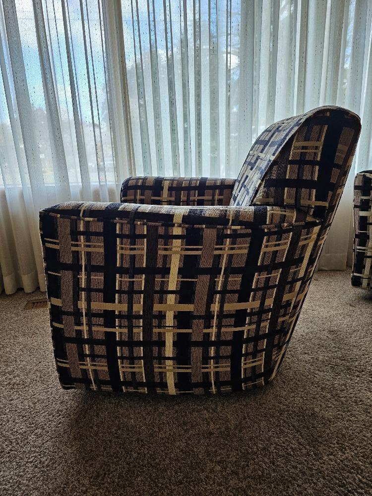 FlexSteel Retro Plaid Swivel & Rocking Chair #1 Great plaid design in black, brown, tans & grey Manufactured in 2013 Very comfortable - in great condition Includes armrest covers (worn and could use a wash) 33.5"T x 32.5W x 32"D