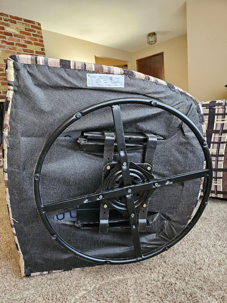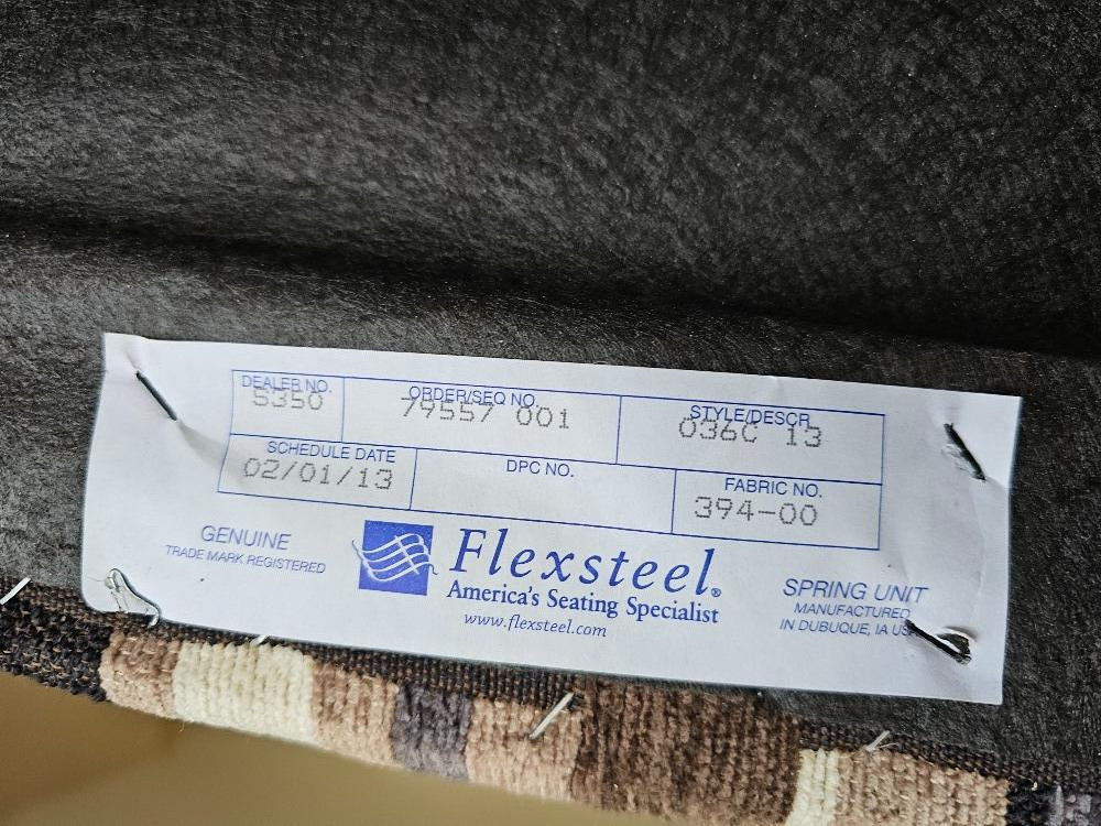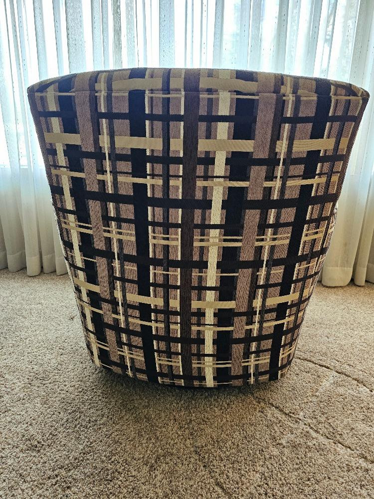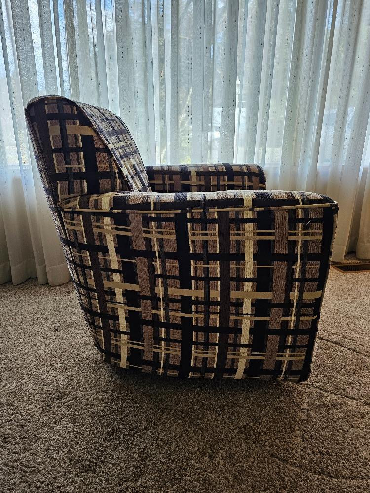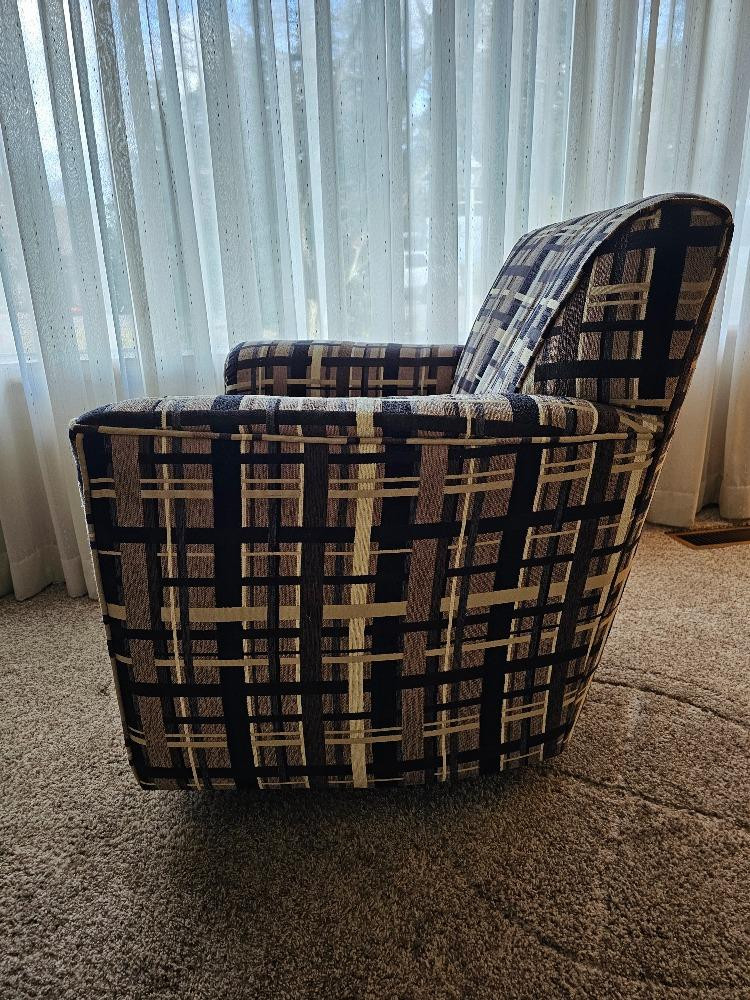 FlexSteel Retro Plaid Swivel & Rocking Chair #2 Great plaid design in black, brown, tans & grey Manufactured in 2013 Very comfortable - in great condition Includes armrest covers (worn and could use a wash) 33.5"T x 32.5W x 32"D