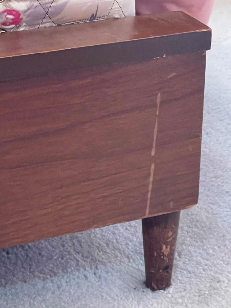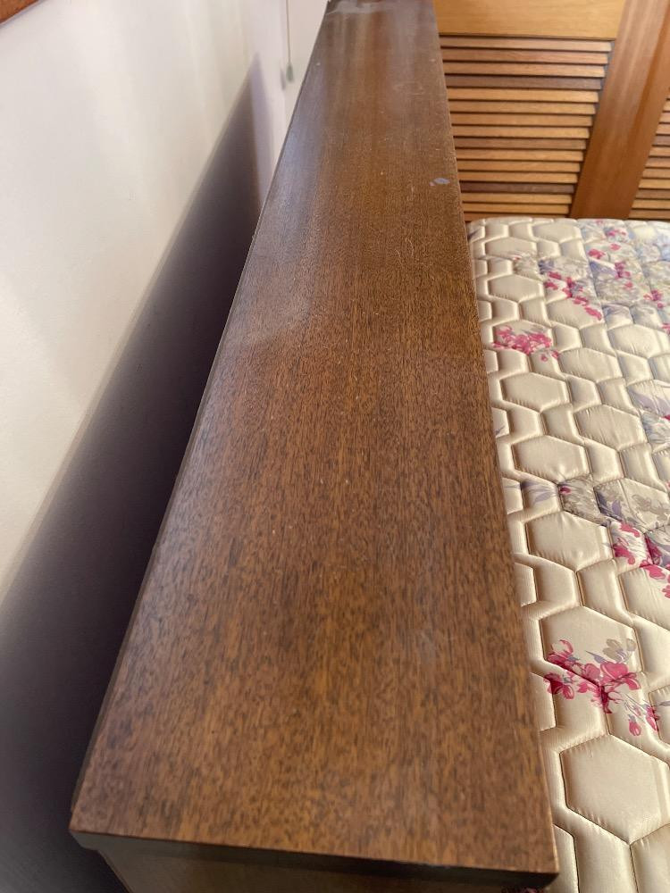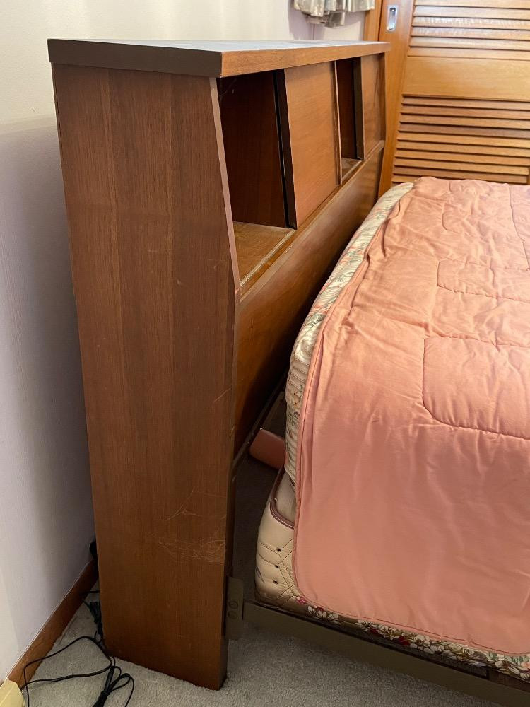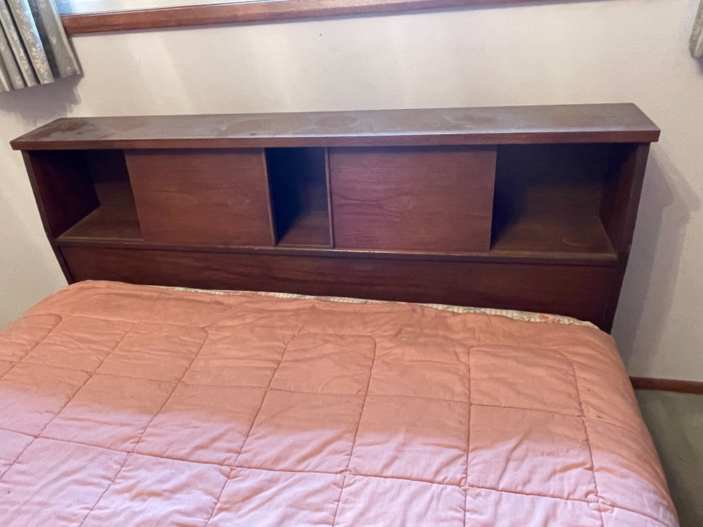 Mid-Century 1962 Headboard, foot board and metal frame. The headboard has sliding doors for headboard storage. Some scuffs to the wood. Top of headboard surface is in excellent condition.