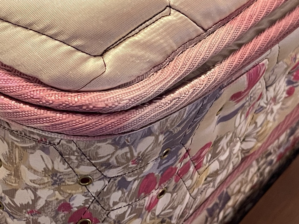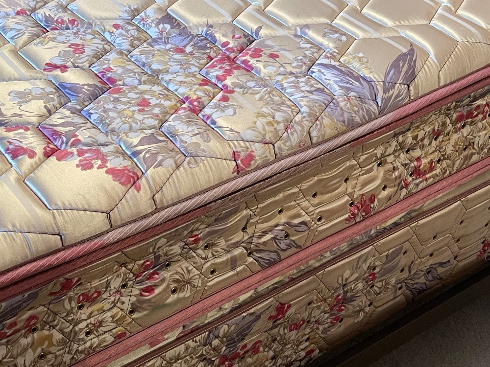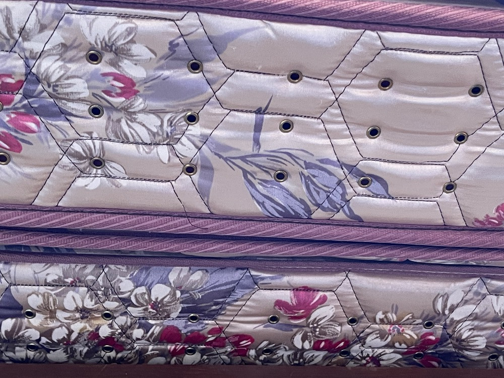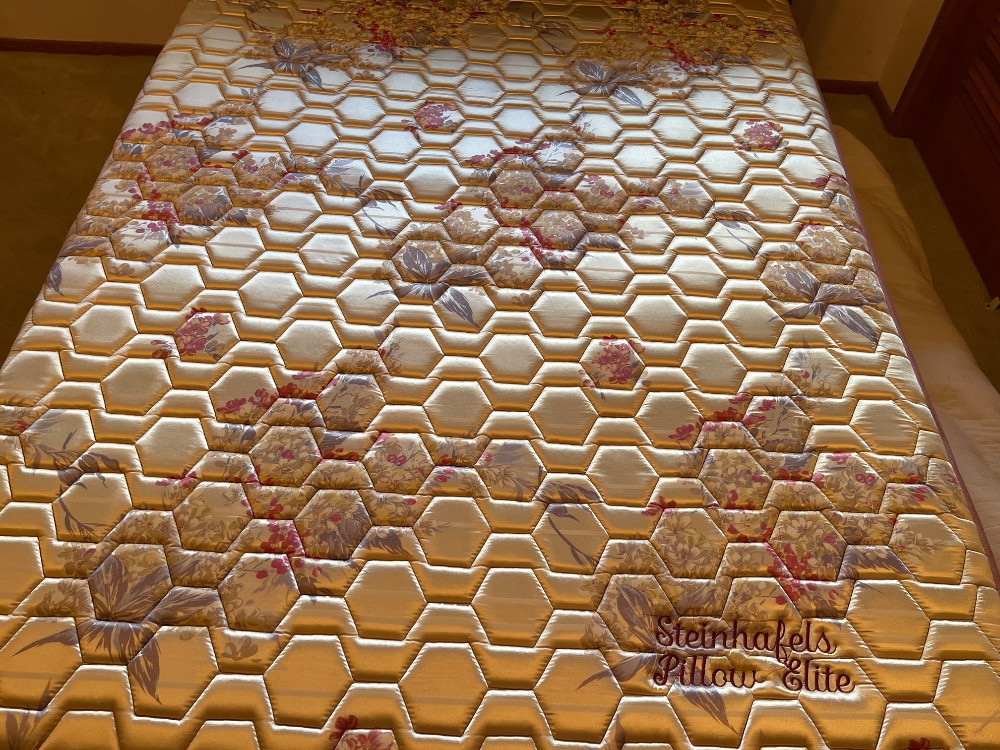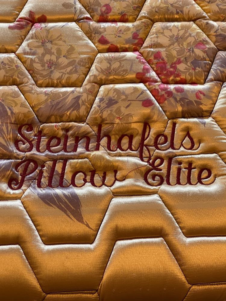 75”x 52” Steinhafels Pillow Elite Mattress and Boxspring. Full size. Minor fading to the piping. Bedding included.