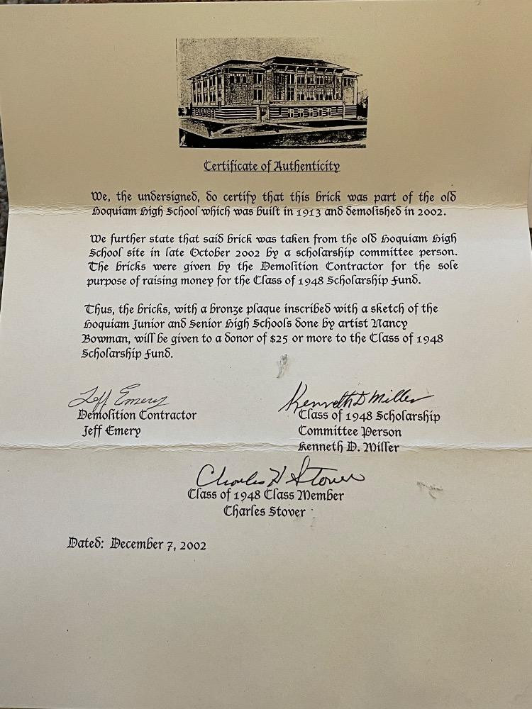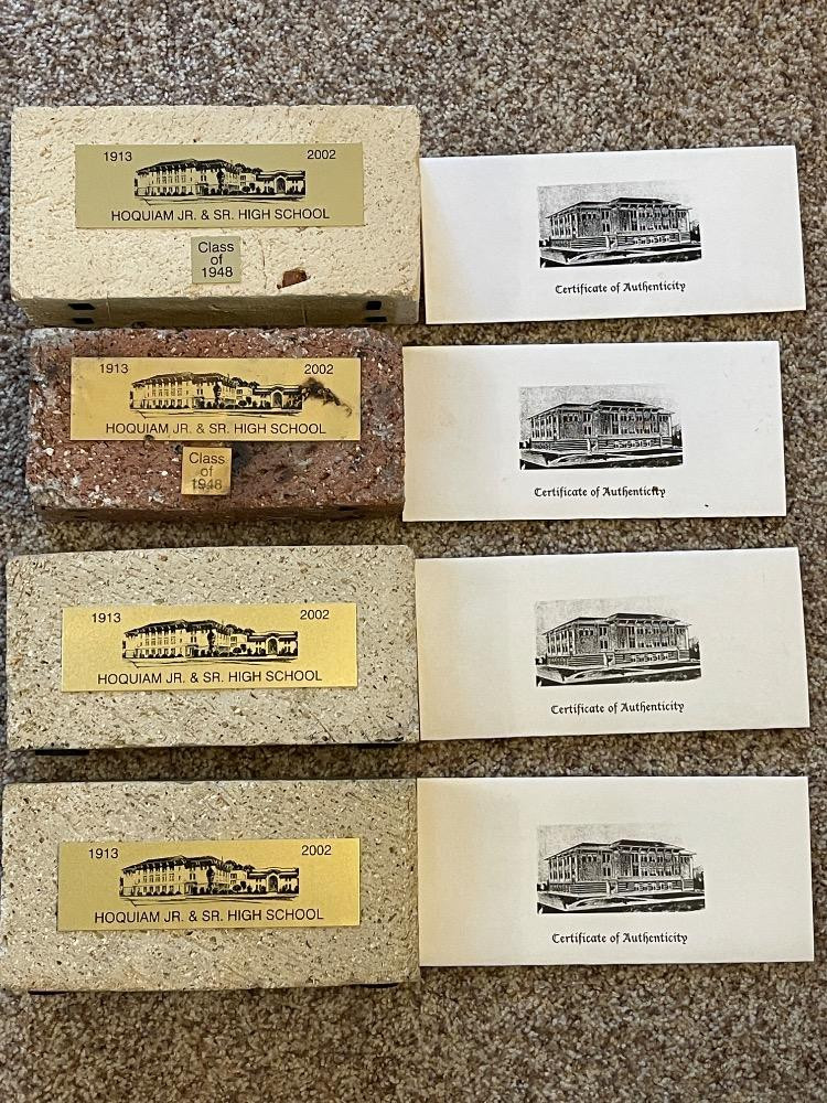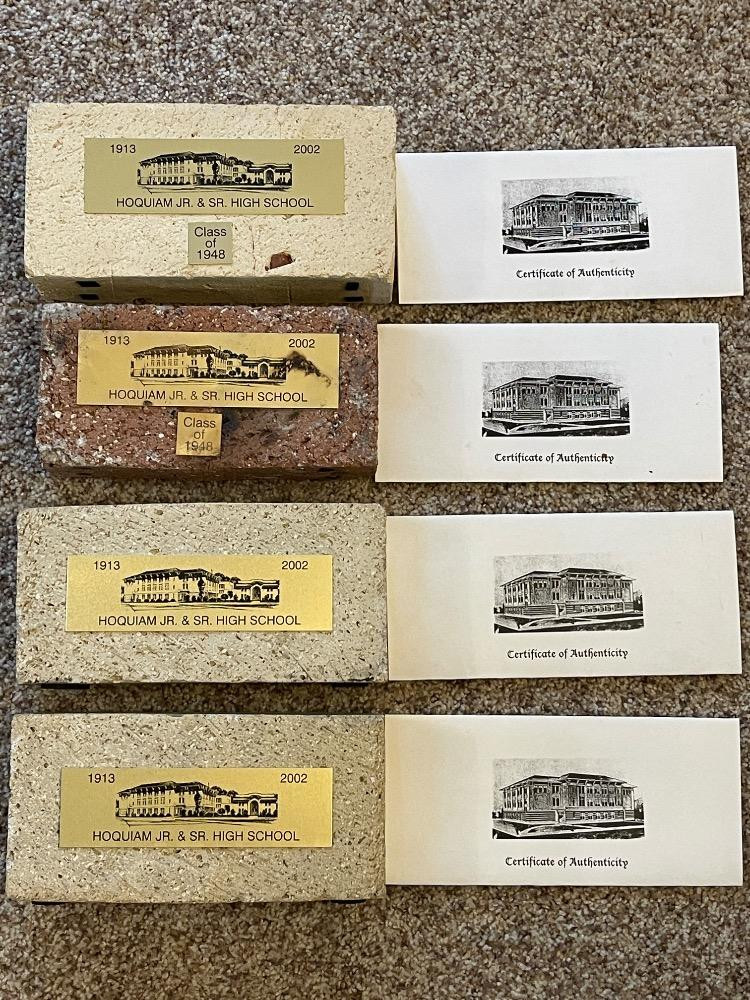 (4) Hoquiam (1913-2002) Jr & Sr HS Commemorative Bricks w/ COA’s