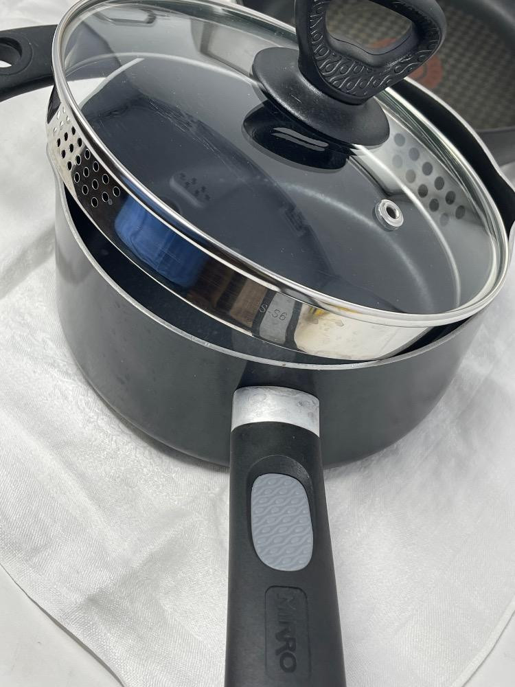Small Cookware Set - Calphalon - T-Fal- Mirro 1.5qt, 1qt sauce pans and 8” frying pan.