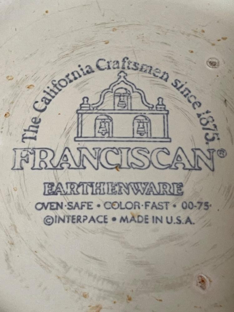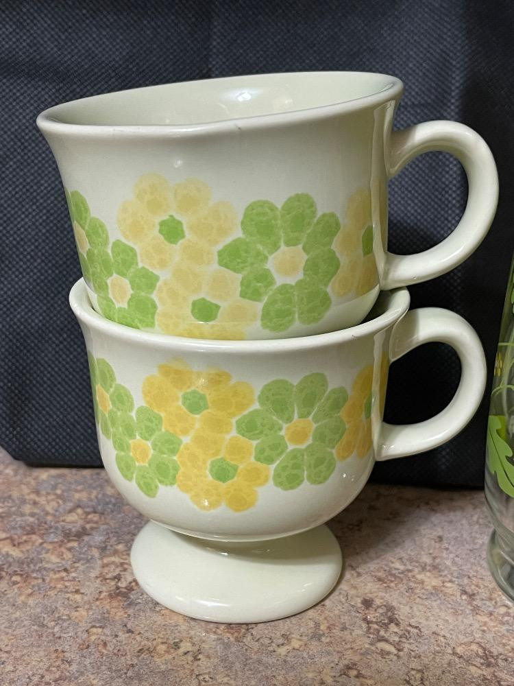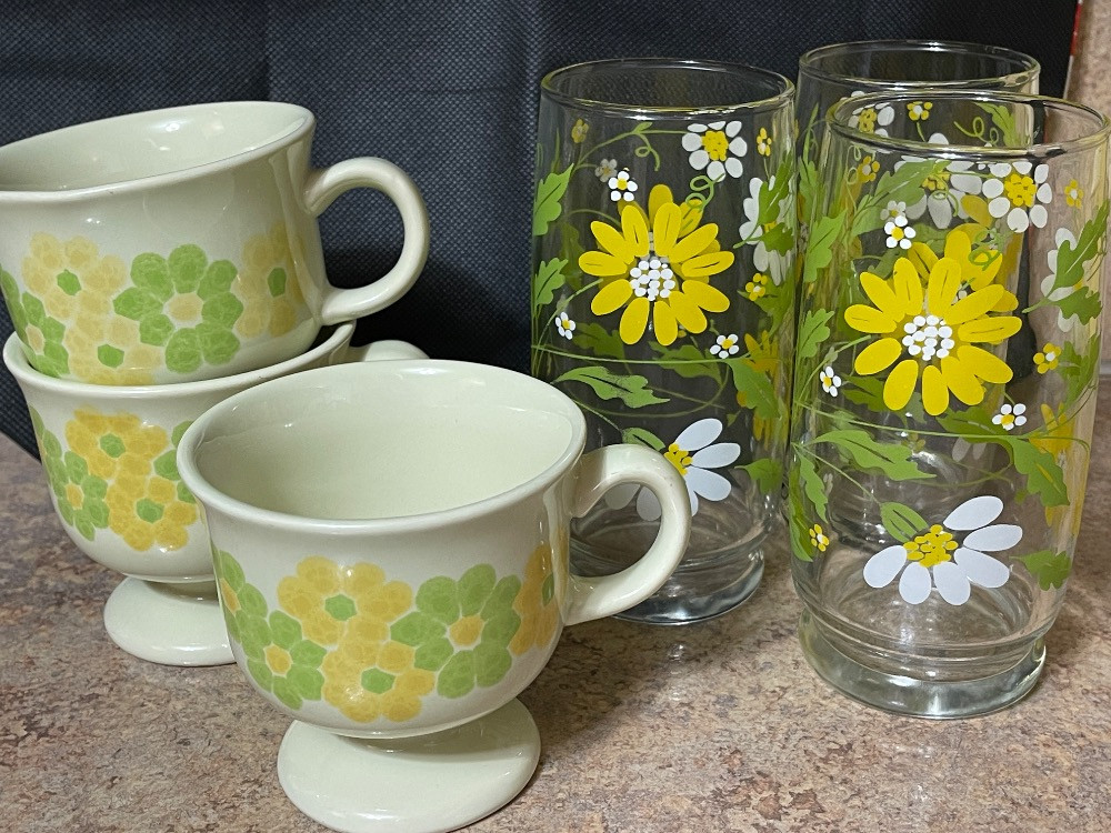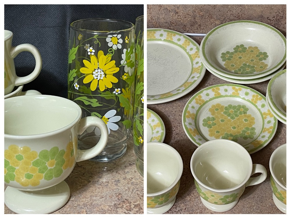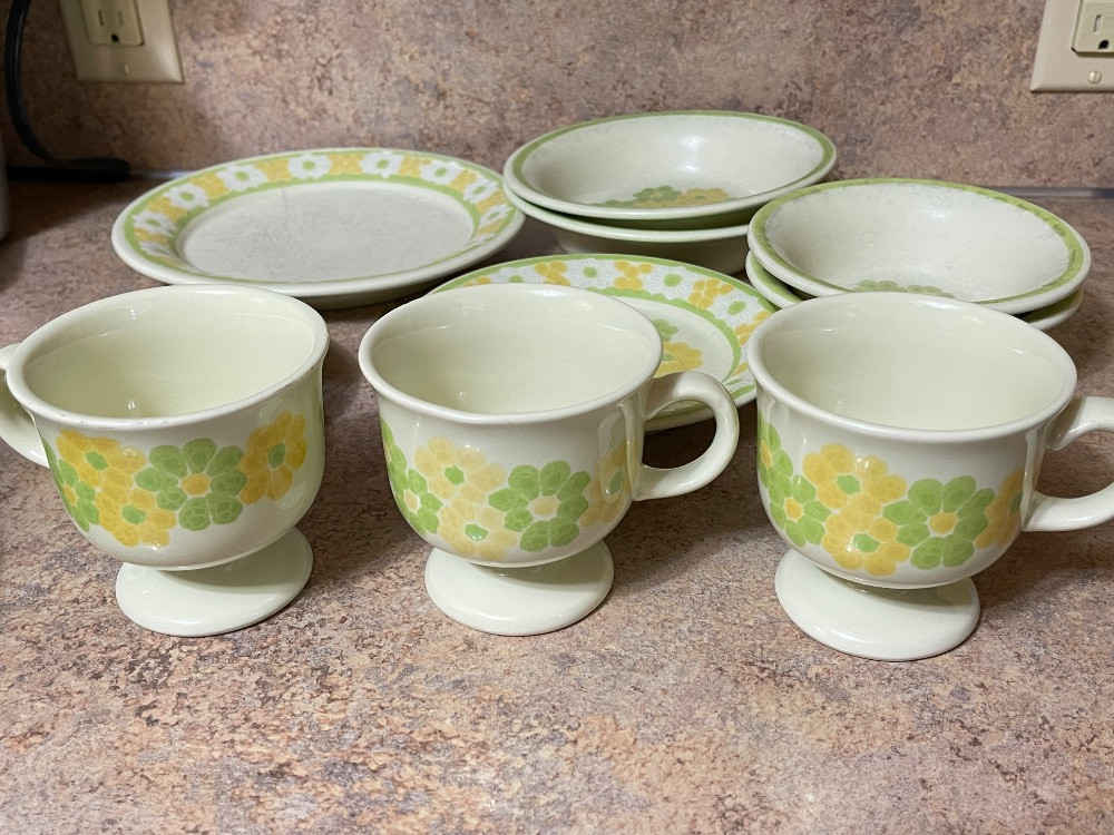 (16) pieces of Franciscan Earthenware footed picnic collection. Produced by Gladding, McBean Co 1934-1962. 3 dinner plates 1 Salad plate 1 Desert plate 2 cereal bowls 2 smaller bowls 1 saucer 6 coffee cups 3 glasses with daisy print