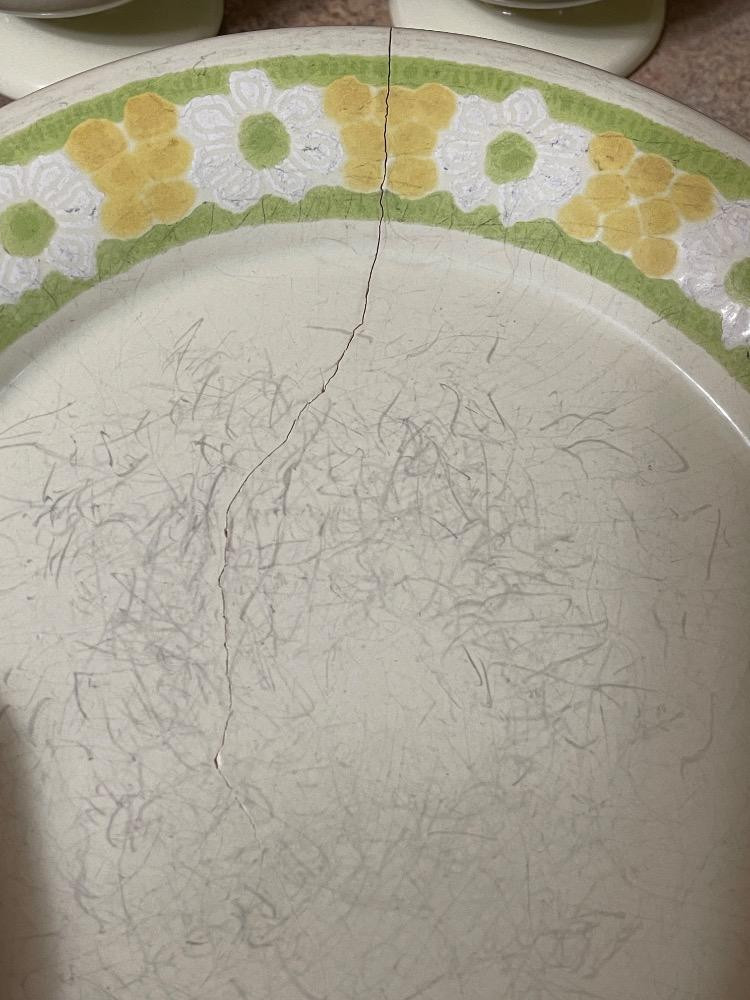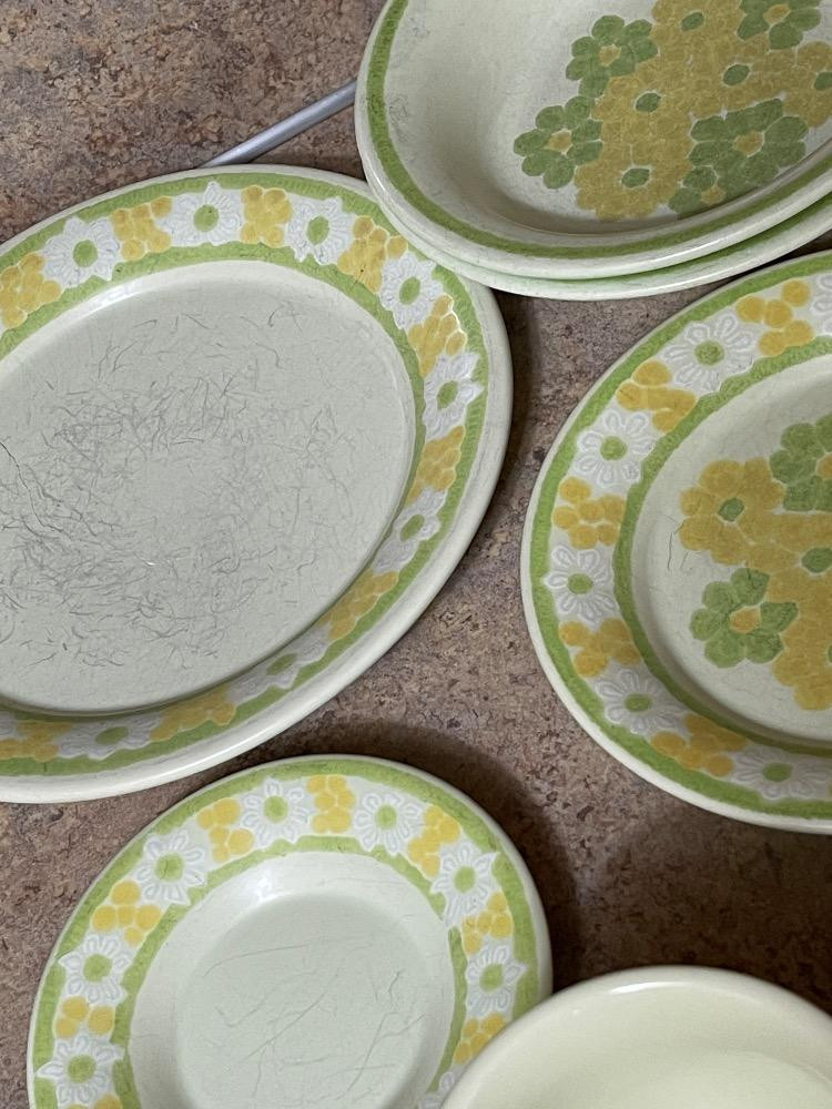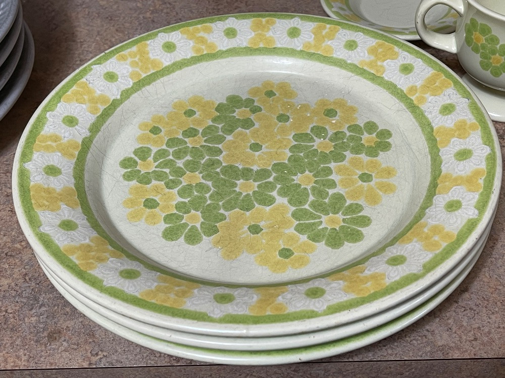 White Yellow & Green Daisies. One salad plate has a crack Textured rim around the edge.