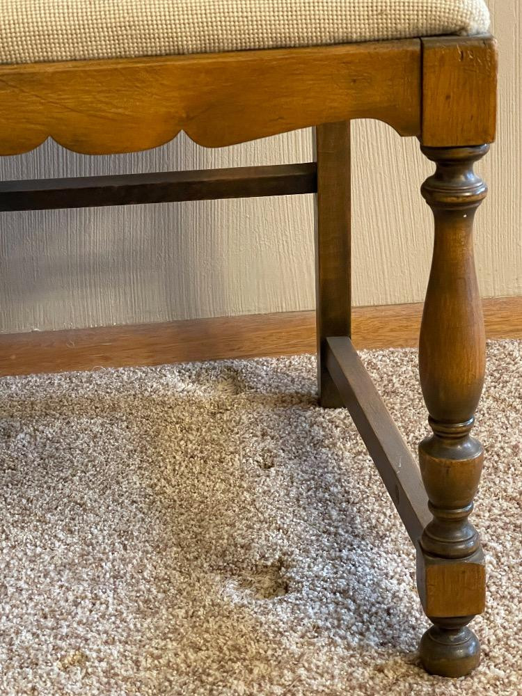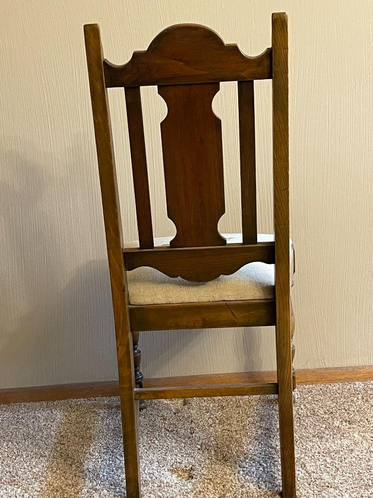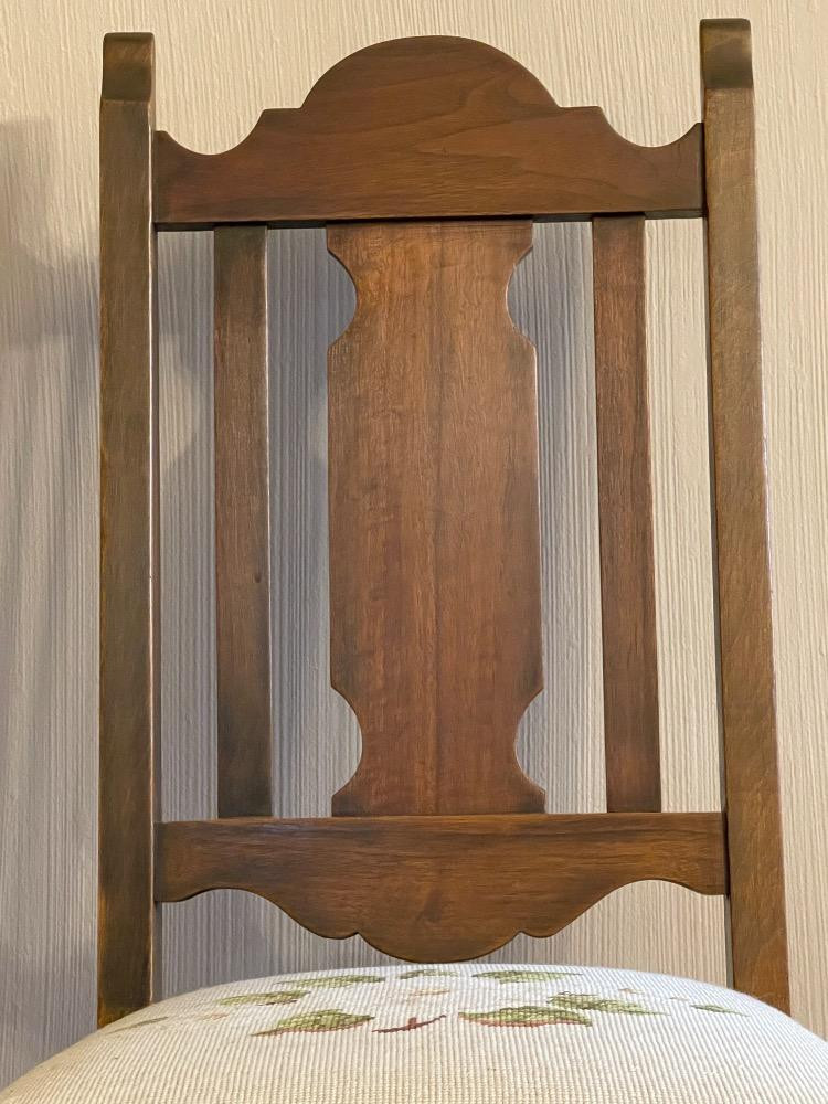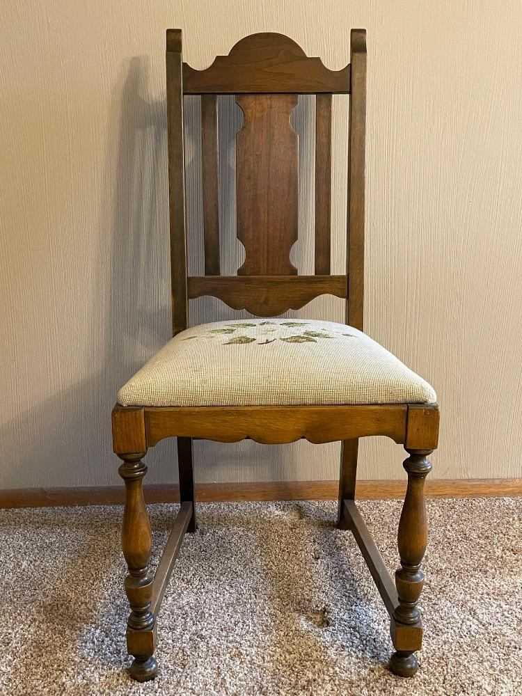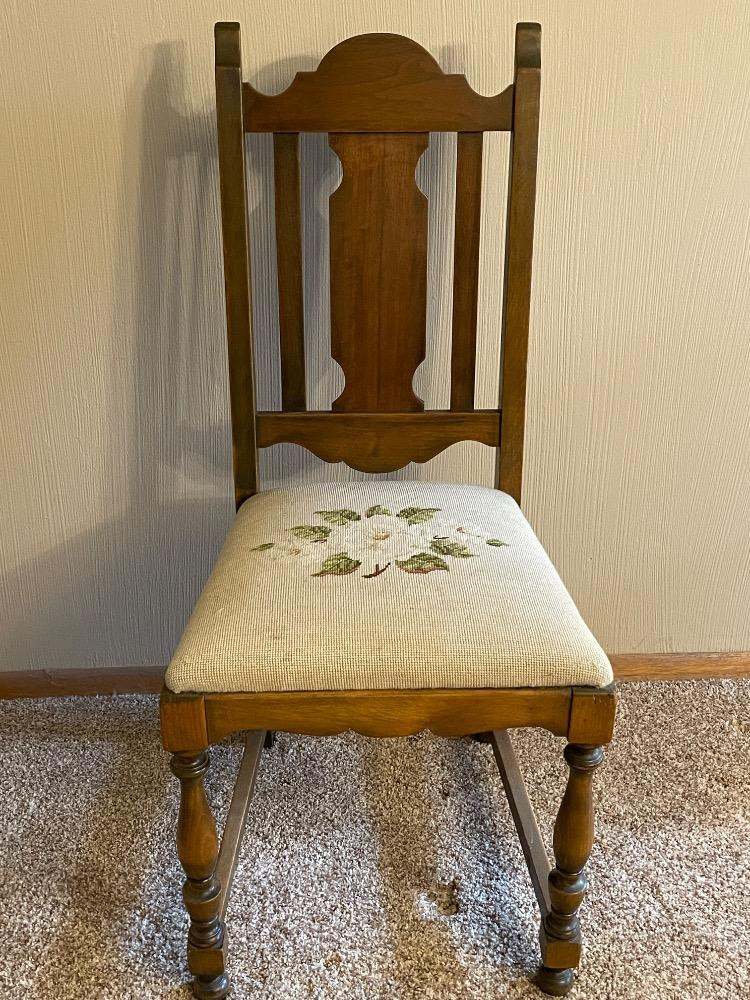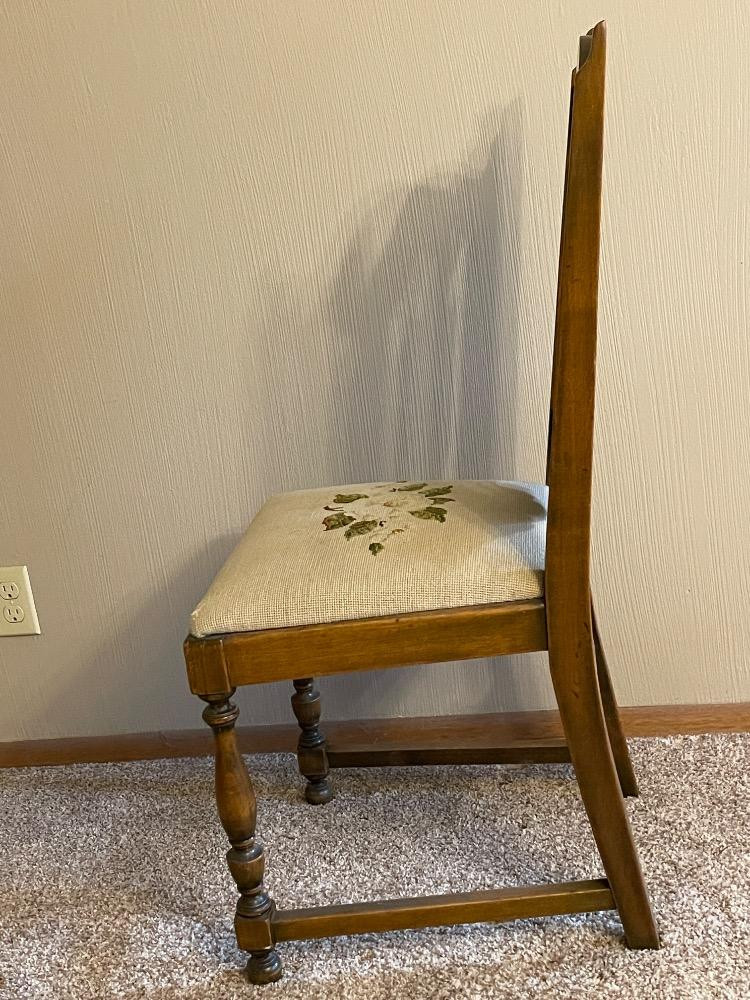 Wood Side Chair Needlepoint Seat Smaller size chair that measures 17.5“ x 19“ x 39“ tall.