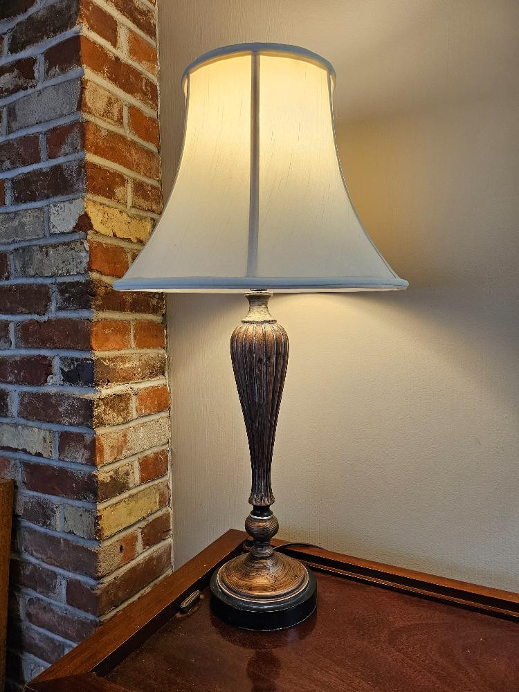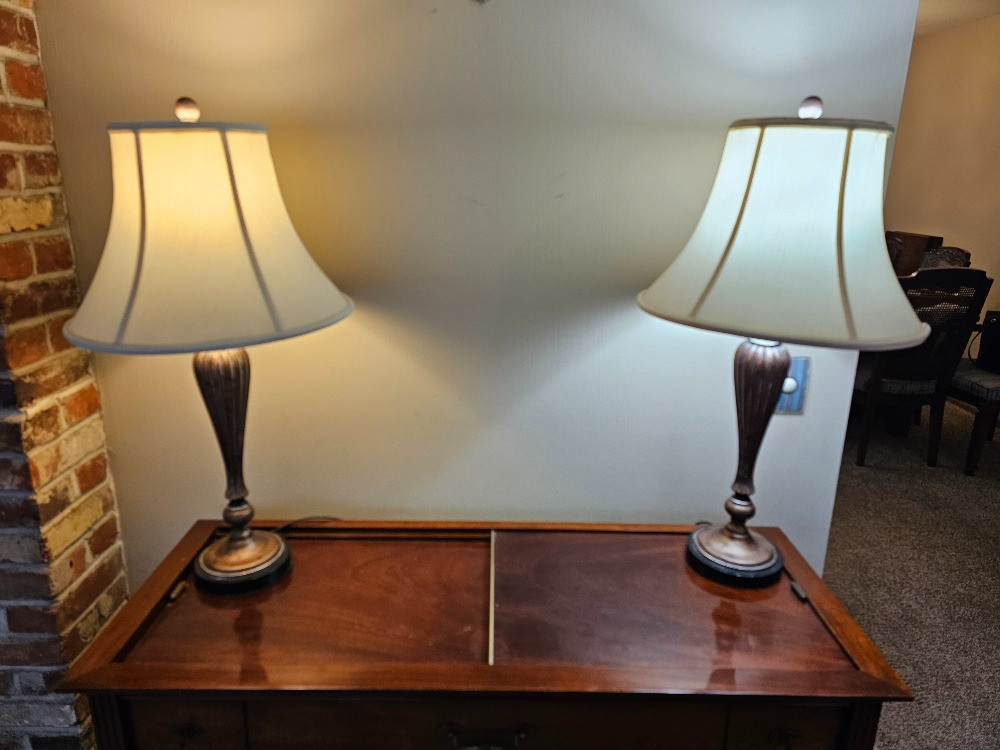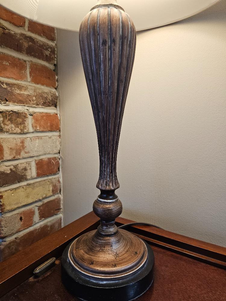 Pair Of Heavy Painted Bronze Ceramic Lamps 30"T x 16"W Base is 6.5" round Mfg in 2010 Tested - Works