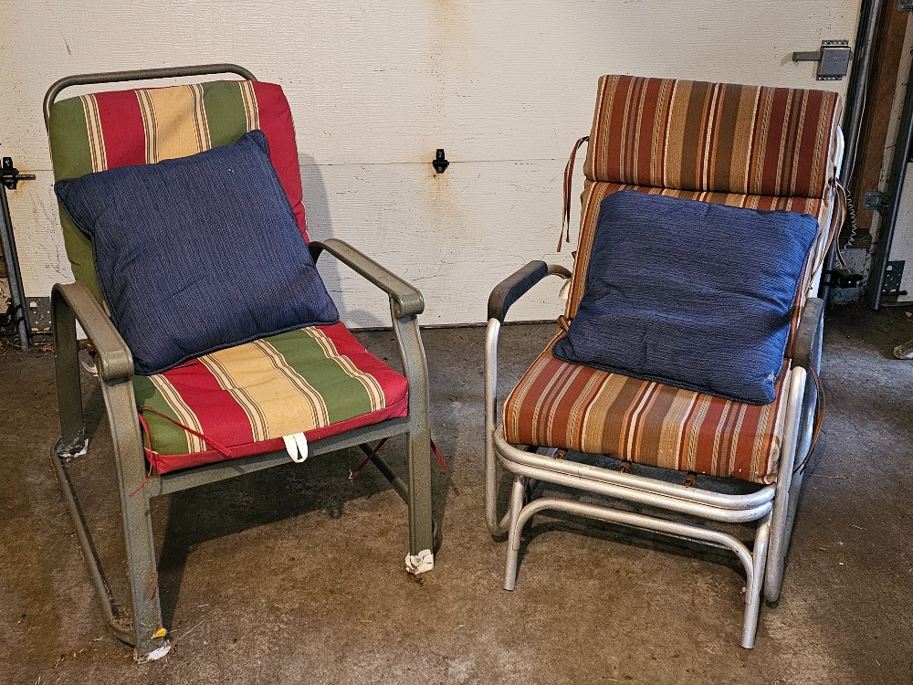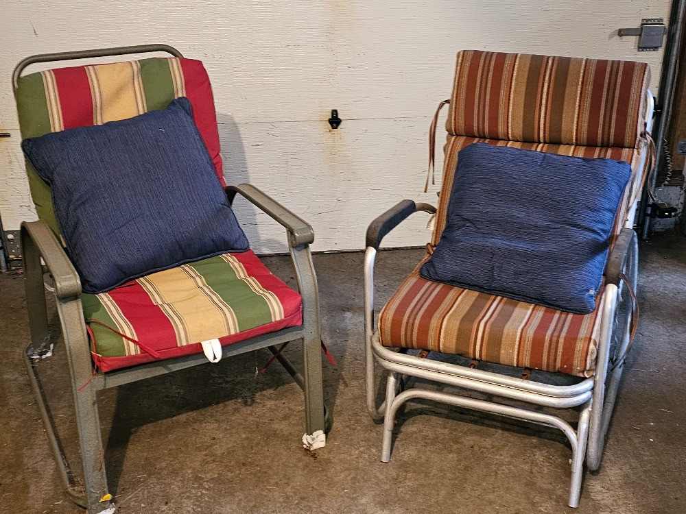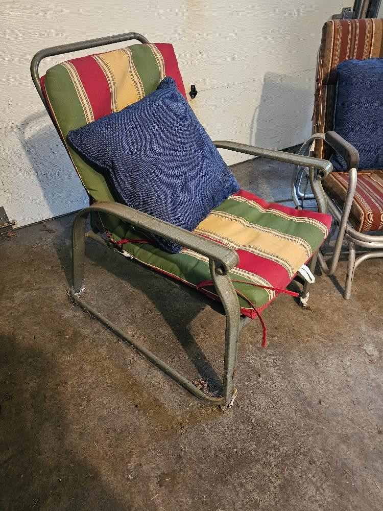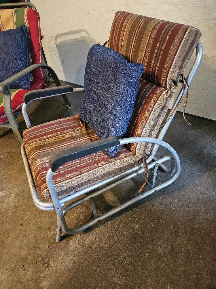 (2) Unmatched Patio Or Deck Chairs (1) Silver aluminum glider with cushion & pillow - 36"T x 24"W x 33"D (1) Grey metal chair with cushion & pillow - 37"T x 24"W x 33"D Both in good used condition
