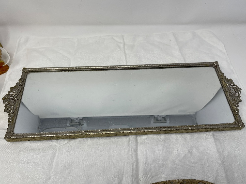 Vintage Mirror Vanity Tray measures 18”x6.25” With 9 Perfume Bottles.