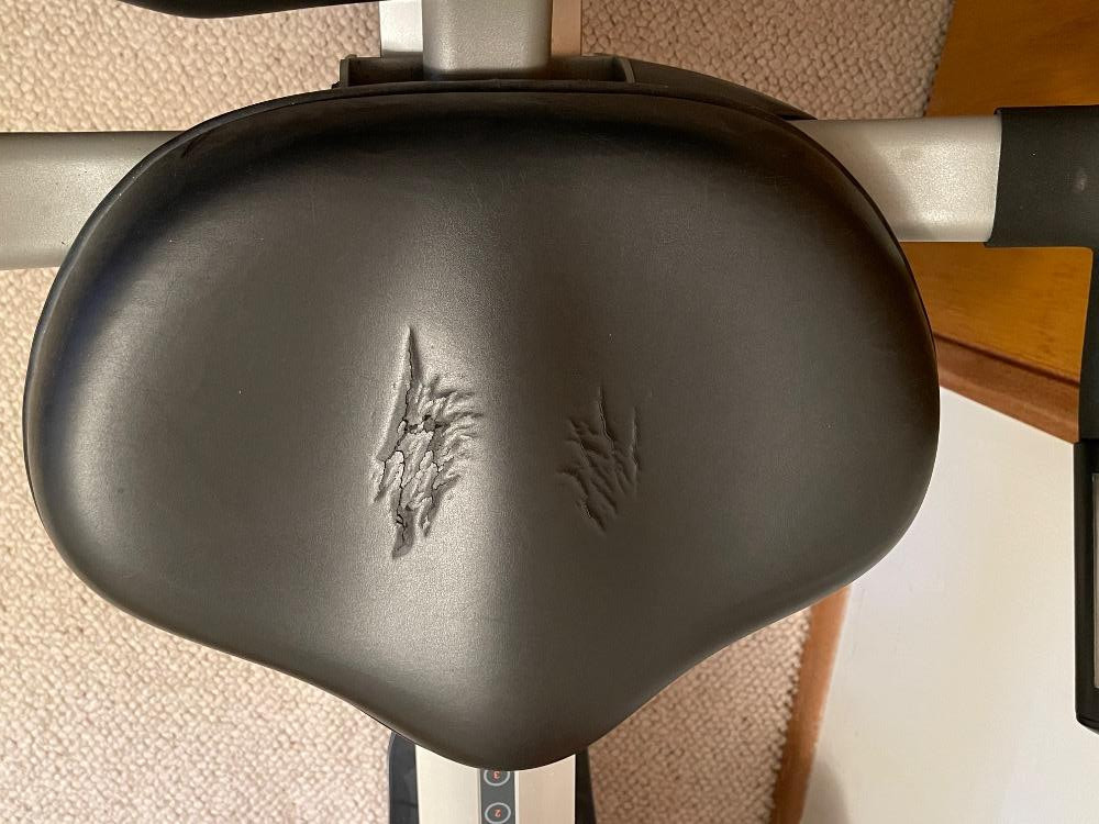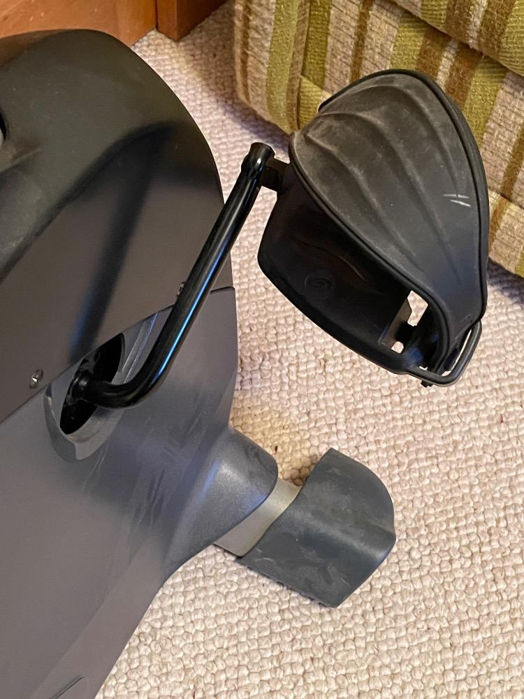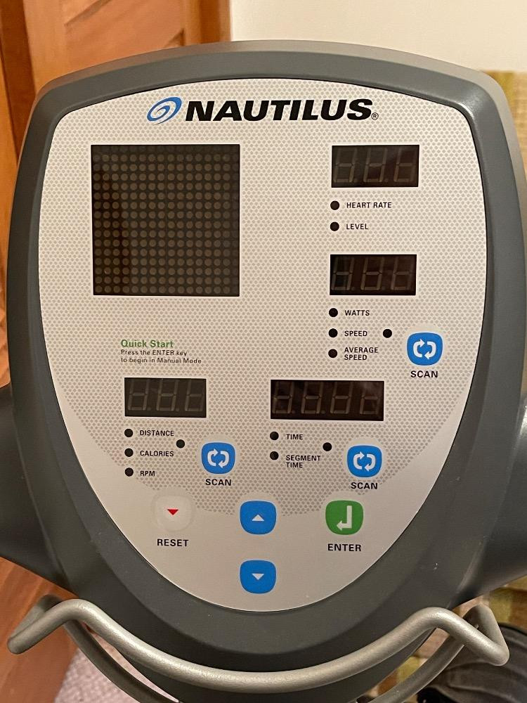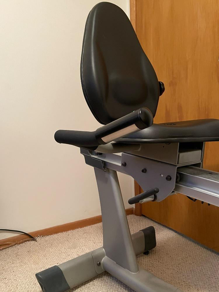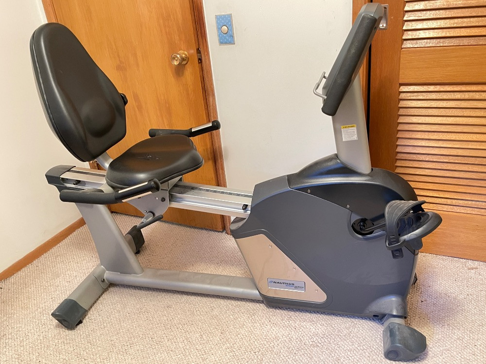 Nautilus Sport Series NR2000 Exercise Bike. 44"T x 54”L x 25”D Tips up on end for compact storage. Some seat wear but a solid, stable and fully functional recumbent-style bike.