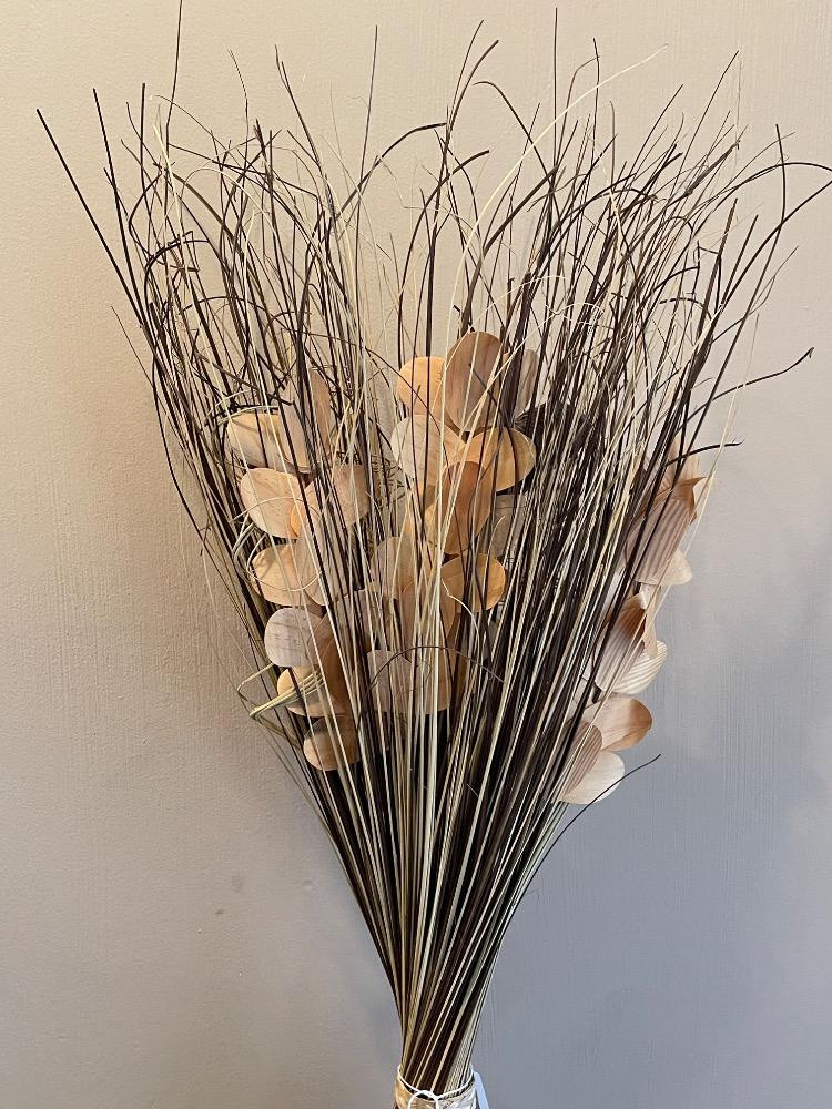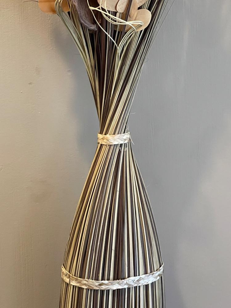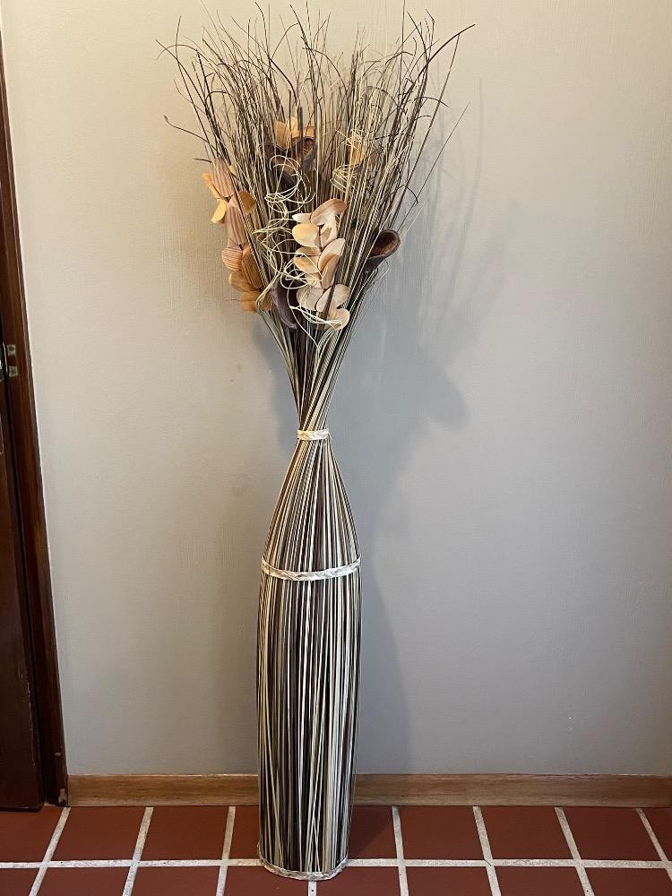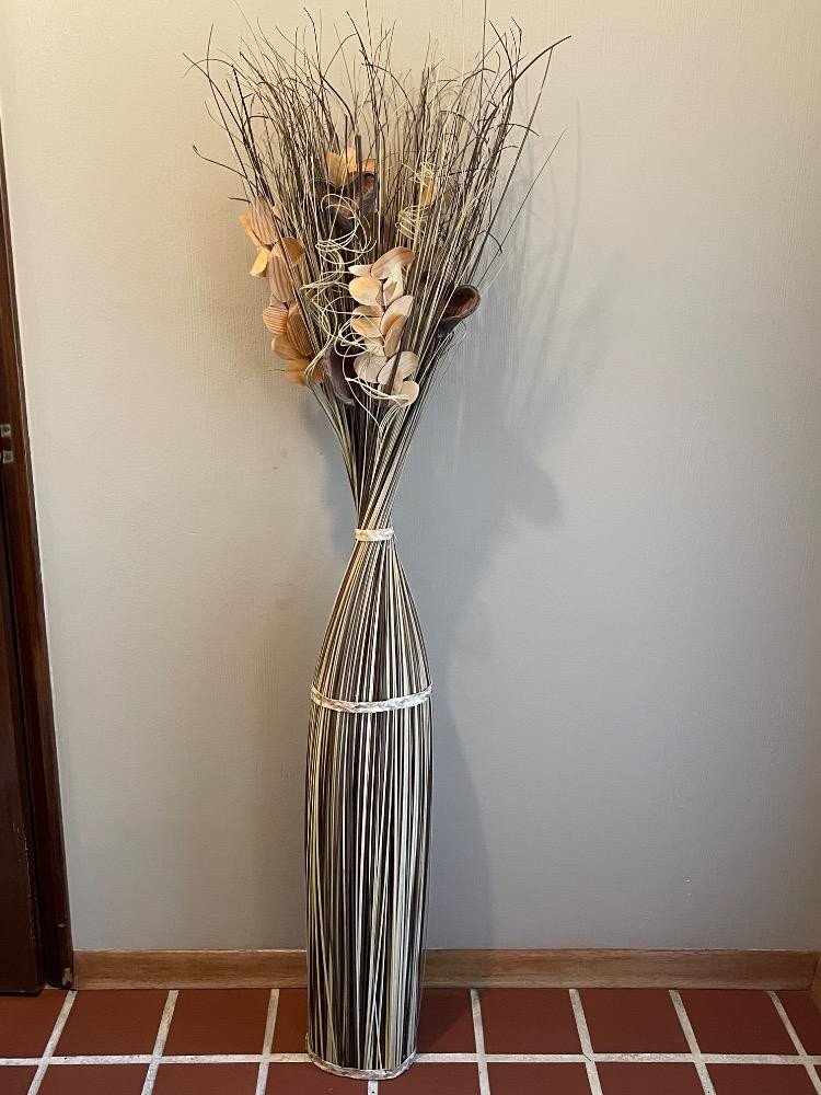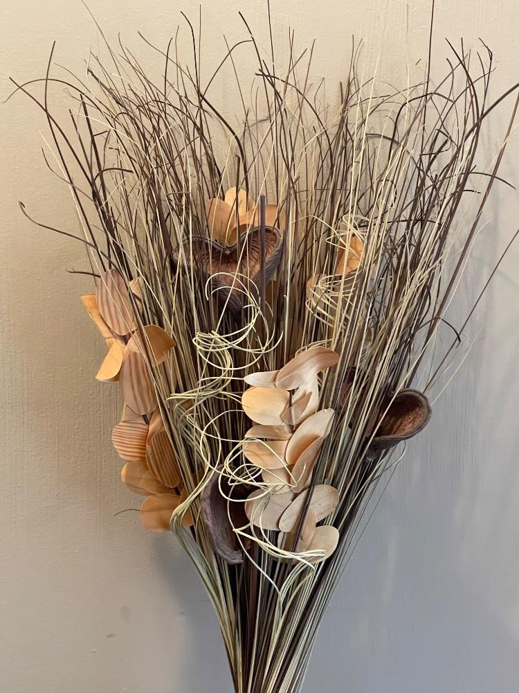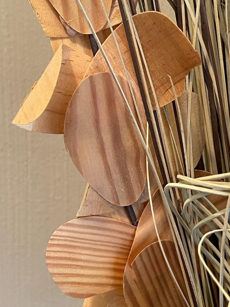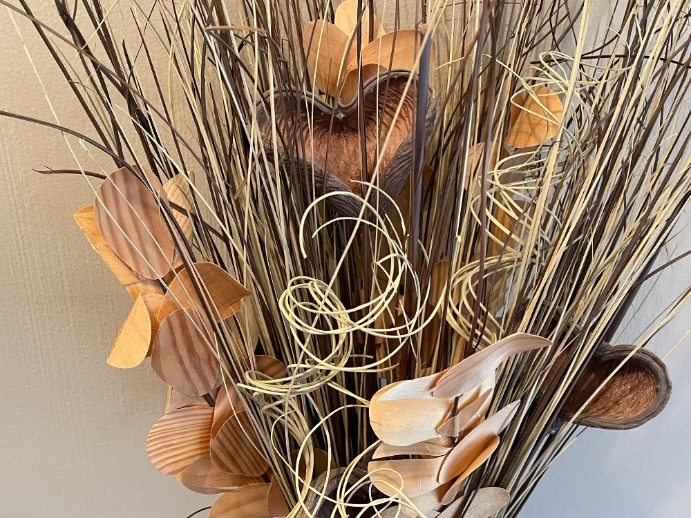 Tall Twisted Grasses with Wood Leaves and Flowers. Great corner decor! Measures 7”x5”base, 58” tall.