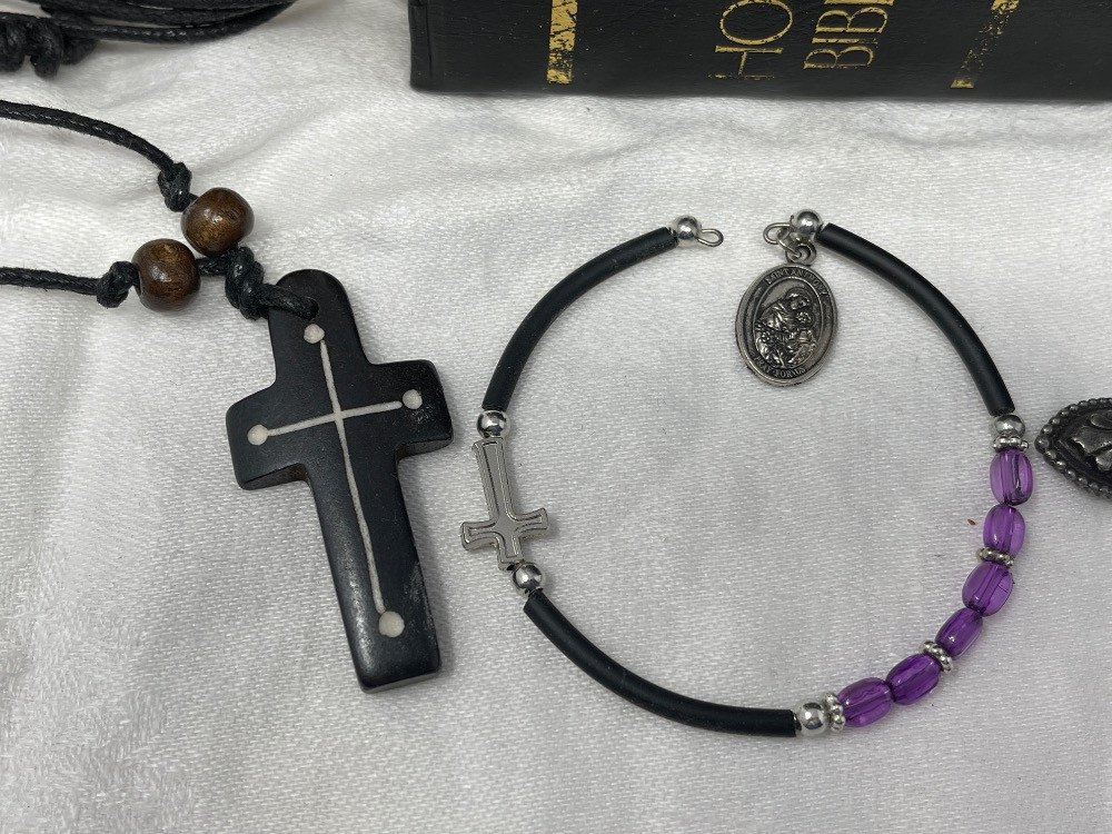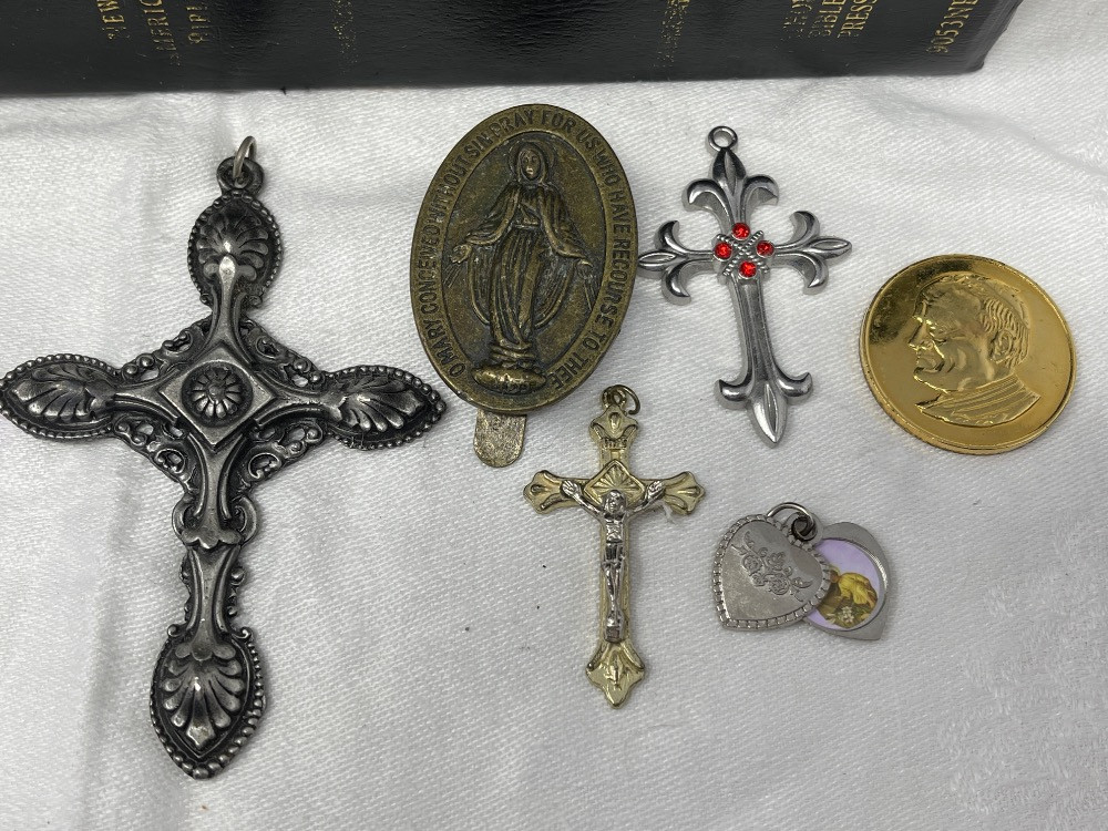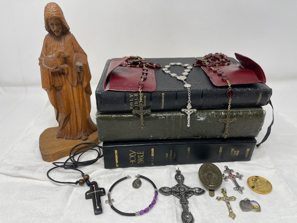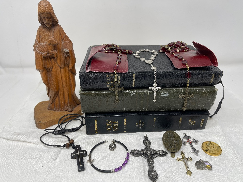 Lot # 75 - Bibles - Rosaries - Amulets - Pendants - Carved Wood Jesus Statue