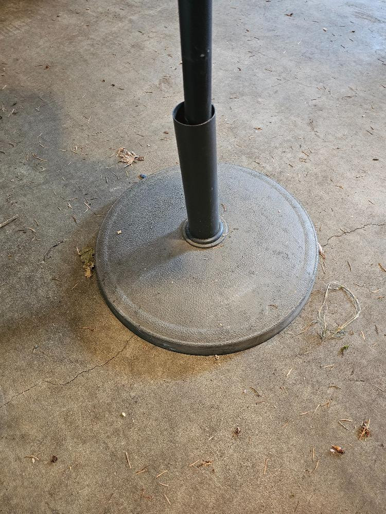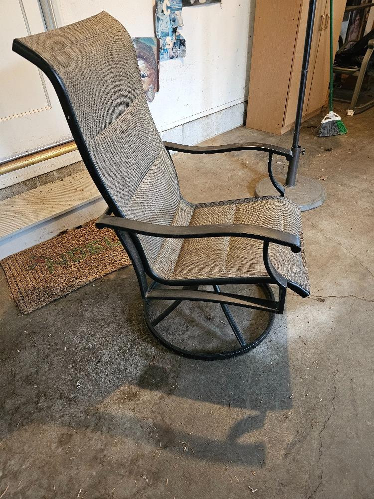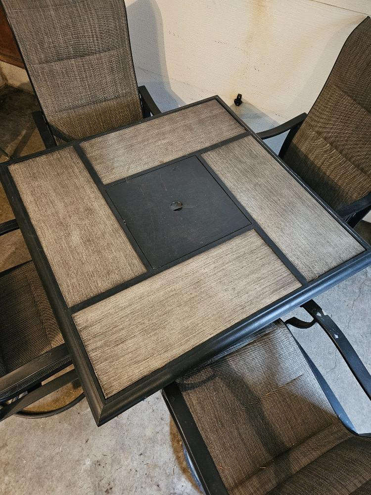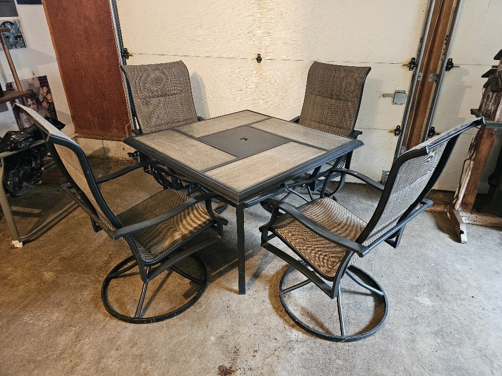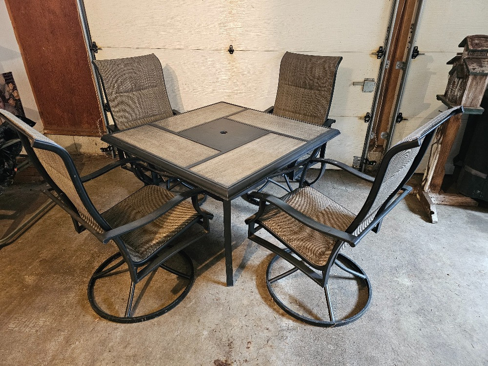 Outdoor Patio Table, Chairs & Umbrella Metal-framed table with metal wood-like panels in the top (4) Heavy metal swivel & rocking chairs Umbrella (canvas Umbrella material needs a cleaning) & weighted base Table is 28.5"T x 42"W x 42"D Nice condition!