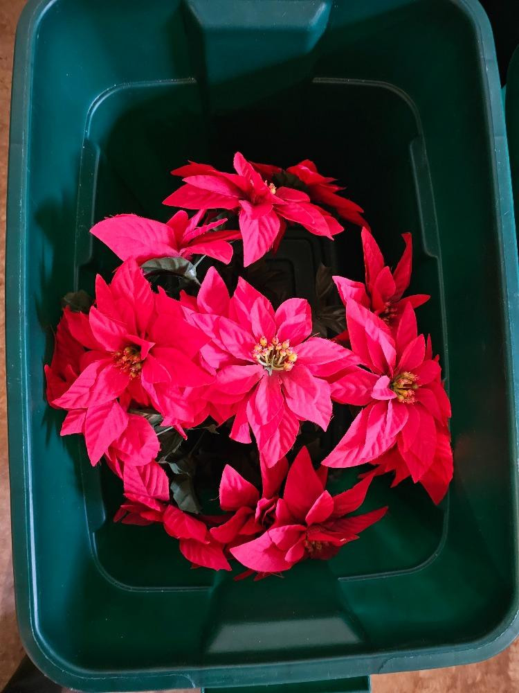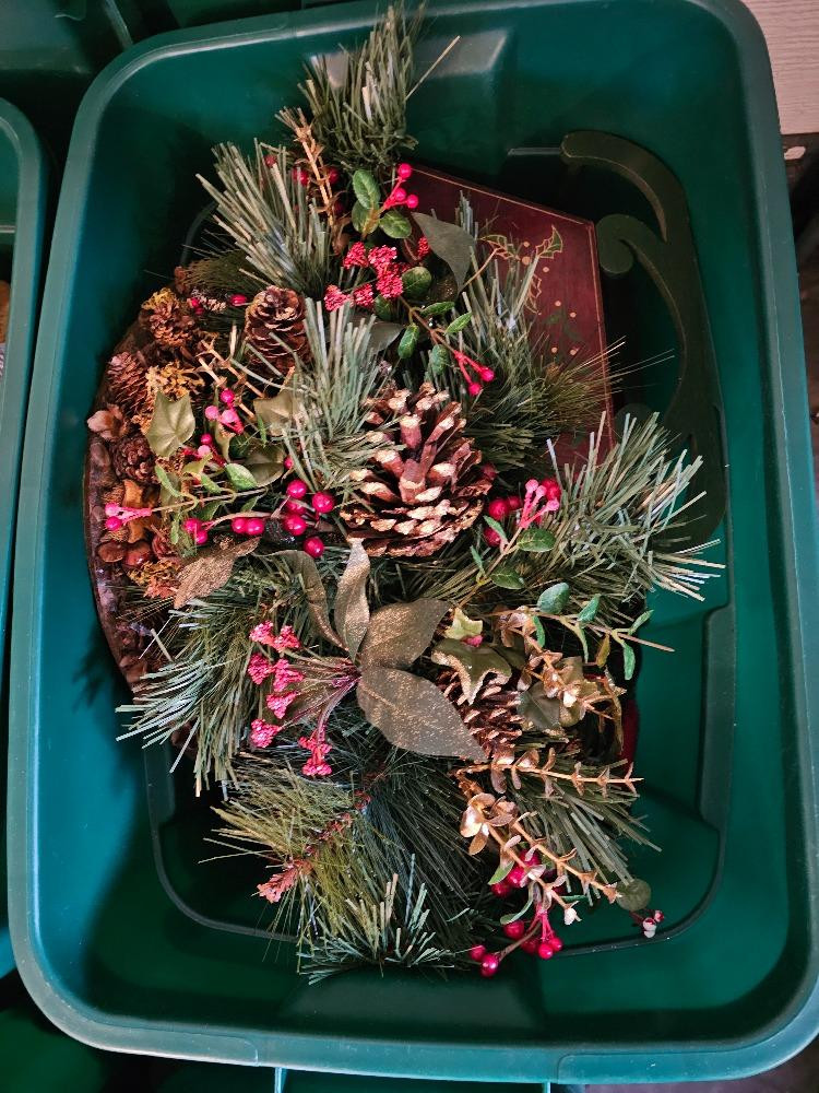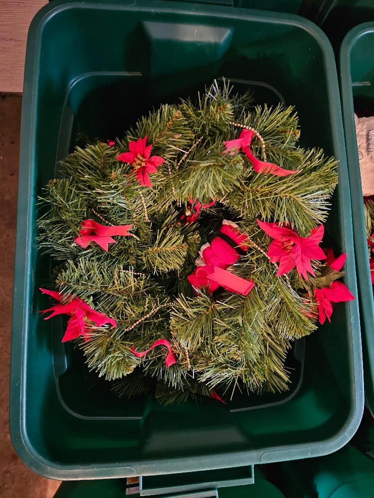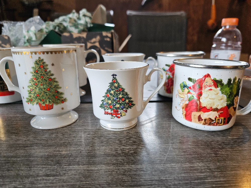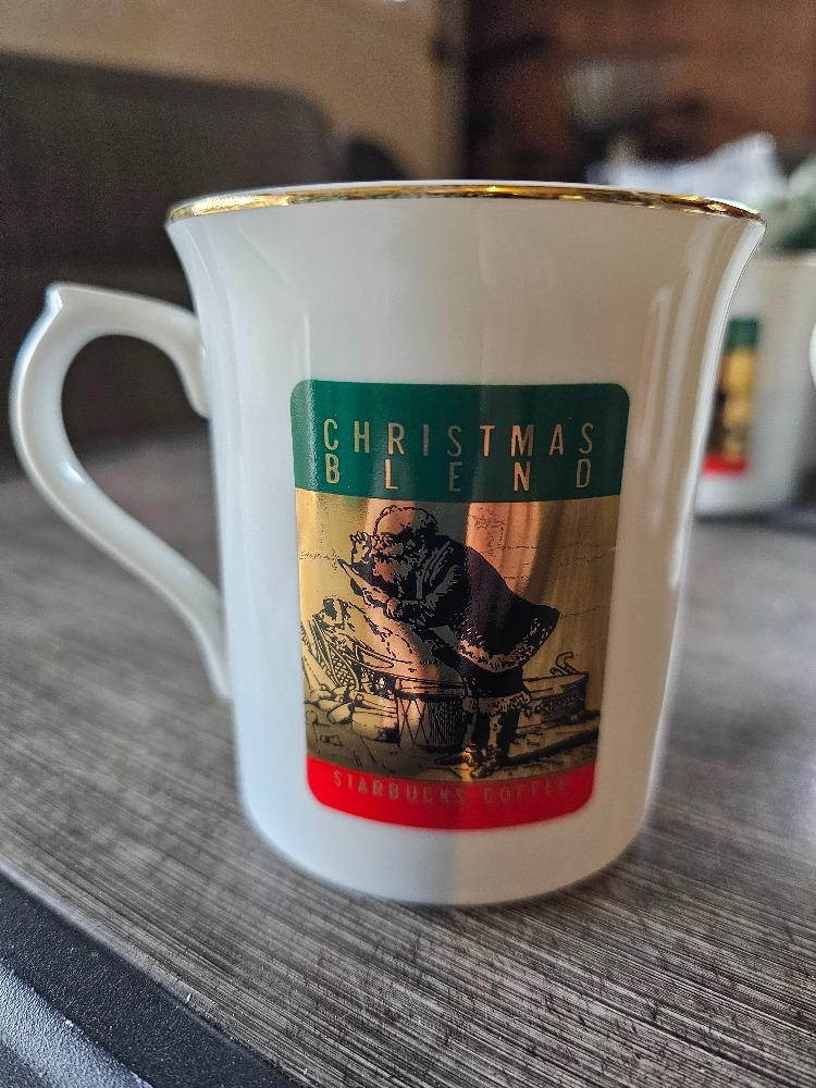 (6) Totes Of Christmas Ornaments, Christmas Cups, Lights & Decorations (3) 1990s Starbucks Christmas Blend coffee cups (6) Other Christmas cups/mugs Christmas tree ornaments Untested Christmas lights Stuffies & faux greens Faux poinsettia & Christmas wreaths Large live Christmas tree stand