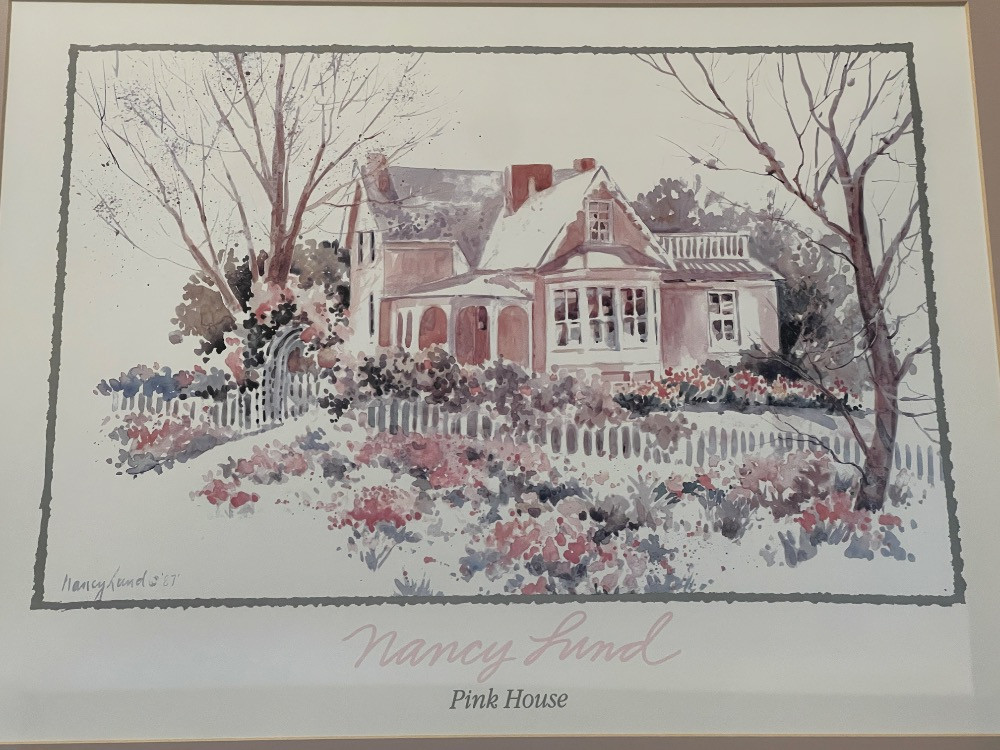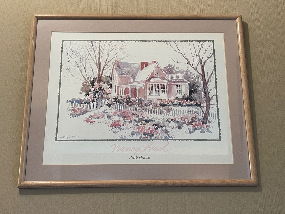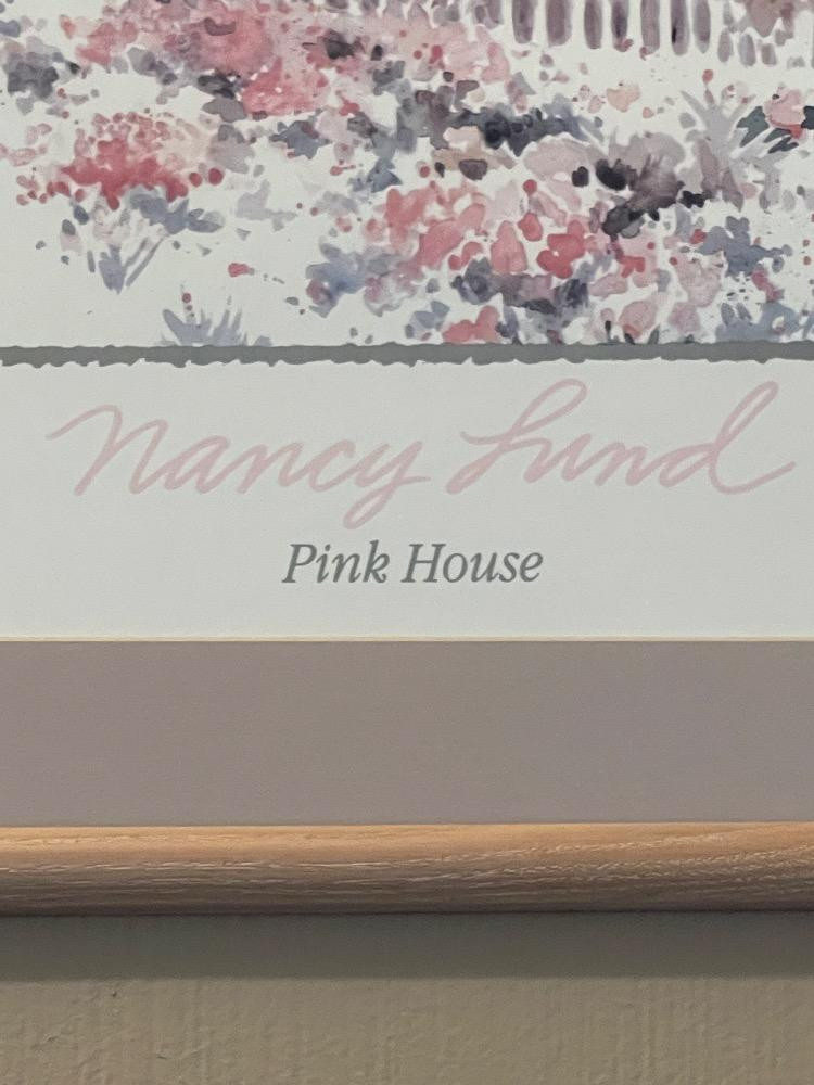 "Pink House", a signed lithograph by Nancy Lund. Measures 21” x 17” .