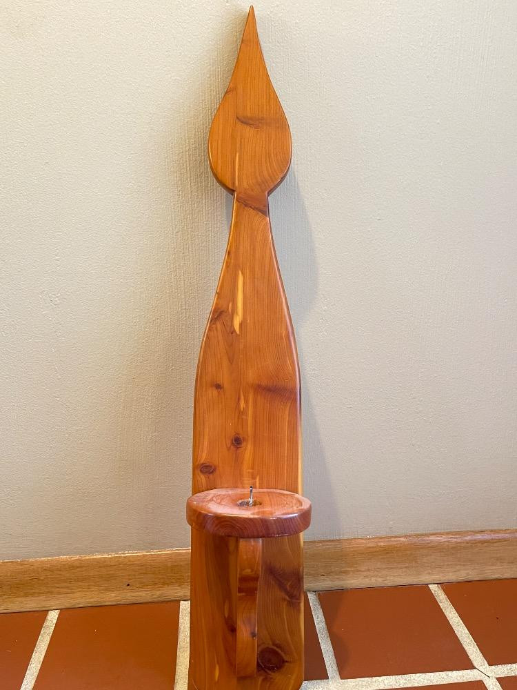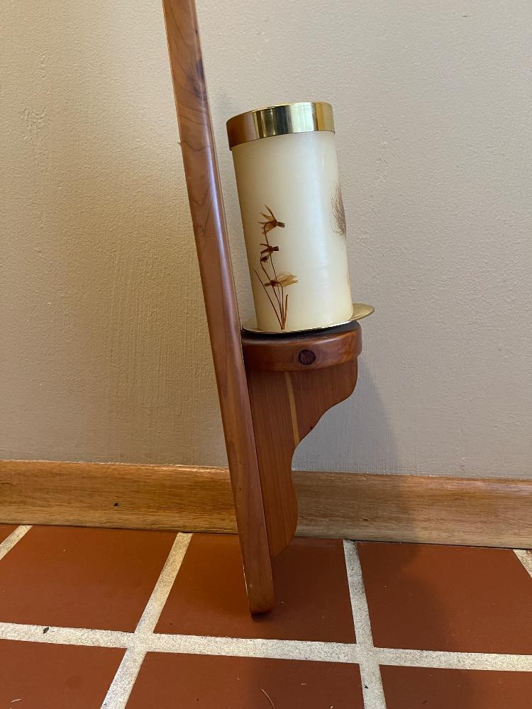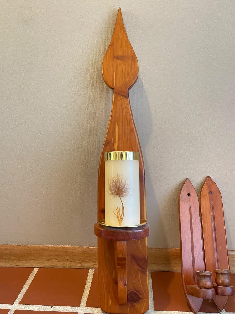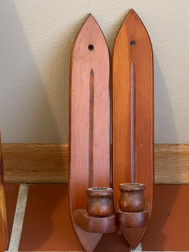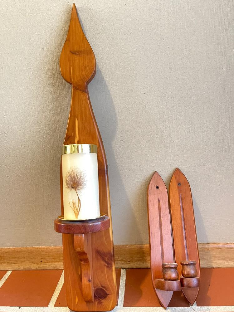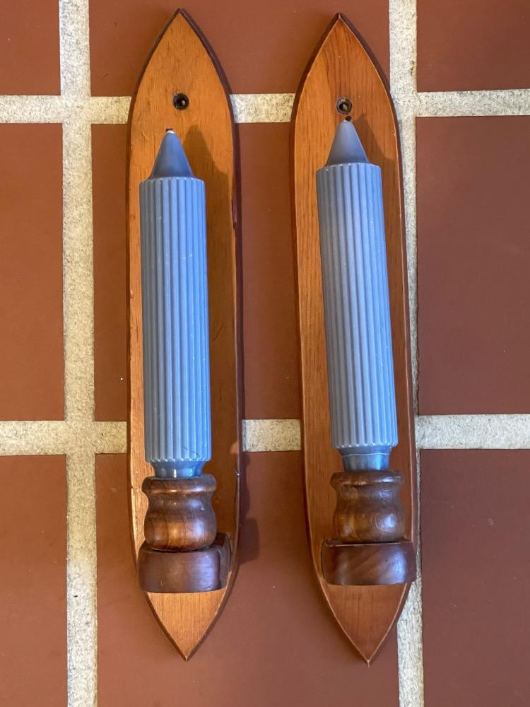 3) Hand Crafted Wood Wall Candle Holders 2.25”x13” Pair of candle holders with blue candles