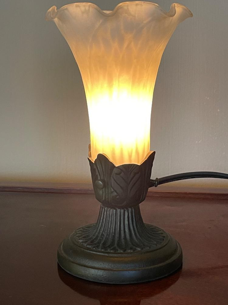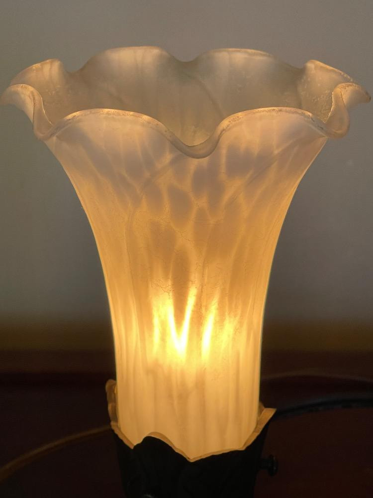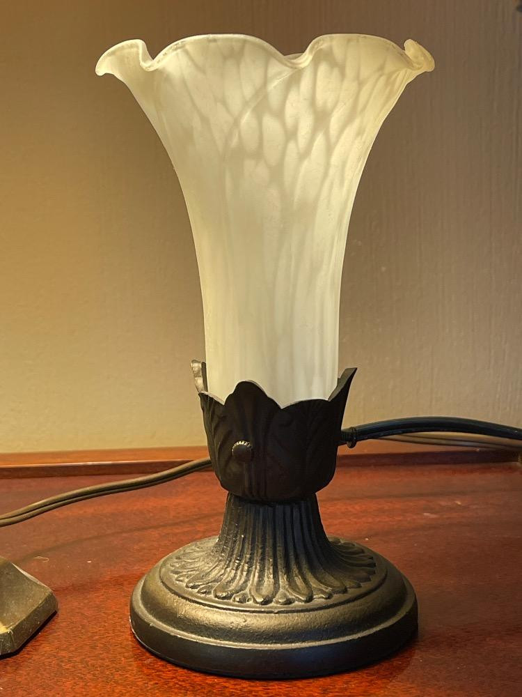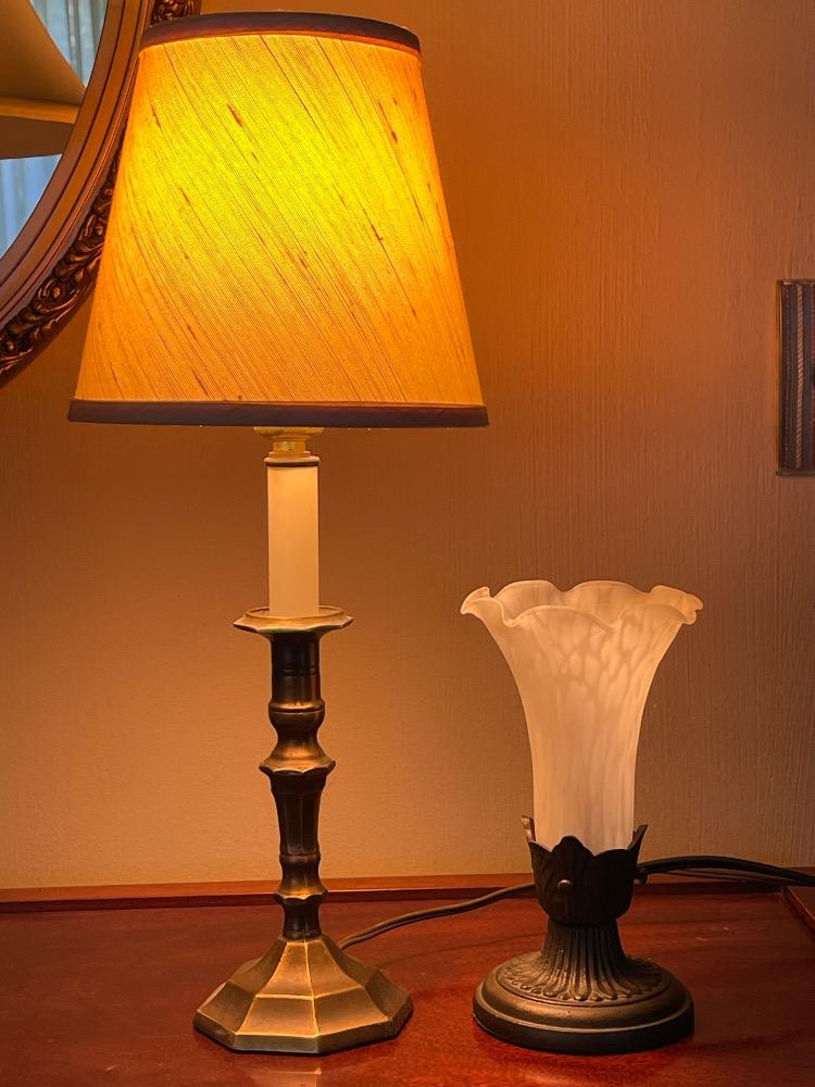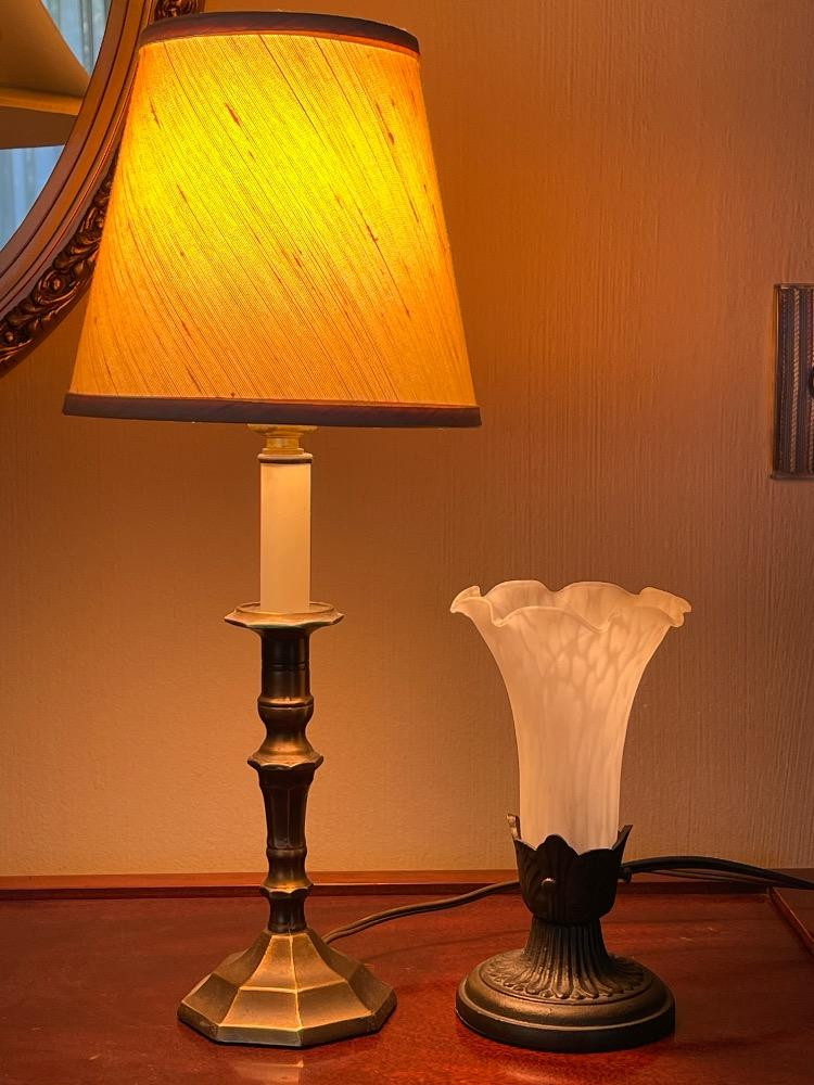 Brass Candlestick Lamp & Uplight With Glass Shade. Candlestick lamp is 17.5” with 3.75” base and 7” shade. Uplight measures 8” tall 3.75” base. Both tested and work.