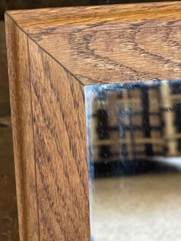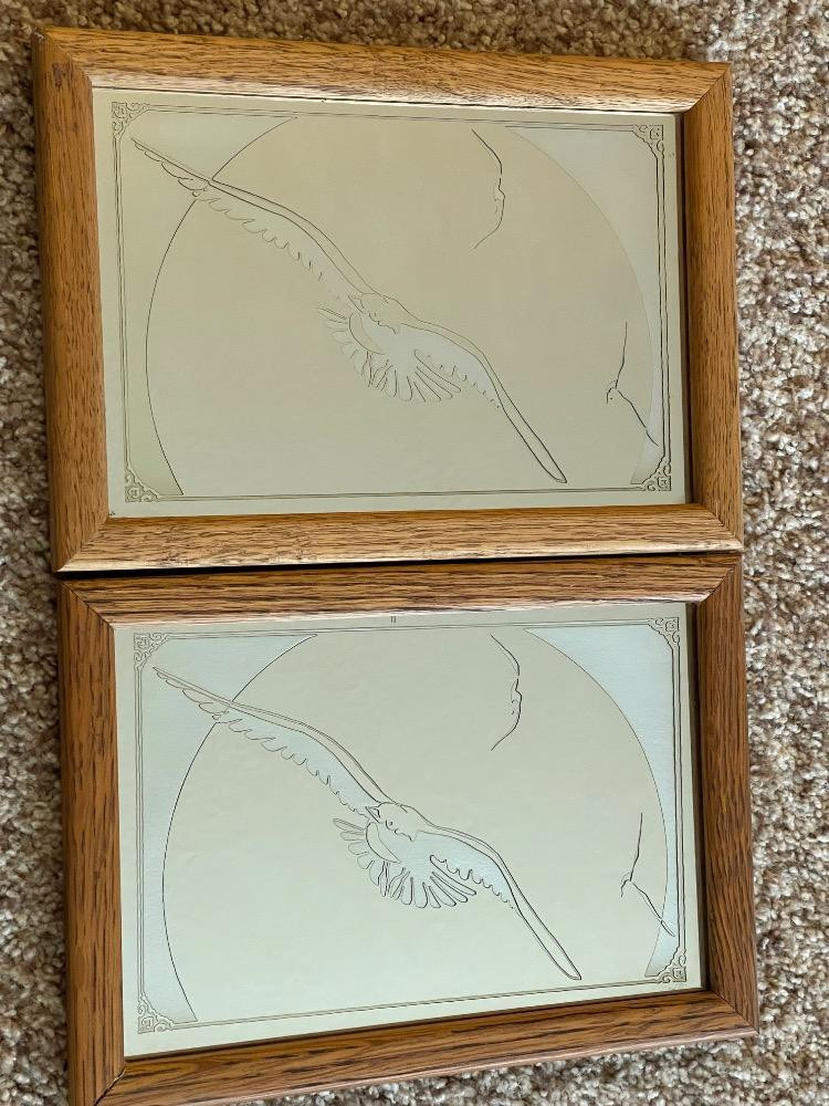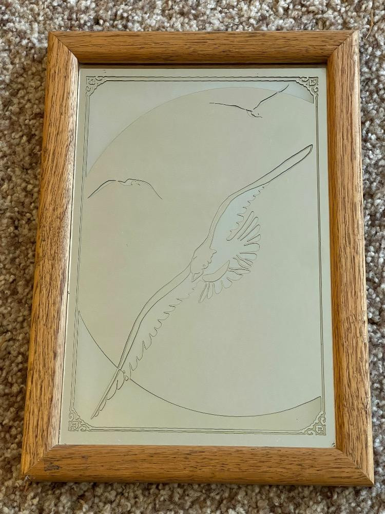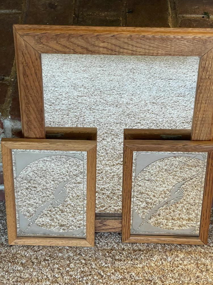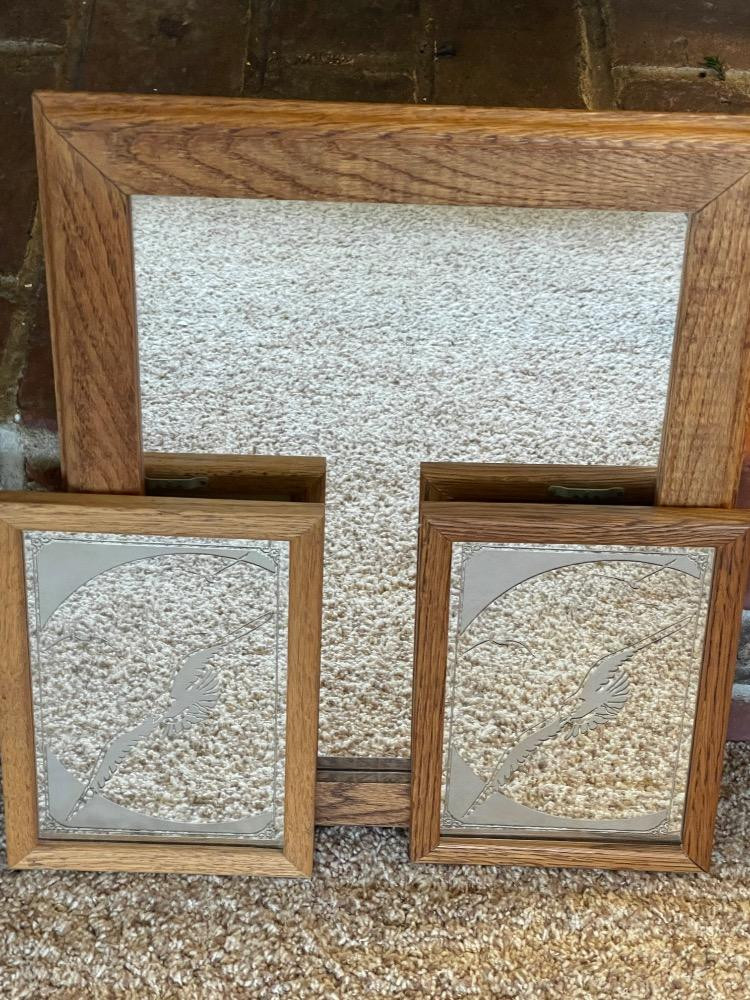 Oak Framed Mirrors With Etched Seagulls. Large oak framed mirror measures 14.5“ x 18.5“. (2) Seagull small mirrors measure 7“ x 10“ each.