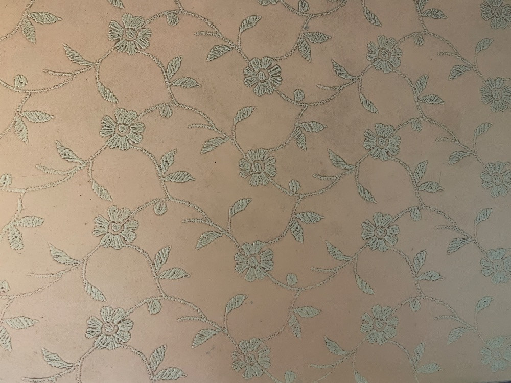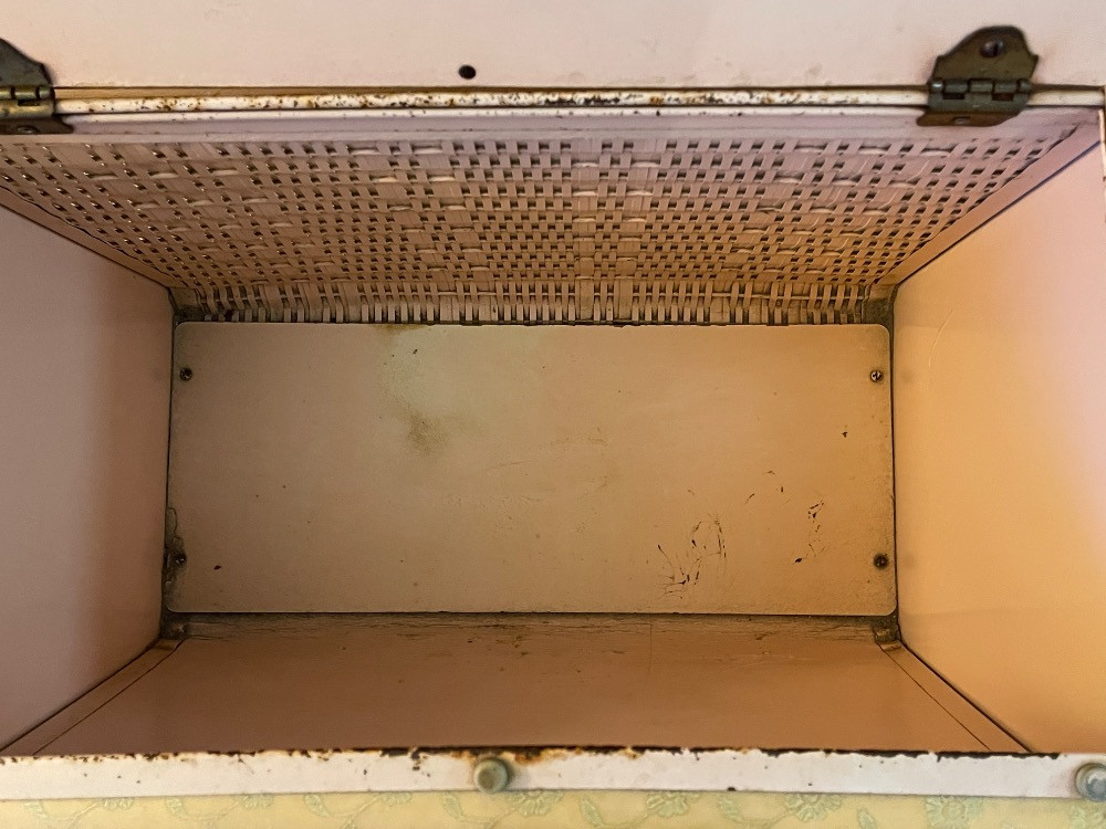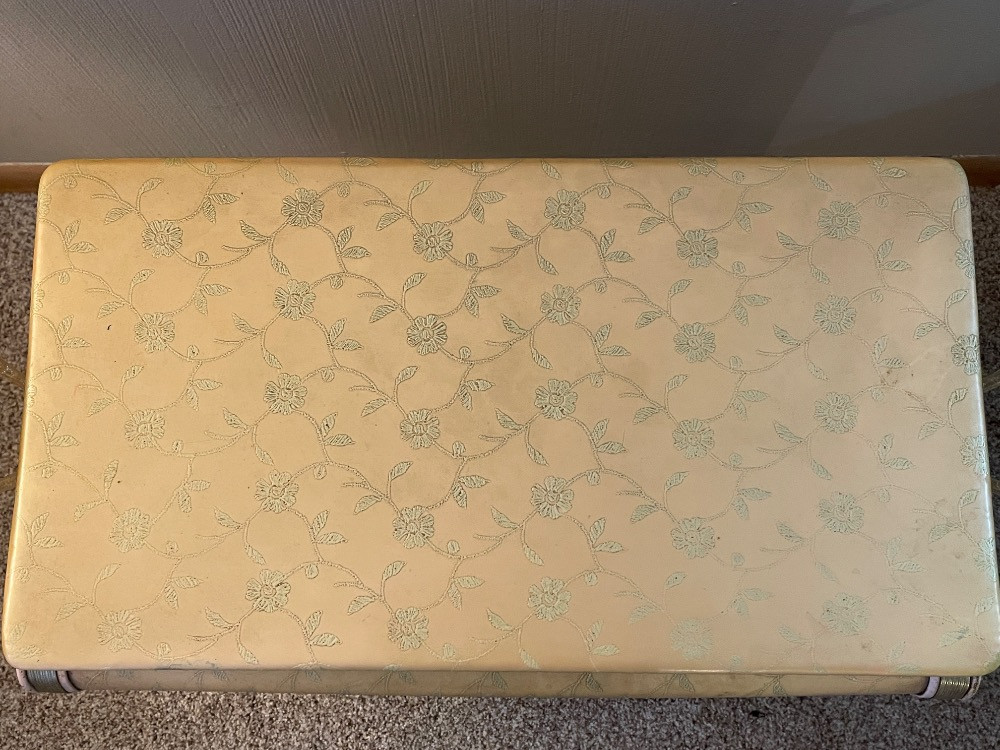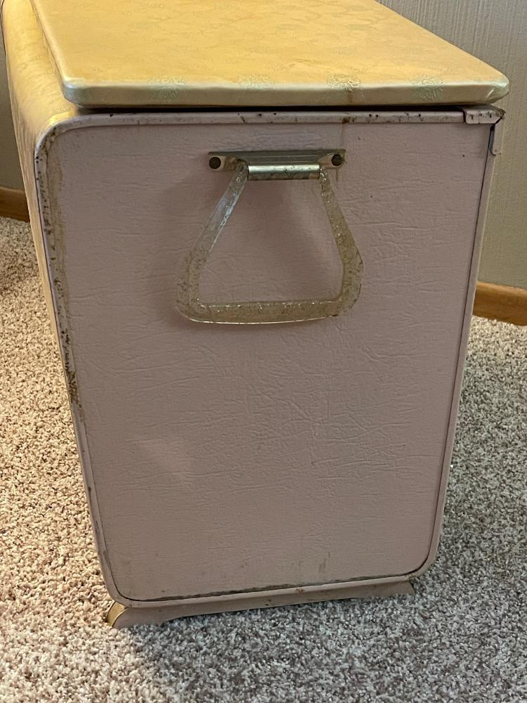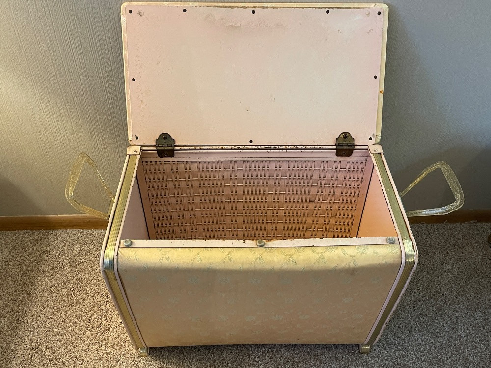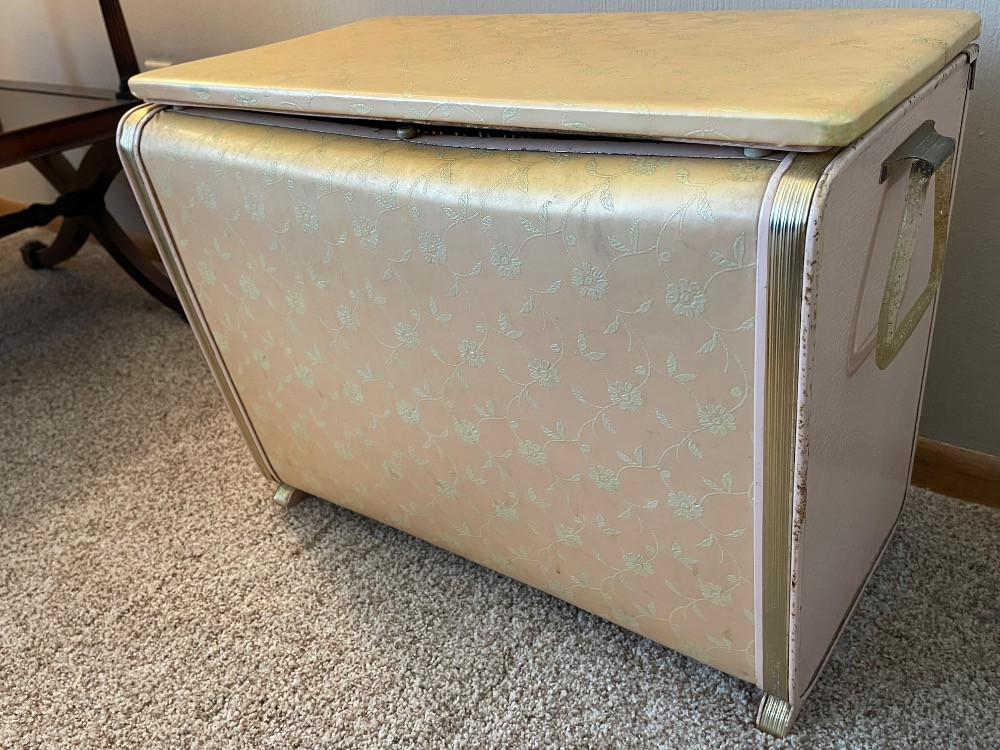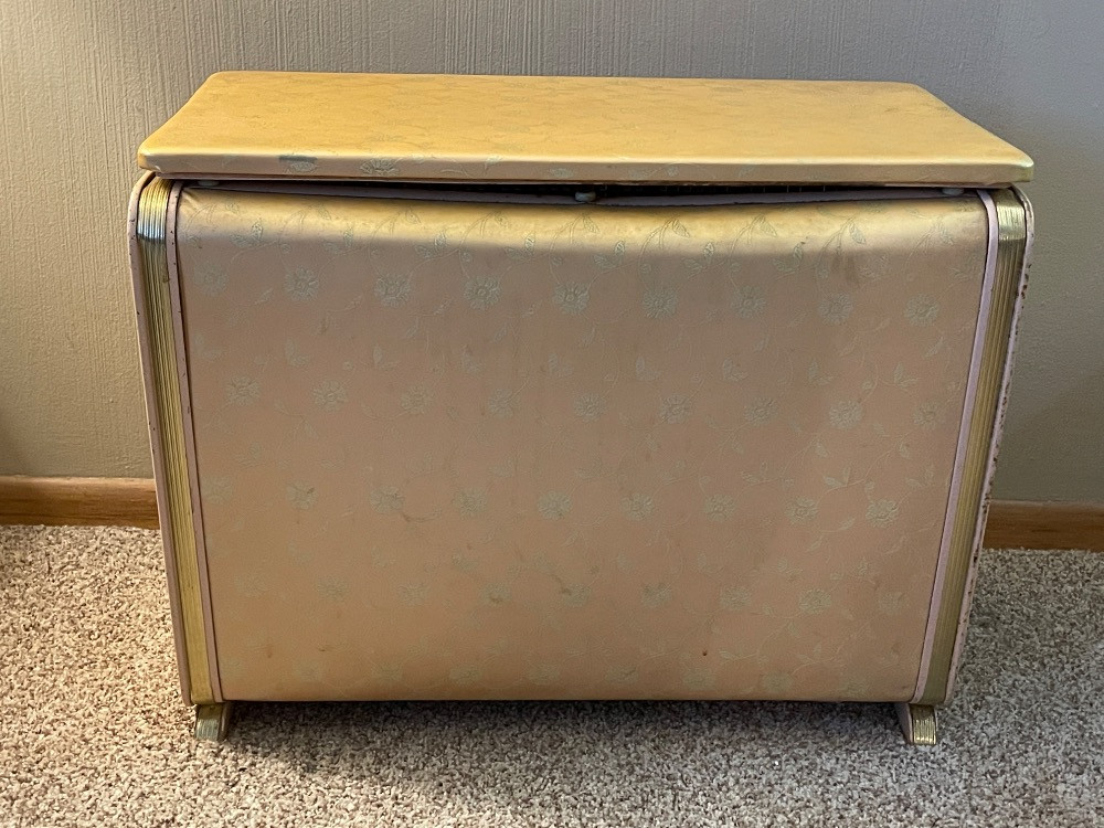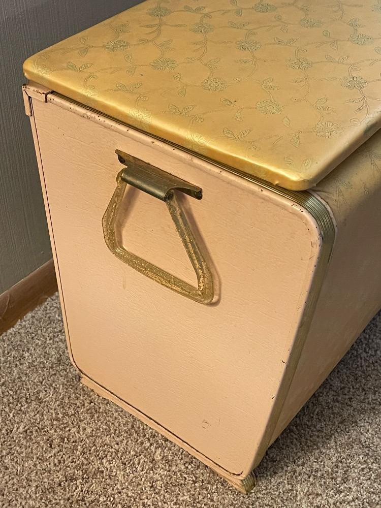 Vintage Clothes Hamper Bench with metal body, Lucite side handles and textured floral vinyl top in a light pink/peach color.