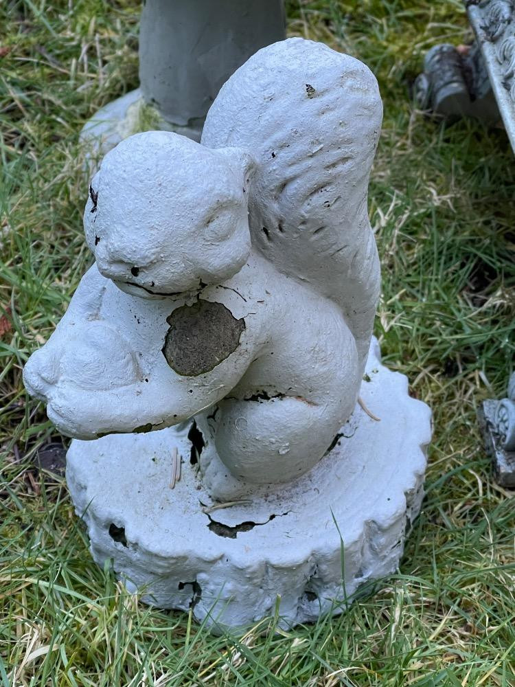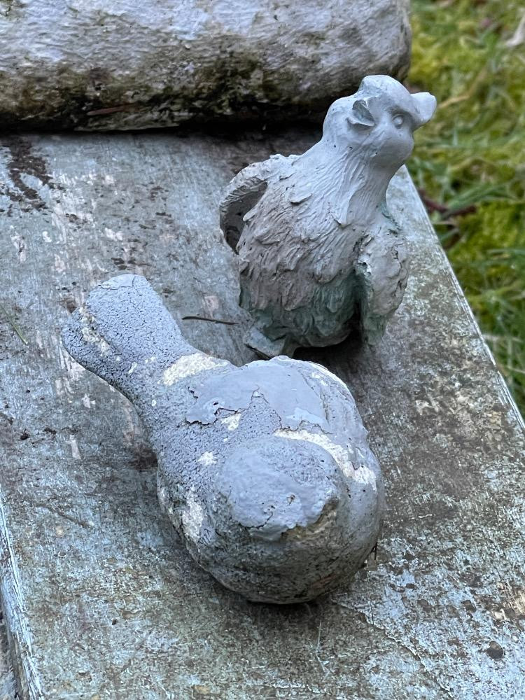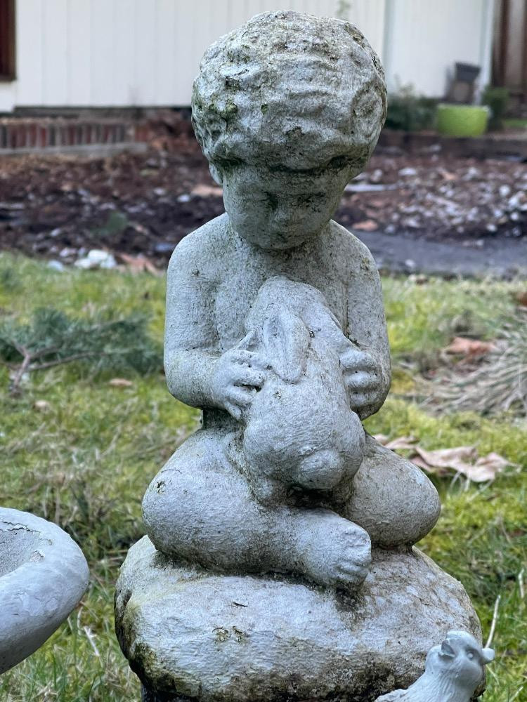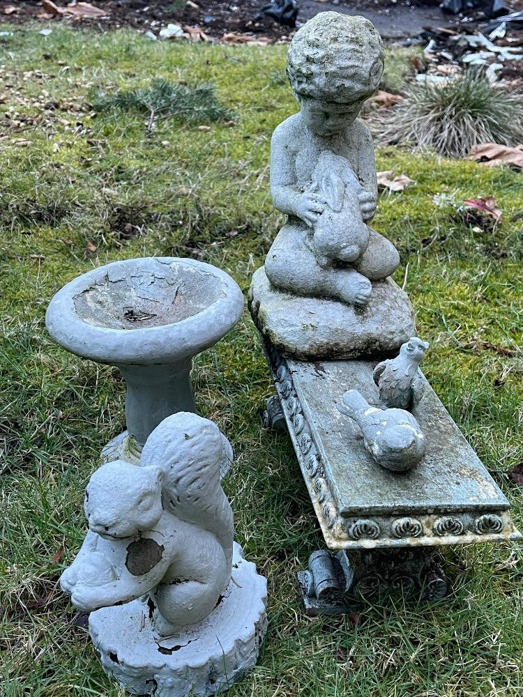 4 Small Cement Garden Figures & Composite Plant Bench Boy with Bunny is 11” tall Mini bird bath with 2 birds Plant bench is composite