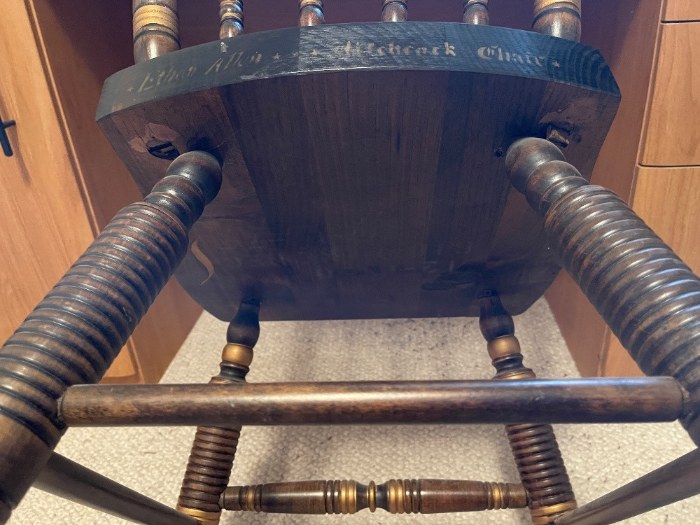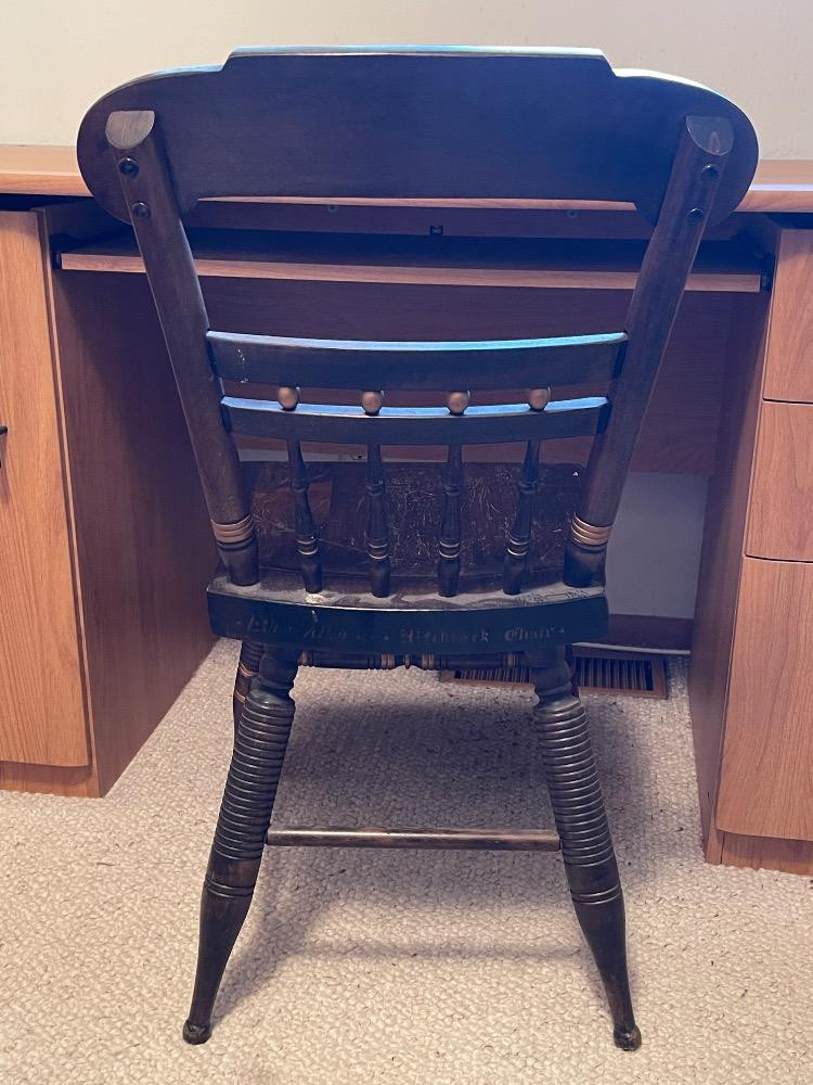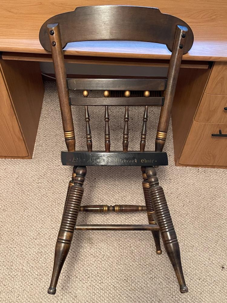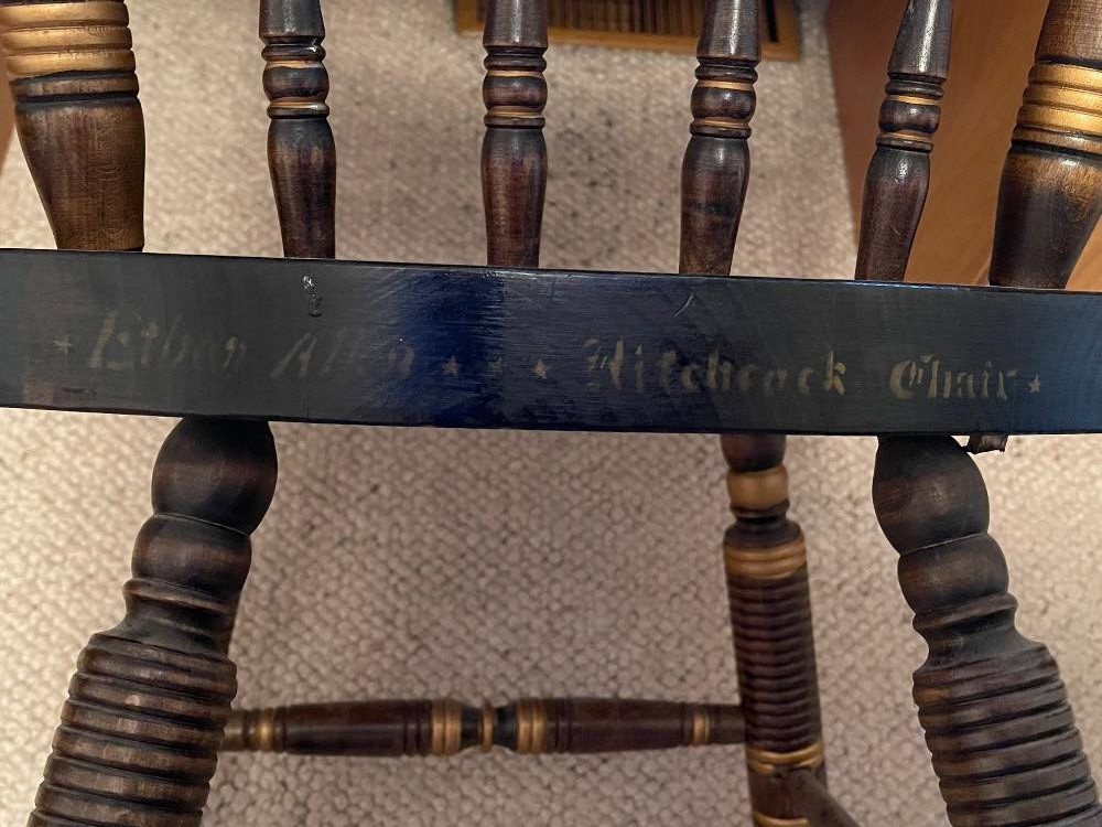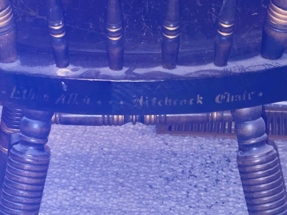 Ethan Allen Hitchcock Chair named after Lambert Hitchcock (1795-1852) an inventor who started the "Fancy Chair" Craze of the 1800's. Measures 19” x 18” x 33.5” tall. Ethan Allen Hitchcock Chair is painted on the back.