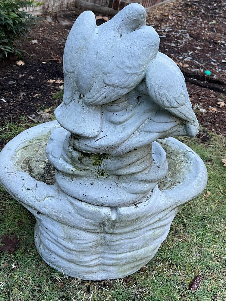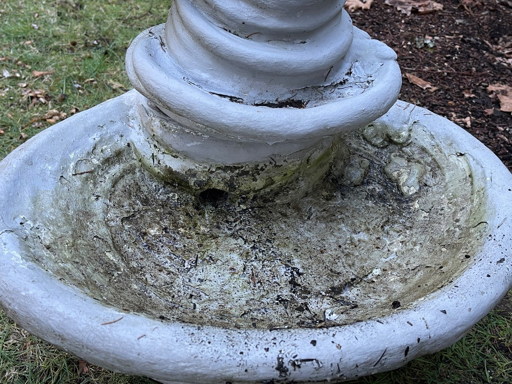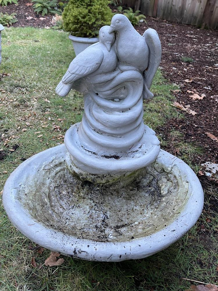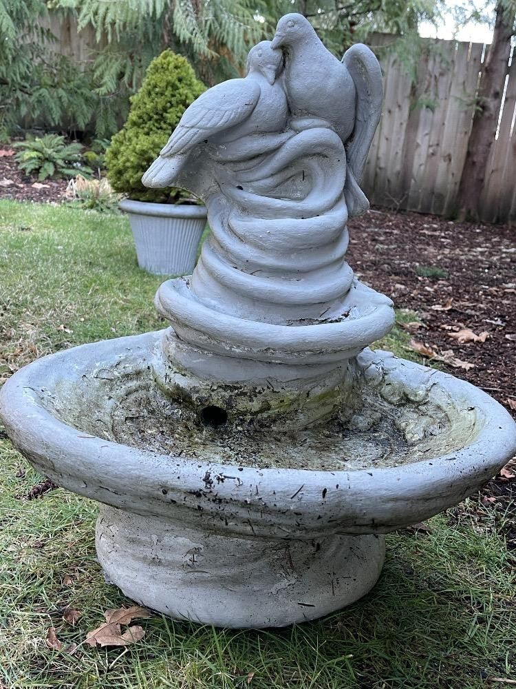 Low profile fountain without pump measures 23“ x 19“ x 26.5“ tall. Needs cleaning and appears to have been painted, paint is peeling and chipping.
