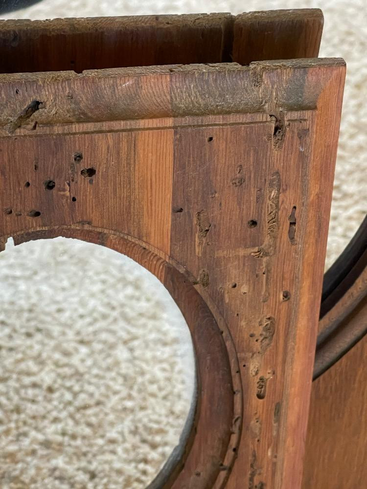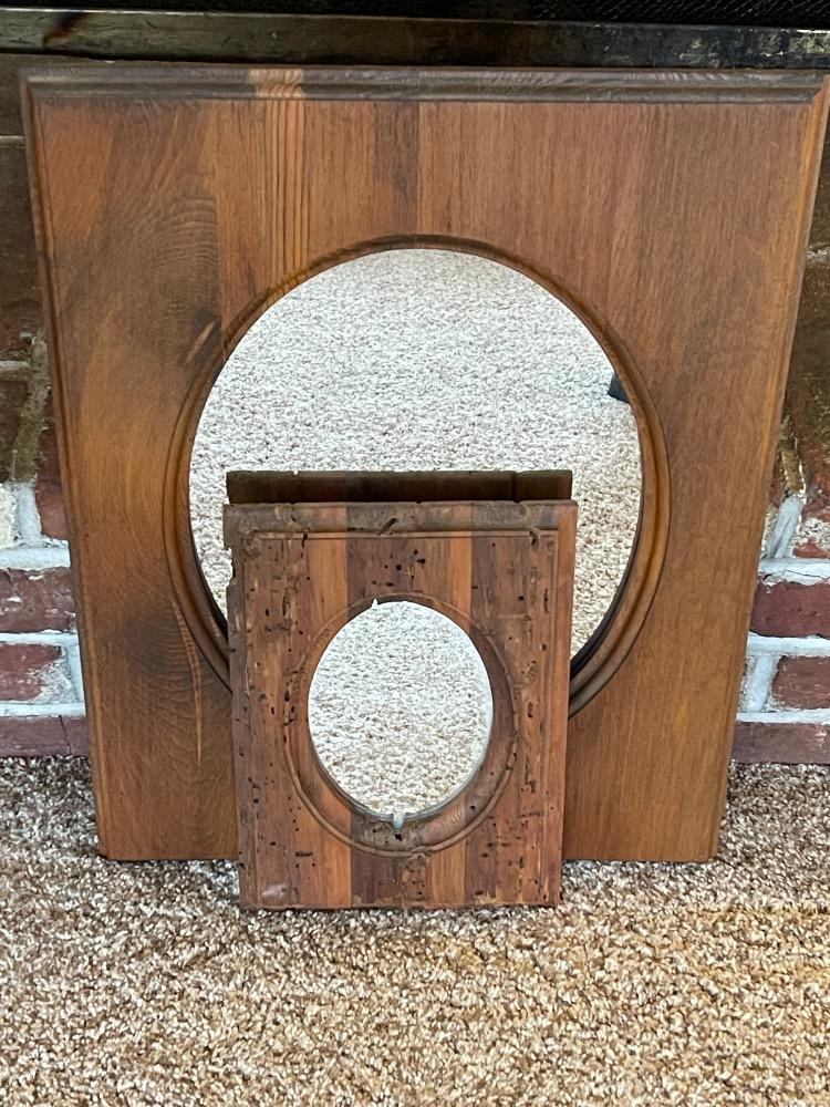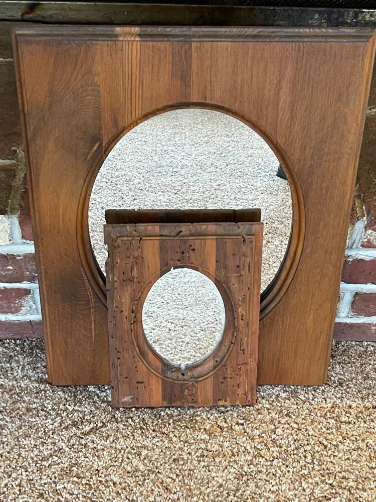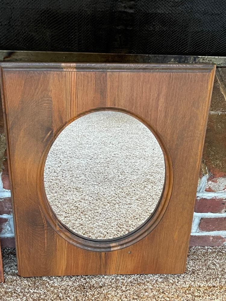 Two Rectangular Frames with Oval Mirrors. The smaller one has a unique worm wood frame and measures 8“ x 11.5“. Larger mirror measures 16“ x 21“.