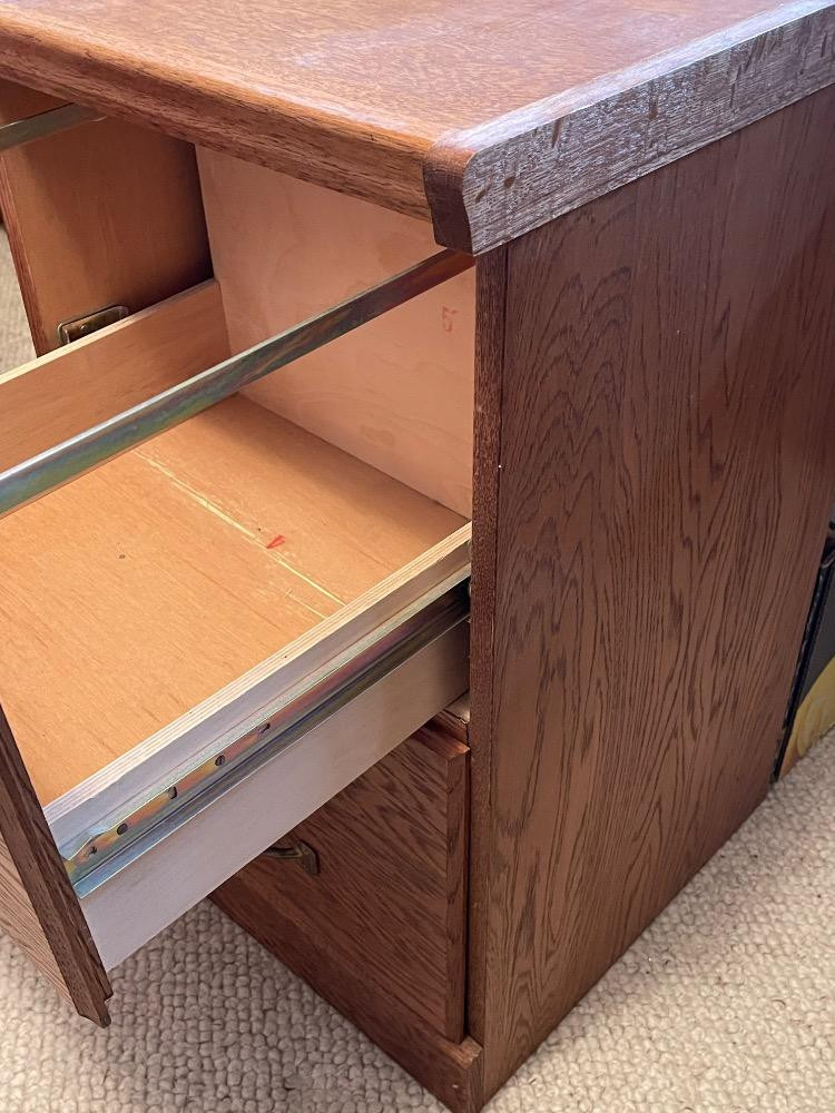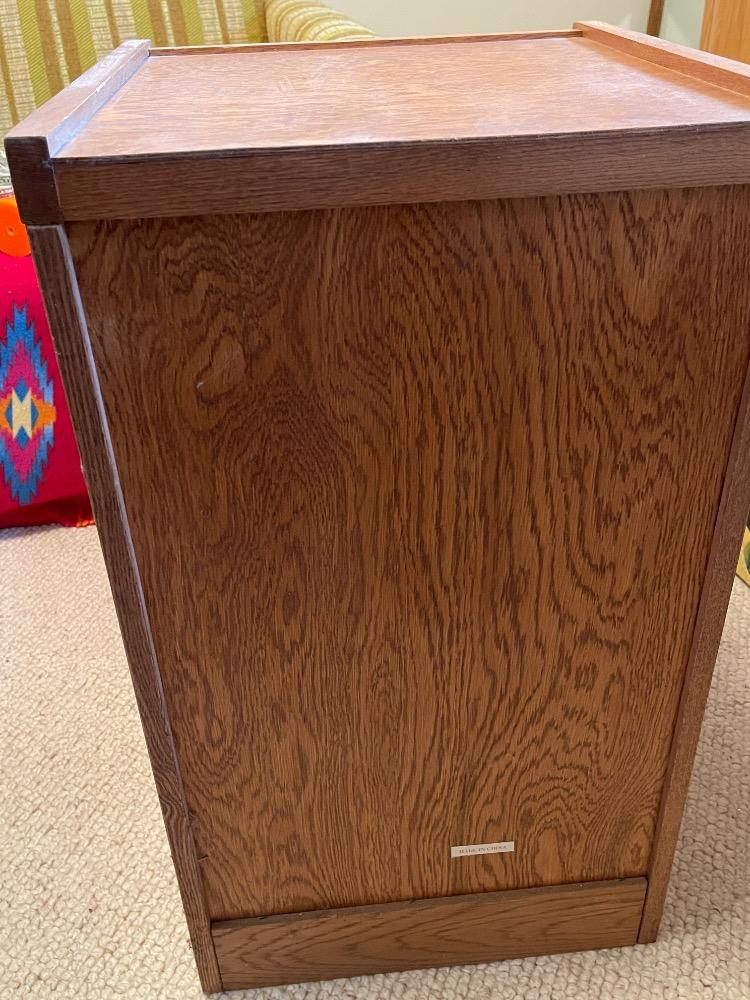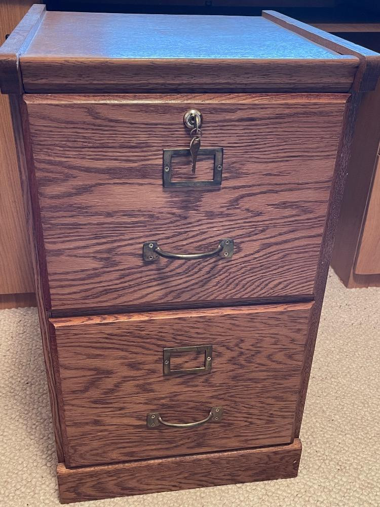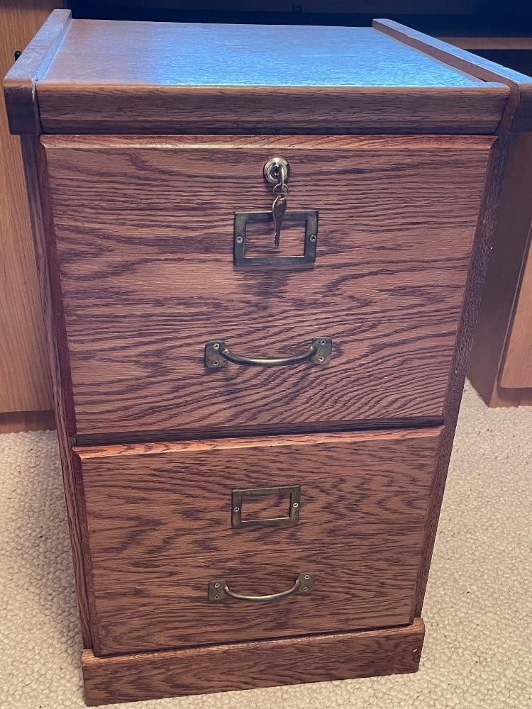2 Drawer Oak Locking Cabinet with keys measures 16“ x 17“ x 27.75“ tall.