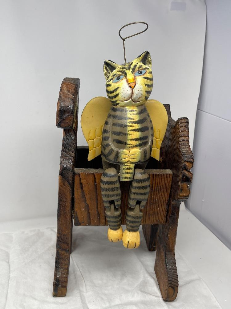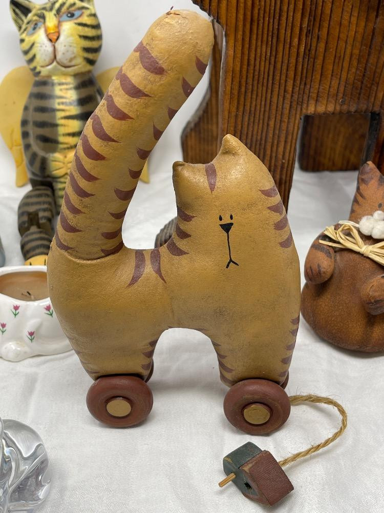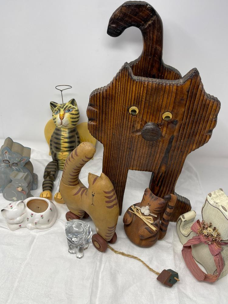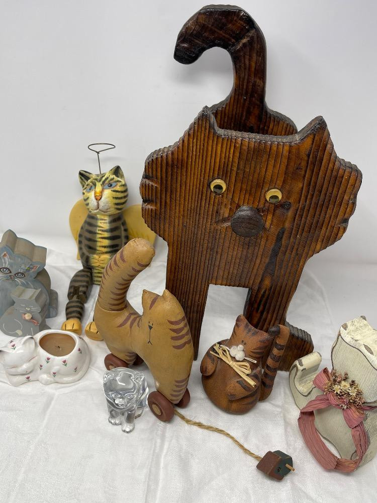 Hand crafted wooden cat planter measures 8.5”x9”x15” 8 additional cat figurines of wood, ceramic, fabric & glass.
