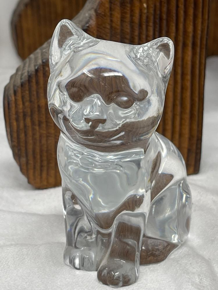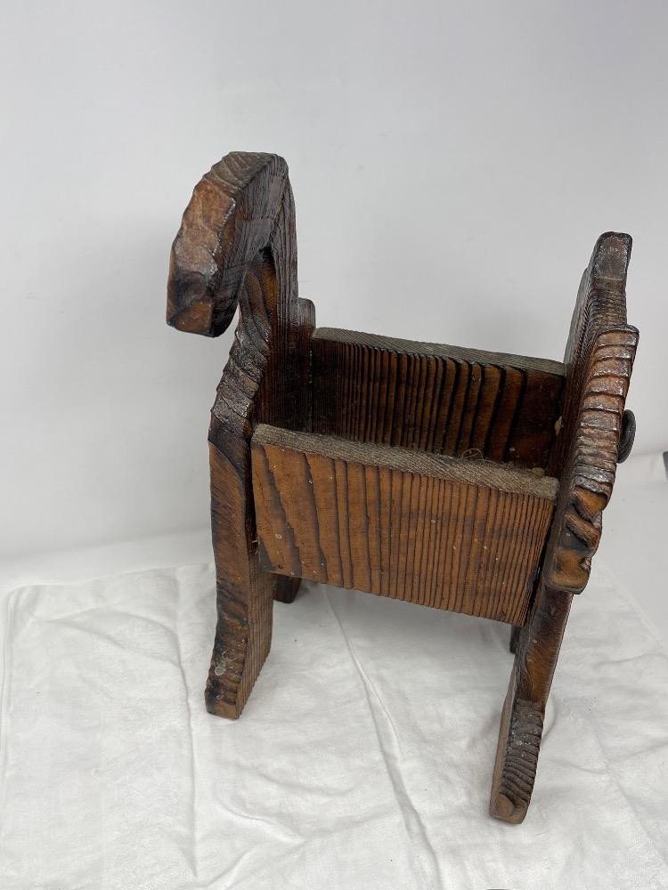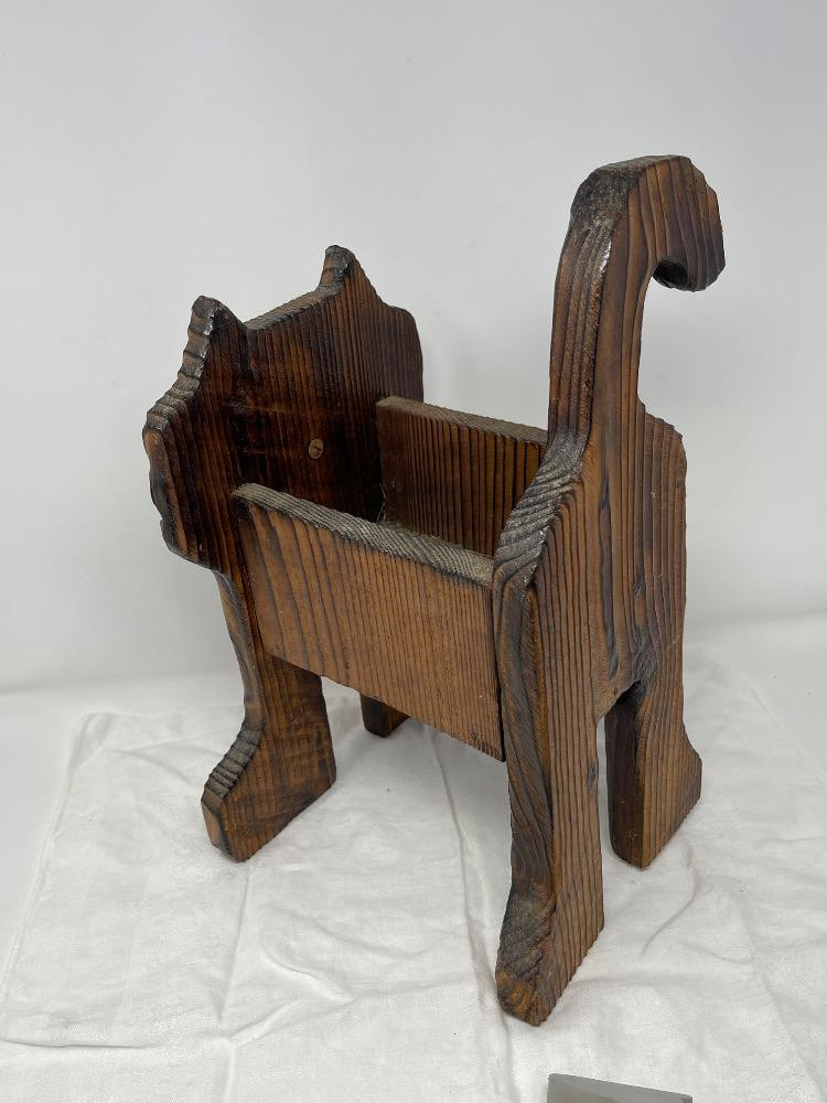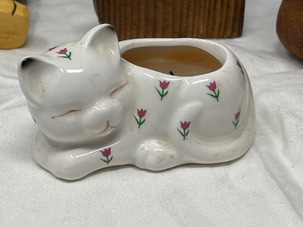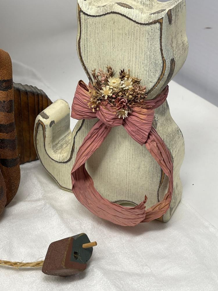 Hand crafted wooden cat planter measures 8.5”x9”x15” 8 additional cat figurines of wood, ceramic, fabric & glass.