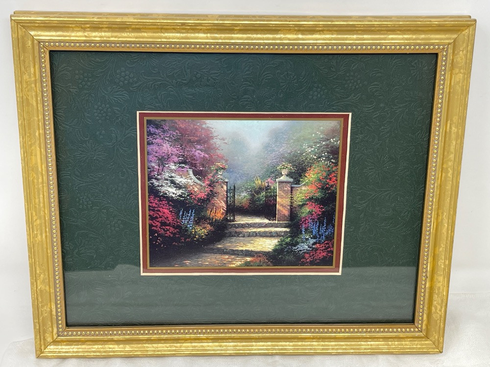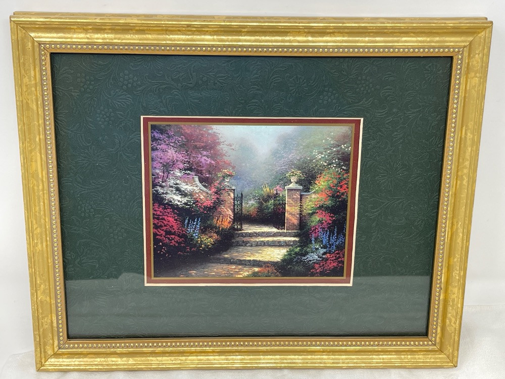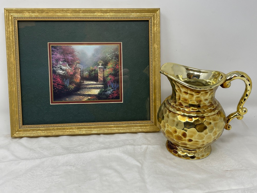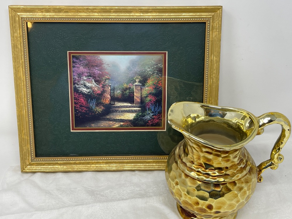 Thomas Kincaid "The Victorian Garden" framed lithograph measures 11.25“ x 9.25“ Matching Pitcher measures 6” tall.
