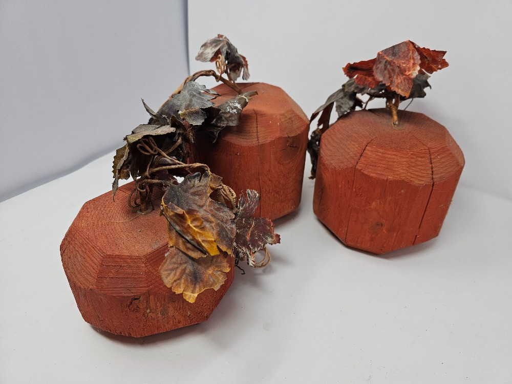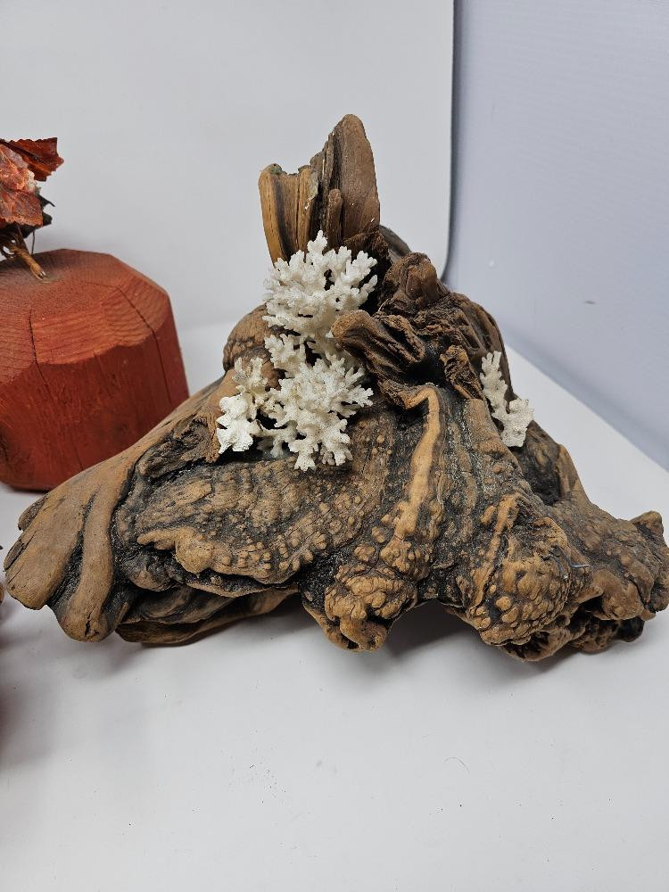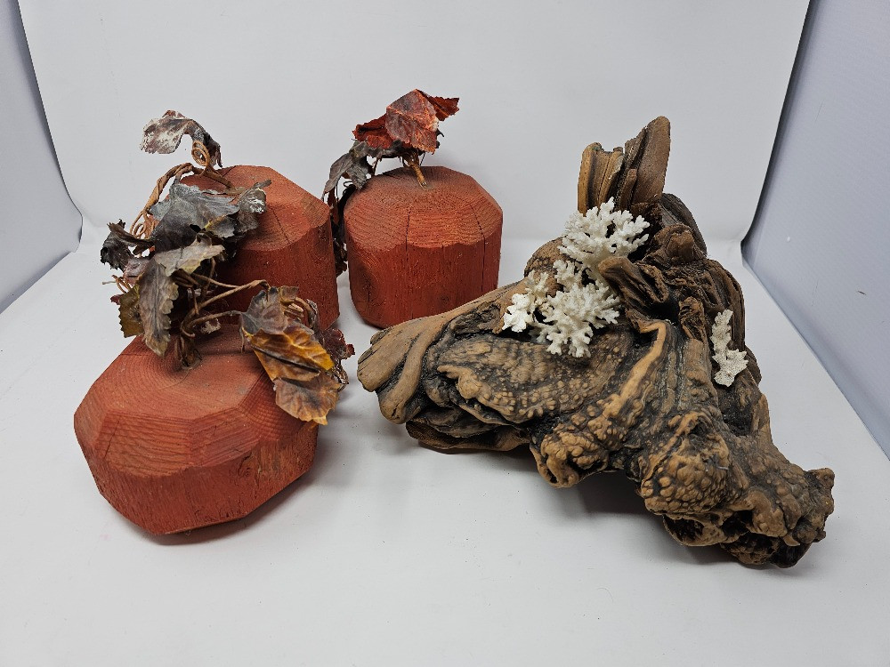Hand Made Wood Pumpkins & Burl Knot Wood With Coral. Pumpkins are approximately 6" diameter with varying heights. Burl knot is approximately 11"x9" and has coral pieces glued to the surface.