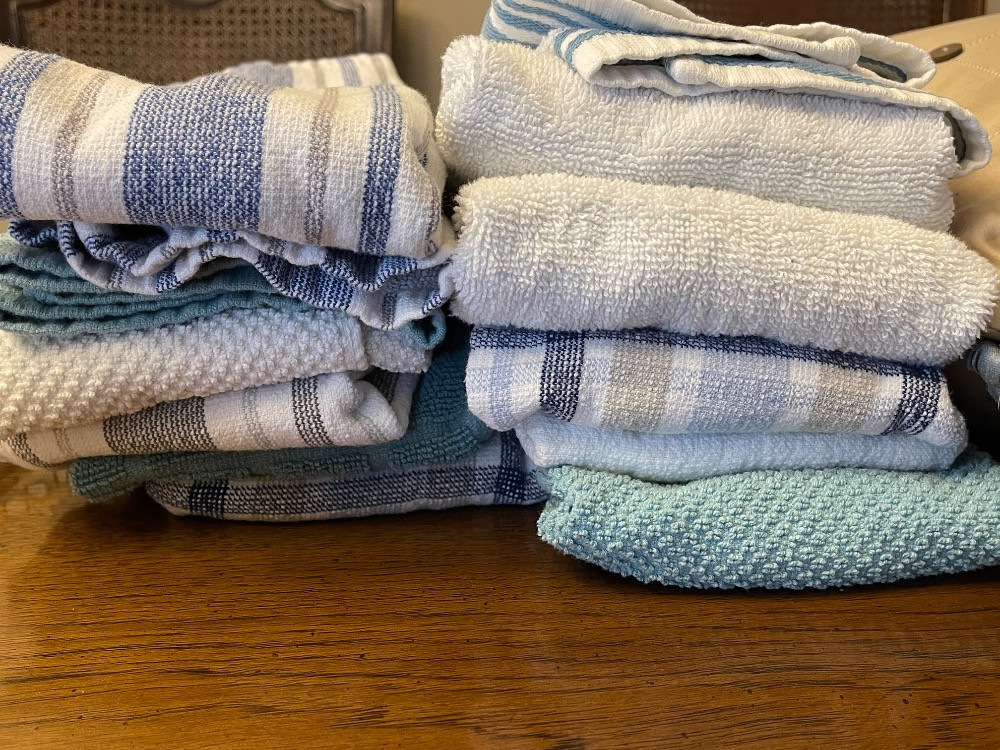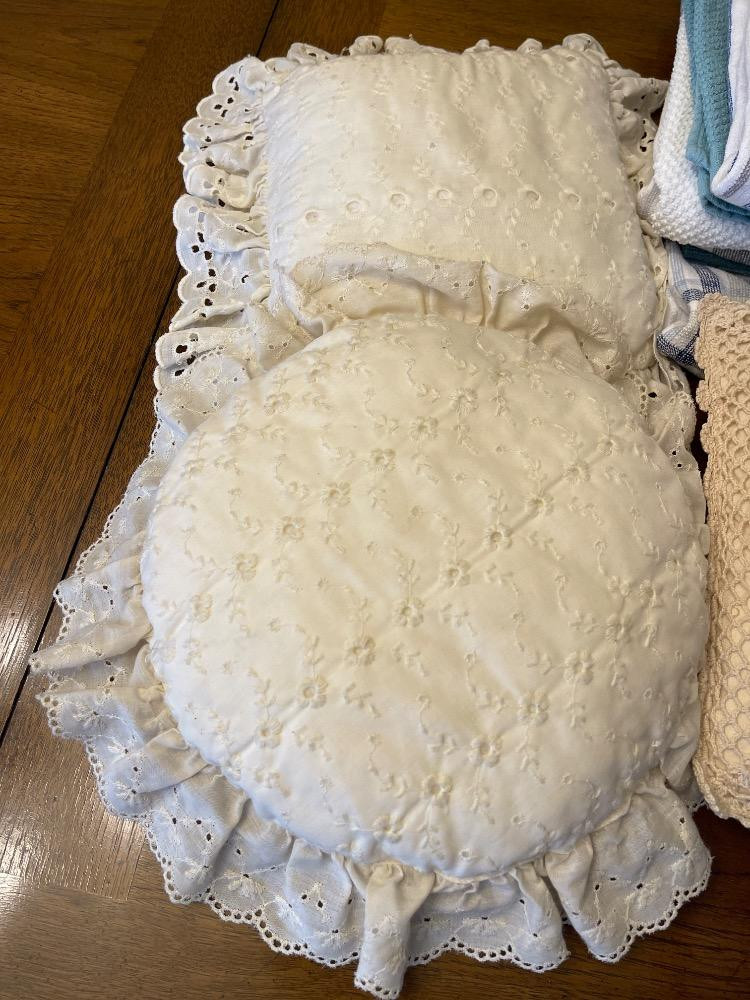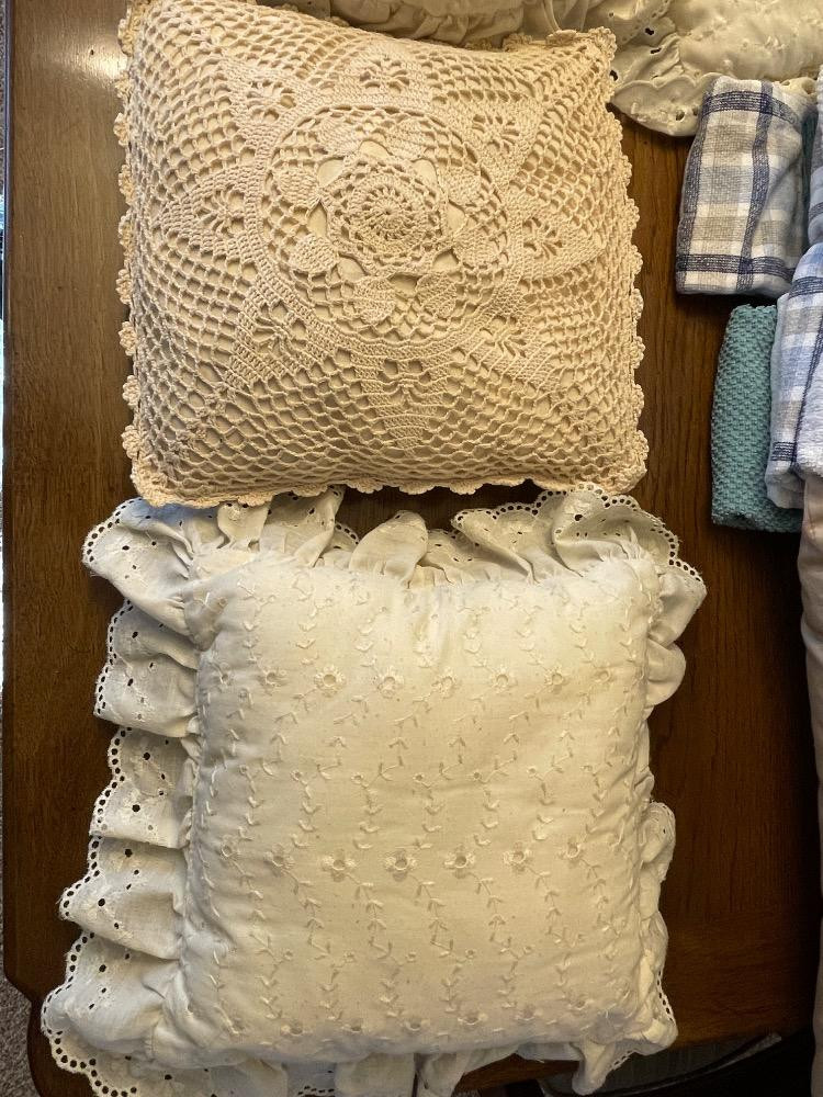 7 Pillows - 5 with crochet covers. One small square pillow did not make the photo shoot. Blue textured satin and cotton pillow with blue buttons. 13 hand towels lightly used.