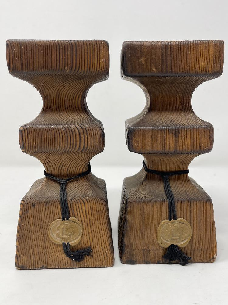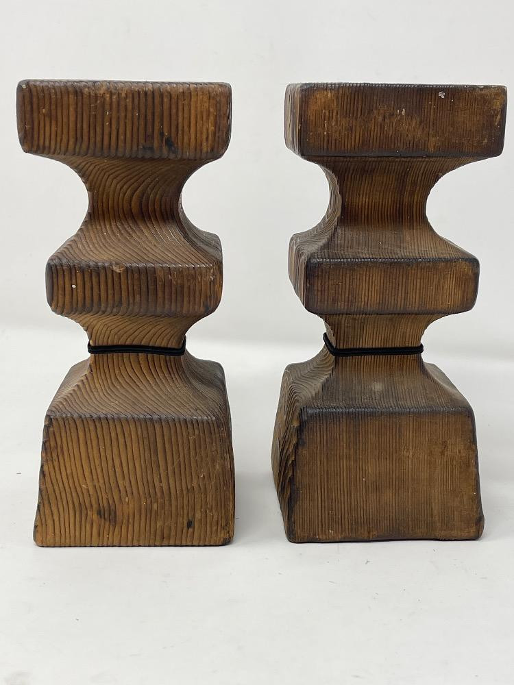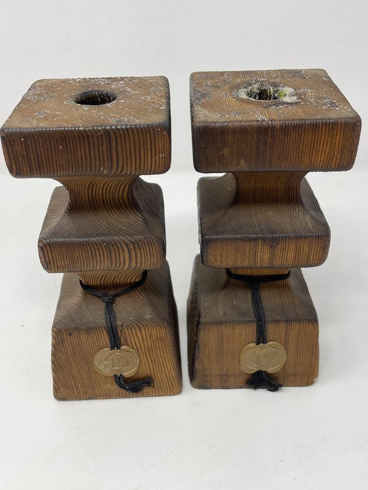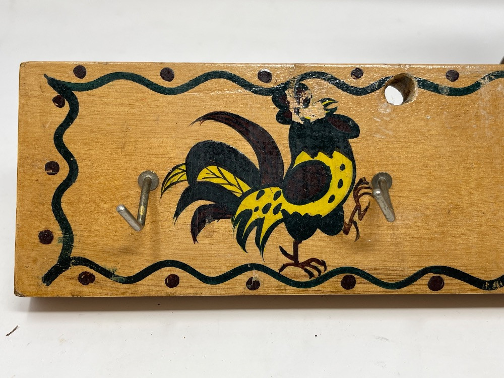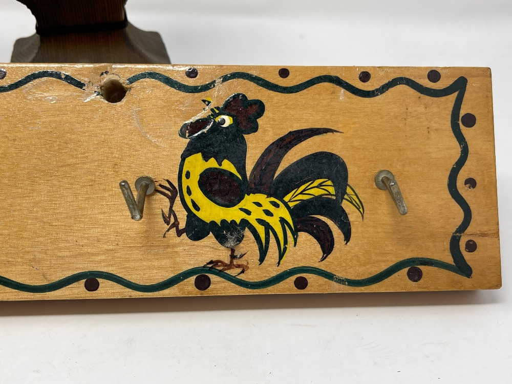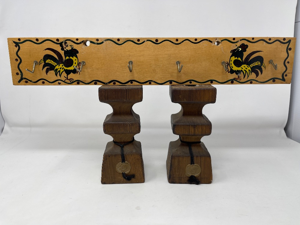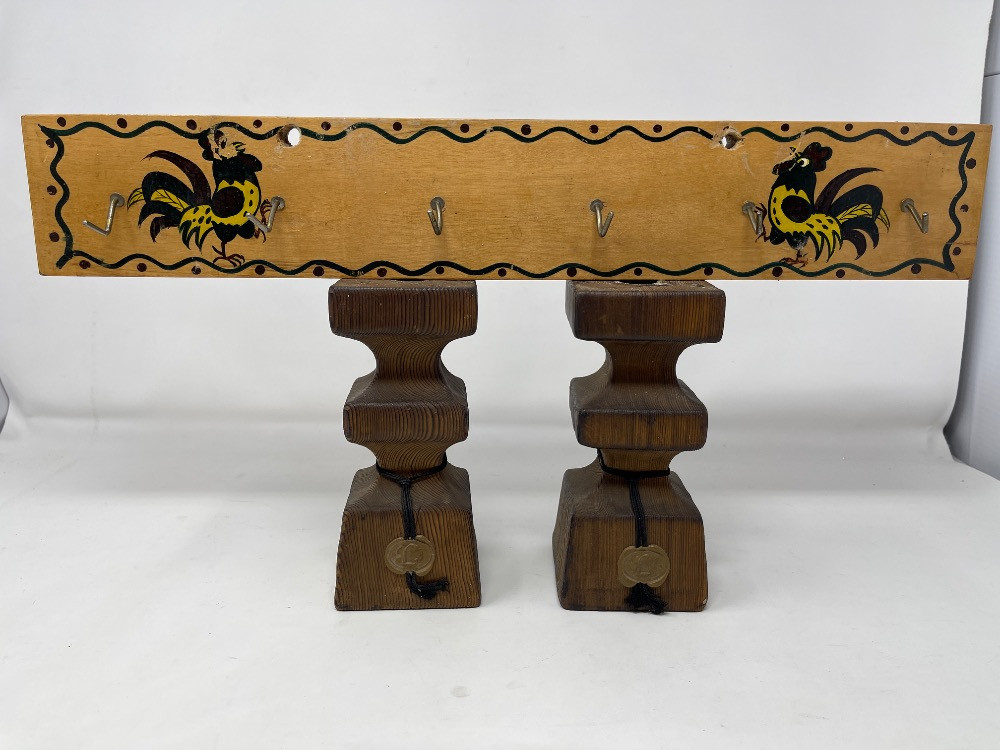 (2) Carved Wood Candle Sticks are 3”x3”x6.5” with a candle wax “L” stamp. Vintage Rooster Keyholder is 18.25”x3” made by Woodpecker Woodware.