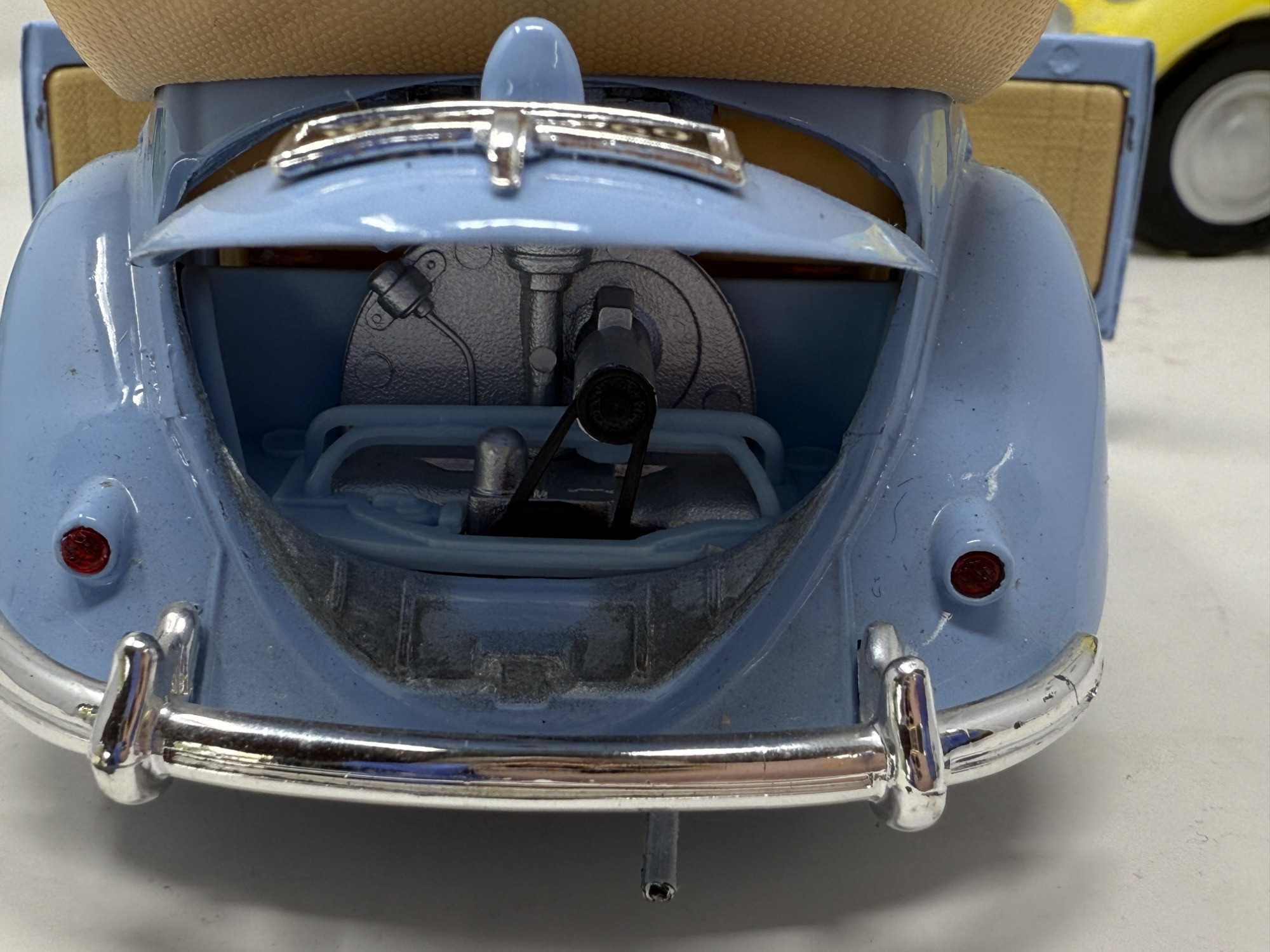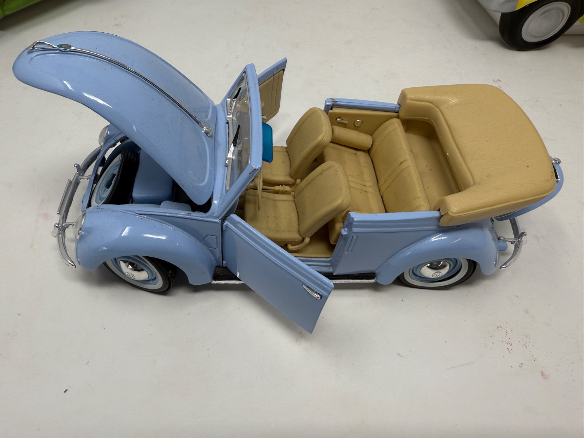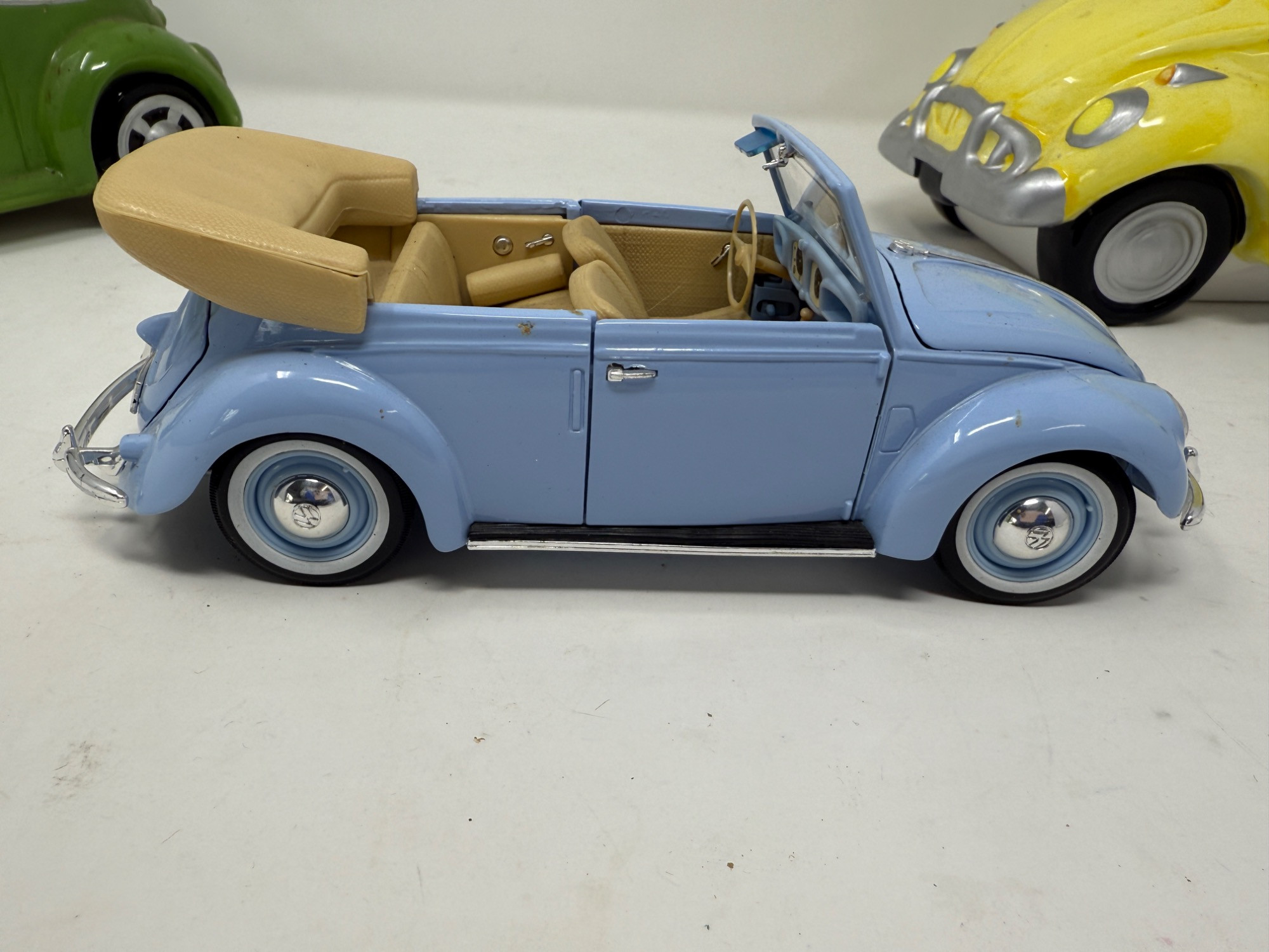 Maisto Baby Blue 1951 VW Convertible Bug 1/15 Scale Steering wheel turns wheels, bonnet and boot open, seats fold forward. 9” long Ceramic Yellow Bug with removable top Ceramic Green VW Bug On a Rope