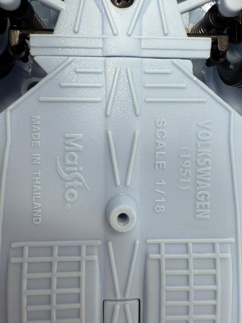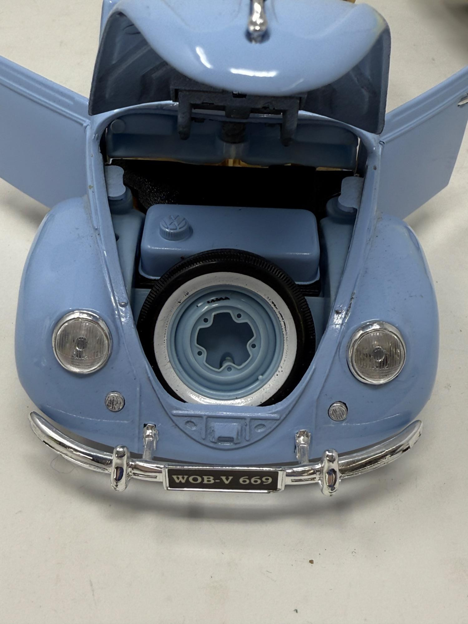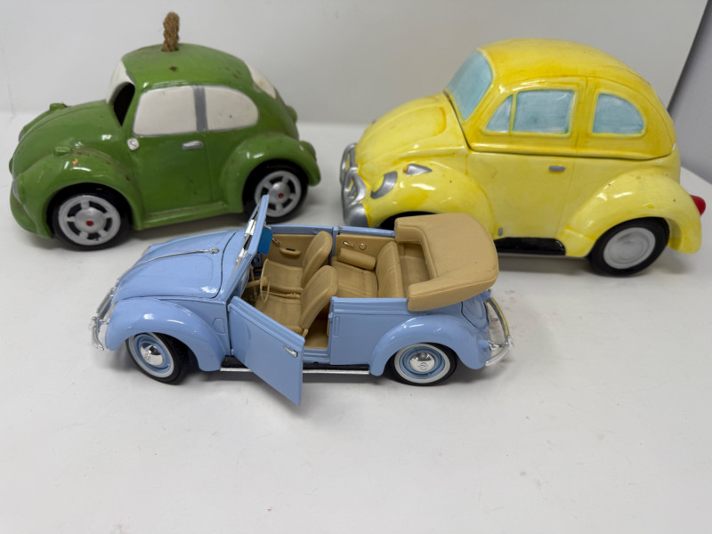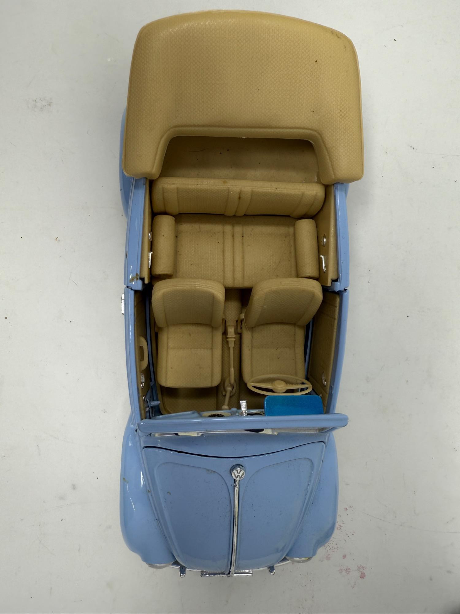 Maisto Baby Blue 1951 VW Convertible Bug 1/15 Scale Steering wheel turns wheels, bonnet and boot open, seats fold forward. 9” long Ceramic Yellow Bug with removable top Ceramic Green VW Bug On a Rope